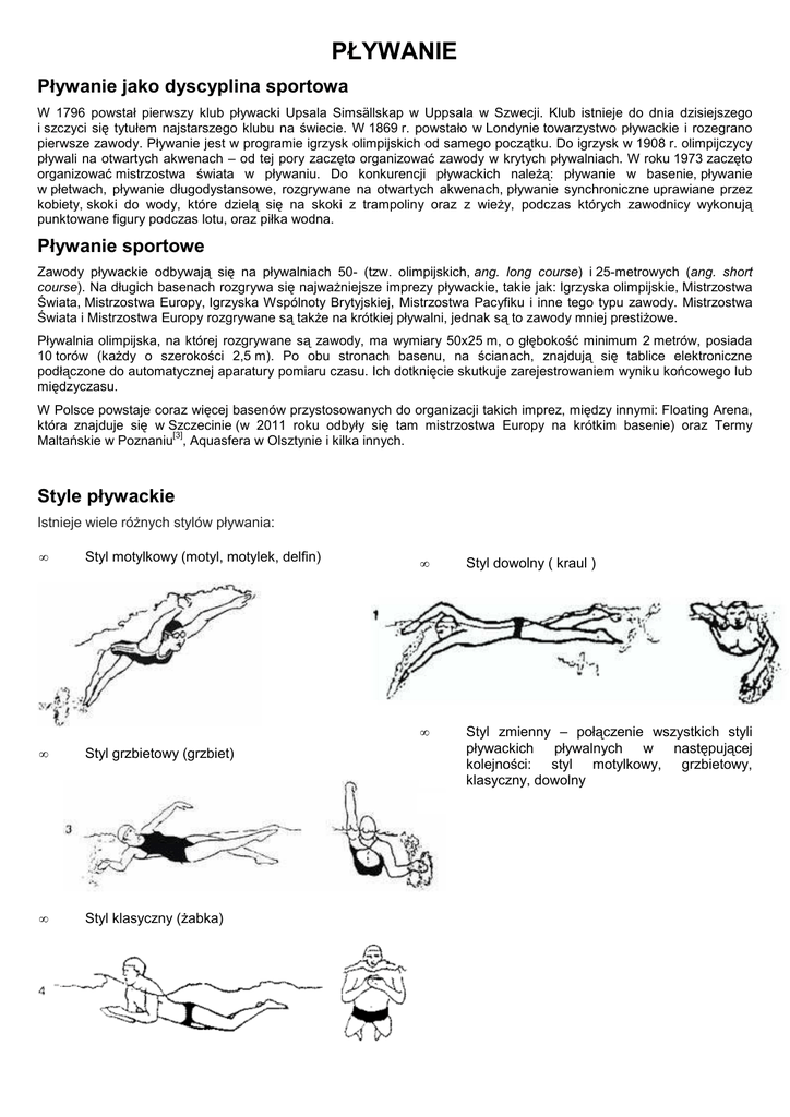 PŁYWANIE Pływanie jako dyscyplina sportowa W 1796 powstał pierwszy klub pływacki Upsala Simsällskap w Uppsala w Szwecji. Klub istnieje do dnia dzisiejszego i szczyci się tytułem najstarszego klubu na świecie. W 1869 r. powstało w Londynie towarzystwo pływackie i rozegrano pierwsze zawody. Pływanie jest w programie igrzysk olimpijskich od samego początku. Do igrzysk w 1908 r. olimpijczycy pływali na otwartych akwenach – od tej pory zaczęto organizować zawody w krytych pływalniach. W roku 1973 zaczęto organizować mistrzostwa świata w pływaniu. Do konkurencji pływackich należą: pływanie w basenie, pływanie w płetwach, pływanie długodystansowe, rozgrywane na otwartych akwenach, pływanie synchroniczne uprawiane przez kobiety, skoki do wody, które dzielą się na skoki z trampoliny oraz z wieży, podczas których zawodnicy wykonują punktowane figury podczas lotu, oraz piłka wodna. Pływanie sportowe Zawody pływackie odbywają się na pływalniach 50- (tzw. olimpijskich, ang. long course) i 25-metrowych (ang. short course). Na długich basenach rozgrywa się najważniejsze imprezy pływackie, takie jak: Igrzyska olimpijskie, Mistrzostwa Świata, Mistrzostwa Europy, Igrzyska Wspólnoty Brytyjskiej, Mistrzostwa Pacyfiku i inne tego typu zawody. Mistrzostwa Świata i Mistrzostwa Europy rozgrywane są także na krótkiej pływalni, jednak są to zawody mniej prestiżowe. Pływalnia olimpijska, na której rozgrywane są zawody, ma wymiary 50x25 m, o głębokość minimum 2 metrów, posiada 10 torów (każdy o szerokości 2,5 m). Po obu stronach basenu, na ścianach, znajdują się tablice elektroniczne podłączone do automatycznej aparatury pomiaru czasu. Ich dotknięcie skutkuje zarejestrowaniem wyniku końcowego lub międzyczasu. W Polsce powstaje coraz więcej basenów przystosowanych do organizacji takich imprez, między innymi: Floating Arena, która znajduje się w Szczecinie (w 2011 roku odbyły się tam mistrzostwa Europy na krótkim basenie) oraz Termy [3] Maltańskie w Poznaniu , Aquasfera w Olsztynie i kilka innych. Style pływackie Istnieje wiele różnych stylów pływania: • Styl motylkowy (motyl, motylek, delfin) • Styl grzbietowy (grzbiet) • Styl klasyczny (żabka) • Styl dowolny ( kraul ) • Styl zmienny – połączenie wszystkich styli pływackich pływalnych w następującej kolejności: styl motylkowy, grzbietowy, klasyczny, dowolny Konkurencje pływackie Pływacy rywalizują obecnie w 26 indywidualnych konkurencjach olimpijskich: • • • • • • • • • • • • • • 50 m stylem dowolnym kobiet i mężczyzn, 100 m stylem dowolnym kobiet i mężczyzn, 200 m stylem dowolnym kobiet i mężczyzn, 400 m stylem dowolnym kobiet i mężczyzn, 800 m stylem dowolnym kobiet, 1500 m stylem dowolnym mężczyzn, 100 m stylem motylkowym kobiet i mężczyzn, 200 m stylem motylkowym kobiet i mężczyzn, 100 m stylem grzbietowym kobiet i mężczyzn, 200 m stylem grzbietowym kobiet i mężczyzn, 100 m stylem klasycznym kobiet i mężczyzn, 200 m stylem klasycznym kobiet i mężczyzn, 200 m stylem zmiennym kobiet i mężczyzn, 400 m stylem zmiennym kobiet i mężczyzn, A także w 6 wyścigach sztafetowych: • • • 4 × 100 m stylem dowolnym kobiet i mężczyzn, 4 × 200 m stylem dowolnym kobiet i mężczyzn, 4 × 100 m stylem zmiennym kobiet i mężczyzn. Pływanie w Polsce Pierwsze mistrzostwa Polski w pływaniu odbyły się w Warszawie w 1929 r. 6 lat później Polacy wystartowali na Igrzyskach Olimpijskich w Berlinie. Do największych osiągnięć polskiego pływania zaliczano dwa rekordy świata na 100 m stylem klasycznym Marka Petrusewicza w 1953 i 1954 r. oraz jego srebrny medal zdobyty na mistrzostwach Europy. Po latach posuchy w 1980 r. pierwszy medal olimpijski wywalczyła Agnieszka Czopek. W drugiej połowie lat osiemdziesiątych duże sukcesy międzynarodowe odnotował Artur Wojdat, rekordzista świata na 400 m stylem dowolnym i medalista olimpijski w 1988. W ostatnich kilkunastu latach do światowych kronik pływackich wpisali się: Rafał Szukała – wicemistrz olimpijski w 1992 r. i mistrz świata w 1994 na 100 m stylem motylkowym, Alicja Pęczak – 3-krotna mistrzyni Europy na basenie 25 m w 1998 r., Otylia Jędrzejczak – 2-krotna mistrzyni świata na 200 m delfinem (2003, 2005), 5-krotna mistrzyni Europy w2000, 2002, 2004 i 2006 r. i była rekordzistka świata na 200 m stylem motylkowym, wreszcie trzykrotna medalistka olimpijska z igrzysk w Atenach, Paweł Korzeniowski – mistrz świata na 200 m delfinem z Montrealu w 2005 r., Mateusz Sawrymowicz i Przemysław Stańczyk – mistrzowie świata z Melbourne w 2007 r. Obecnie do najlepszych pływaków polskich zalicza się Radosław Kawęcki, Paweł Korzeniowski, Konrad Czerniak Najwięcej rekordów Polski należy do Otylii Jędrzejczak- 10 na długim basenie i 4 na krótkim. Polskie sukcesy Medaliści Igrzysk Olimpijskich • • • • • • Otylia Jędrzejczak, Ateny 2004, 200 m motylkowym, 2:06.05 Rafał Szukała, Barcelona 1992, 100 m motylkowym, 53.35 Otylia Jędrzejczak, Ateny 2004, 100 m motylkowym, 57.84 Otylia Jędrzejczak, Ateny 2004, 400 m dowolnym, 4:05.84 Agnieszka Czopek, Moskwa 1980, 400 m zmiennym, 4:48.17 Artur Wojdat, Seul 1988, 400 m dowolnym, 3:47.34 PŁYWANIE W NASZEJ SZKOLE Dyscyplina pływanie pojawiła się na dość krótko w naszej szkole już w 2008 roku gdzie do klasy II Lo trafiła trójka czołowych polskich pływaków Krzysztof Pielowski, Jarosław Krawczyk i Bartosz Hura. Po ukończeniu edukacji czekaliśmy kilka lat, by we wrześniu 2014 roku rozpocząć w ramach Szkoły Mistrzostwa Sportowego szkolenie młodzieży. Powstały dwie klasy - I na poziomie gimnazjalnej i I na poziomie Liceum. Jest to obecnie najmłodsza dyscyplina sportowa funkcjonująca w szkole. Pływanie to bardzo wymagający sport. Treningi odbywają się 11 razy w tygodniu i trwają od 2 do 3 godzin. Oprócz treningów w wodzie odbywają się treningi na lądzi
