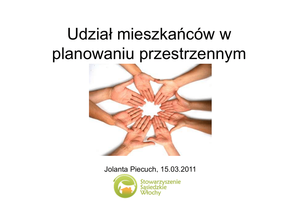 Udział mieszkańców w planowaniu przestrzennym Jolanta Piecuch, 15.03.2011 CZY KTOŚ NAD TYM PANUJE (I PLANUJE)? • • • • • • • Przeszkadza Ci w najbliższym otoczeniu chaos architektoniczny ? Rozwiązania komunikacyjne są beznadziejne? Masz dość agresywnych reklam? Nie ma żadnego żłobka ani przedszkola? Nie ma miejsca gdzie możesz pójść na spacer lub aktywnie wypocząć? Brakuje ci zieleni i estetycznych przestrzeni publicznych? Boisz się, że na sąsiedniej działce wyrośnie wielki biurowiec, który zasłoni ci świat? A MOŻE WŁAŚNIE PRZYGOTOWYWANY JEST PLAN ZAGOSPODAROWANIA PRZESTRZENNEGO ….. .I MOŻESZ ZŁOŻYĆ WNIOSKI by to ZMIENIĆ Sprawdź na BIP Miasta http://bip.warszawa.pl/Menu_przedmiotowe/ogloszenia/plany_zagospodarowania/default.htm JAK WYGLĄDA PLANOWANIE ZAGOSPODAROWANIA PRZESTRZENNEGO W DRODZE PLANU MIEJSCOWEGO? Studium uwarunkowań i kierunków zagospodarowania przestrzennego m. st. Warszawy (polityka przestrzenna miasta,wytyczne dla planów miejscowych) Miejscowe plany zagospodarowania przestrzennego (tworzone w procedurze uwzględniającej udział mieszkańców) ( prawo lokalne regulujące możliwe zmiany i sposób użytkowania przestrzeni) Decyzja pozwolenia na budowę Sprawdź art.9 i nast..,art..14 i nast.., Upizp oraz art… upb JAK WYGLĄDA PLANOWANIE ZAGOSPODAROWANIA PRZESTRZENNEGO, GDY BRAKUJE PLANU MIEJSCOWEGO ? Studium uwarunkowań i kierunków zagospodarowania przestrzennego m. st. Warszawy (polityka przestrzenna miasta, wytyczne dla planów miejscowych) Indywidualne decyzje administracyjne wydawane przez zarząd dzielnicy na wniosek potencjalnych inwestorów (w oparciu o zasadę dobrego sąsiedztwa), w tym: Decyzje o ustaleniu lokalizacji inwestycji celu publicznego (wymienione w art. 6 ustawy o gospodarce nieruchomościami) Decyzje o warunkach zabudowy Decyzja pozwolenia na budowę Sprawdź art. 50 i nast.,Art..59 i nast.. Upizp oraz art… upb PLAN MIEJSCOWY • Sporządza się w celu ustalenia przeznaczenia terenów, w tym pod inwestycje publiczne, oraz w celu określenia sposobów zagospodarowania terenów zabudowy ; • Plan miejscowy jest aktem prawa miejscowego i wiąże zarówno organy władzy jak i osoby prywatne, realizujące zamierzenia przestrzenne; • Ustalenia miejscowego planu zagospodarowania przestrzennego kształtują, wraz z innymi przepisami, sposób wykonywania prawa własności nieruchomości Sprawdź art..14, art..6 upizp PROCEDURA UCHWALANIA PLANU Podjęcie uchwały o przystąpieniu do sporządzenia planu Na zielono zaznaczono etapy na których Mieszkańcy mogą być aktywni w procesie sporządzania planu PRZYJMOWANIE WNIOSKÓW Przygotowanie projektu, uzgadnianie projektu z właściwymi urzędami i przyjmowanie opinii ustawowych WYŁOŻENIE PUBLICZNE I PRZYJMOWANIE UWAG Rozpatrzenie uwag przez prezydenta/burmistrza gminy i przedstawienie radzie gminy projektu planu wraz z nieuwzględnionymi uwagami (do rozpatrzenia i zatwierdzenia) Rozpatrzenie uwag nieuwzględnionych przez prezydenta I ZATWIERDZENIE PLANU CZEGO MOŻE DOTYCZYĆ WNIOSEK DO PLANU MIEJSCOWEGO? W planie miejscowym określa się obowiązkowo między innymi: • • • • • zasady kształtowania zabudowy oraz wskaźniki zagospodarowania terenu, maksymalną i minimalną intensywność zabudowy, minimalny udział procentowy powierzchni biologicznie czynnej , maksymalną wysokość zabudowy, minimalną liczbę miejsc do parkowania i sposób ich realizacji oraz linie zabudowy i gabaryty obiektów; szczegółowe zasady i warunki scalania i podziału nieruchomości objętych planem miejscowym; szczególne warunki zagospodarowania terenów oraz ograniczenia w ich użytkowaniu, w tym zakaz zabudowy; zasady modernizacji, rozbudowy i budowy systemów komunikacji i infrastruktury technicznej; stawki procentowe, na podstawie których ustala się opłatę, o której mowa w art. 36 ust. 4. W planie miejscowym określa się w zależności od potrzeb: 1) granice obszarów wymagających przeprowadzenia scaleń i podziałów nieruchomości; 2) granice obszarów rehabilitacji istniejącej zabudowy i infrastruktury technicznej; 3) granice obszarów wymagających przekształceń lub rekultywacji; 4) granice terenów pod budowę obiektów handlowych, o których mowa w art. 10 ust. 2 pkt 8; 4a) granice terenów rozmieszczenia inwestycji celu publicznego o znaczeniu lokalnym; 4b) granice terenów inwestycji celu publicznego o znaczeniu ponadlokalnym, 5) granice terenów rekreacyjno-wypoczynkowych oraz terenów służących organizacji imprez masowych; 6) granice pomników zagłady oraz ich stref ochronnych, 8) sposób usytuowania obiektów budowlanych w stosunku do dróg i innych terenów publicznie dostępnych oraz do granic przyległych nieruchomości, kolorystykę obiektów budowlanych oraz pokrycie dachów; 9) zasady i warunki sytuowania obiektów małej architektury, tablic i urządzeń reklamowych oraz ogrodzeń, ich gabaryty, standardy jakościowe oraz rodzaje materiałów budowlanych, z jakich mogą być wykonane; 10) minimalną powierzchnię nowo wydzielonych działek budowlanych. Sprawdź Art.15 upizp Przykłady wskaźników Wśród wskaźników wymaganych w planach miejscowych są: – parametry i wskaźniki kształtowania zabudowy – parametry zagospodarowania terenu, – gabaryty obiektów – wskaźniki intensywności zabudowy; Każdy plan ma swoje definicje • Wskaźnik maksymalnej intensywności zabudowy na działce to stosunek sumy powierzchni całkowitej wszystkich kondygnacji naziemnych wszystkich budynków zlokalizowanych na jednej działce budowlanej do powierzchni działki budowlanej • Minimalny wskaźnik powierzchni biologicznie czynnej, (przy czym różne są definicje powierzchni czynnej biologicznie, czasem wliczane są części zielone na dachu) • Maksymalna powierzchnia zabudowy na działce - wielkość powierzchni zabudowy w stosunku do powierzchni działki (przykład: wskaźnik wynosi 40% to znaczy że na działce o powierzc