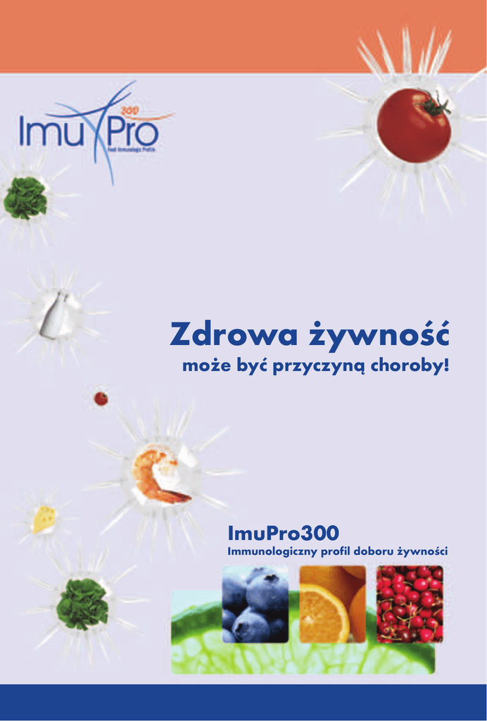 Zdrowa żywność może być przyczyną choroby! ImuPro300 Immunologiczny profil doboru żywności Wprowadzenie Zdrowe odżywianie to jeden z najważniejszych celów w naszym życiu Czy podejrzewasz, że również w Twoim przypadku alergia na pokarm typu III może być przyczyną pro− blemów z nadwagą lub innych przewlekłych dolegliwości? Niniejsza broszura w prosty i przystępny sposób przed− stawia skomplikowany i bardzo poważny problem jakim jest alergia na pokarm typu III. Chcemy pokazać nowy sposób radzenia sobie z chorobami przewlekłymi (np. schorzeniami skóry, dolegliwościami żołądkowo−jelitowymi). Dzięki zmianie sposobu odżywia− nia możesz pokonać wszelkie dolegliwości, z którymi walczysz od lat. Prosimy zatem zapoznać się z przyczynami powodującymi, że określone produkty spo− żywcze mogą skrajnie negatywnie wpływać na nasze zdrowie i samopoczucie. Należy sobie uświadomić, że receptą na zdrowsze życie bez nadwagi i ewentualnych chorób przewlekłych może być po prostu unikanie lub różnorodność określonych artykułów spożywczych. Należy też pamiętać, że ulubione nawyki żywieniowe mogą okazać się niebezpiecznym uzależnieniem od szkodliwych artykułów spo− żywczych, które dla wielu są całkowicie nie− szkodliwe, ale w przypadku konkretnej osoby mogą być „narkotykiem” wywołującym chorobę. W żadnym wypadku nie należy zniechęcać się wynikiem badania i związaną z tym koniecznoś− cią rezygnacji z określonych produktów. Test ImuPro300 w krótkim czasie gwarantuje bo− wiem wyraźną poprawę samopoczucia i stanu zdrowia pacjenta. Alergie na pokarm typu III nie trwają wiecz− nie, z biegiem czasu mogą zaniknąć. Może się więc zdarzyć, że po dłuższym okresie rezy− gnacji z określonego produktu pacjent będzie mógł bez problemu ponownie włączyć go do jadłospisu. Należy bezzwłocznie skontaktować się ze swoim leka− rzem i przeprowadzić test ImuPro300. Zanim uwierzysz, że nic Ci już nie pomoże, powinieneś upewnić się i skon− trolować, czy nie cierpisz z tego powodu, że od lat w sposób niezamierzony odżywiasz się nieprawidłowo, szkodząc tym samym swojemu organizmowi. A teraz zapraszamy do dalszej lektury niniejszej broszury, która okaże się dla Ciebie wskazówką ku zdrowszej przyszłości. Choroby przewlekłe a test ImuPro300 Ocena przeprowadzonych badań dostarcza wielu interesujących informacji o wskaźniku skuteczności leczenia określonych chorób. Objawy Ustąpienie Poprawa Łącznie objawu stanu Bóle głowy (92) Migrena (46) Zawroty głowy (54) Spuchnięte powieki (47) Zaczerwienienie oczu (31) Łzawienie oczu (42) Trudności w oddychaniu (40) Sucha skóra (100) Łuszczyca (23) Trądzik (26) Zaczerwienienie skóry (39) Świąd skóry (61) Mdłości (42) Uczucie pełności (110) Wzdęcia (146) Odbijania (76) Biegunka (49) Zaparcia (68) Bóle kręgosłupa (126) Bóle mięśni (60) Bóle stawów (113) Zwyrodnieniowe zmiany stawów (62) Sztywność poranna (6) Obrzęki (48) Wyczerpanie (100) Uczucie ciągłego zmęczenie (95) Skoki nastrojów (78) Depresje (36) Nadaktywność (19) Agresje (28) Stany lękowe (44) Osłabienie koncentracji (95) 23.9 % 26.1 % 29.6 % 21.3 % 35.5 % 35.7 % 17.5 % 10.0 % 30.4 % 7.7 % 20.5 % 32.8 % 42.9 % 59.1 % 44.5 % 51.3 % 44.9 % 33.8 % 6.3 % 10.0 % 13.3 % 0.0 % 13.3 % 18.8 % 25.0 % 24.2 % 12.8 % 38.9 % 26.3 % 25.0 % 29.5 % 13.7 % 62.0 % 58.7 % 55.6 % 70.2 % 32.3 % 47.6 % 65.0 % 51.0 % 39.1 % 50.0 % 59.0 % 52.5 % 54.8 % 35.5 % 45.9 % 39.5 % 44.9 % 55.9 % 46.8 % 61.7 % 64.6 % 50.0 % 63.3 % 56.3 % 59.0 % 56.8 % 69.2 % 55.6 % 57.9 % 57.1 % 56.8 % 58.9 % 85.9 % 84.8 % 85.2 % 91.5 % 67.7 % 83.3 % 82.5 % 61.0 % 69.6 % 57.7 % 79.5 % 85.2 % 97.6 % 94.5 % 90.4 % 90.8 % 89.8 % 89.7 % 53.2 % 71.7 % 77.9 % 50.0 % 76.7 % 75.0 % 84.0 % 81.1 % 82.1 % 94.4 % 84.2 % 82.1 % 86.4 % 72.6 % Bez zmian 14.1 % 15.2 % 14.8 % 8.5 % 32.3 % 16.7 % 17.5 % 39.0 % 30.4 % 42.3 % 20.5 % 14.8 % 2.4 % 5.5 % 9.6 % 9.2 % 10.2 % 10.3 % 46.8 % 28.3 % 22.1 % 50.0 % 23.3 % 25.0 % 16.0% 18.9 % 17.9 % 5.6 % 15.8 % 17.9 % 13.6 % 27.4 % Definicja alergii na pokarm typu III Czy mogę rozpoznać alergię na pokarm po smaku lub wyczuć ją w jakiś sposób? Alergii na pokarm typu III nie należy mylić z „klasyczną“ alergią (alergią typu I). Typową cechą alergii typu I jest bardzo szybka i zazwyczaj silna reakcja, taka jak obrzęk języka, jamy gardła i krtani, trudności w oddychaniu, ataki kichania lub wysypki skórne. Reakcja następuje z reguły w bardzo krótkim odstępie czasu po spożyciu danego produktu spożywczego. W związku z tym alergię typu I można bardzo łatwo roz− poznać. Klasyczne alergie pokarmowe występują stosun− kowo rzadko a odsetek ludności, u których stwierdza się objawy tego typu alergii jest niewielki. Test ImuPro300 nie wykrywa klasycznych alergii. Wielu ludzi cierpi na alergię pokarmową typu III, nie wiedząc o tym. Zupełnie inaczej wygląda w przypadku alergii pokarmo− wej typu III. Występuje ona bardzo często i potrzebuje czasami bardzo dużo czasu by rozwinąć się w organizmie ludzkim. W przypadku alergii pokarmowej typu III możliwe jest jej przeniesienie poprzez mleko matki. Szczególnym utrudnieniem w przeciwieństwie do alergii typu I jest zróżnicowanie objawów alergicznych, które pojawiają się od kilku godzin do kilku dni po spożyciu danego pro− duktu spożywczego. Tak więc może i u Ciebie występują reakcje alergiczne na przykład na sałatę, pomidory, ziemniaki, jogurt, mleko itd. Reakcje alergiczne obciążają układ odpornościowy i wpływają na procesy przemiany materii, wywołując pro− blemy zdrowotne. Niestety, alergii na pokarm typu III nie można wyczuć przez zapach, smak ani w żaden inny sposób. Dlatego często nie udaje się rozpoznać, że przyczyną problemów zdrowotnych jest pożywienie. Test ImuPro300 stwierdza, czy pacjent cierpi na alergię pokarmową typu III. W prz
