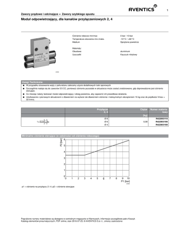 1 Zawory prądowe i odcinające ► Zawory szybkiego spustu Moduł odpowietrzający, dla kanałów przyłączeniowych 2, 4 Ciśnienie robocze min/max 0 bar / 10 bar Temperatura otoczenia min./maks. -10°C / +60°C Medium Sprężone powietrze Materiały: Obudowa aluminium Uszczelki Kauczuk nitrylowy 24505 Uwagi Techniczne ■ W przypadku stosowania węży z poliuretanu zalecamy użycie dodatkowych tulei oporowych. ■ Szczególnie nadaje się do zaworów 5/3 CC, ponieważ ciśnienie pozostałe w aktuatorze może zostać zredukowane, gdy doprowadzone jest ciśnienie sterujące. ■ Co miesiąc należy testować moduł odpowietrzający i obieg powietrza, aby zapewnić ich prawidłowe działanie. ■ Użytkowanie z pionowymi aktuatorami z dławieniem na wylocie lub dławieniem ciśnienia i maksymalnym obciążeniem 15 kg oraz do prędkości Vmax < 33 mm/s. Przyłącze 2, 4 4 Ciężar [kg] Ø8 2 R422003118 Ø6 10 4 0,08 Ø4 2 P2 [bar] 6 5 4 3 2 1 1 2 3 4 5 6 R422003186 R422003188 Minimalne ciśnienie sterujące (w zależności od ciśnienia roboczego) 0 0 Numer materiałowy 7 8 9 10 P1 [bar] 23483 p1 = ciśnienie na przyłączu 2 i 4; p2 = ciśnienie sterujące Pogrubione numery materiałowe są dostępne w centralnym magazynie w Niemczech, informacje szczegółowe patrz Koszyk Katalog elementów pneumatycznych, PDF online, stan 2016-07-25, © AVENTICS S.à r.l., zmiany zastrzeżone 2 Zawory prądowe i odcinające ► Zawory szybkiego spustu Moduł odpowietrzający, dla kanałów przyłączeniowych 2, 4 Rozmiary 35 21,2 17,35 12,3 12,5 12,5 52 Ø6,2 Ø4 Ø* Ø* 31,6 A B 24202 Numer materiałowy Ø* 2 (Nl/ 4 (Nl/ A B Ciężar kg R422003118 8 1080 1400 46 58 R422003186 6 720 790 42 50 0,08 0,08 R422003188 4 280 300 38 42 0,08 Pogrubione numery materiałowe są dostępne w centralnym magazynie w Niemczech, informacje szczegółowe patrz Koszyk Katalog elementów pneumatycznych, PDF online, stan 2016-07-25, © AVENTICS S.à r.l., zmiany zastrzeżone