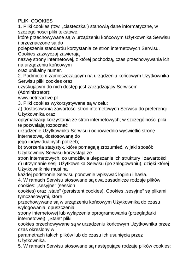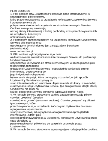 PLIKI COOKIES 1. Pliki cookies (tzw. „ciasteczka”) stanowią dane informatyczne, w szczególności pliki tekstowe, które przechowywane są w urządzeniu końcowym Użytkownika Serwisu i przeznaczone są do polepszenia standardu korzystania ze stron internetowych Serwisu. Cookies zazwyczaj zawierają nazwę strony internetowej, z której pochodzą, czas przechowywania ich na urządzeniu końcowym oraz unikalny numer. 2. Podmiotem zamieszczającym na urządzeniu końcowym Użytkownika Serwisu pliki cookies oraz uzyskującym do nich dostęp jest zarządzający Serwisem (Administrator): www.netreactive.pl 3. Pliki cookies wykorzystywane są w celu: a) dostosowania zawartości stron internetowych Serwisu do preferencji Użytkownika oraz optymalizacji korzystania ze stron internetowych; w szczególności pliki te pozwalają rozpoznać urządzenie Użytkownika Serwisu i odpowiednio wyświetlić stronę internetową, dostosowaną do jego indywidualnych potrzeb; b) tworzenia statystyk, które pomagają zrozumieć, w jaki sposób Użytkownicy Serwisu korzystają ze stron internetowych, co umożliwia ulepszanie ich struktury i zawartości; c) utrzymanie sesji Użytkownika Serwisu (po zalogowaniu), dzięki której Użytkownik nie musi na każdej podstronie Serwisu ponownie wpisywać loginu i hasła. 4. W ramach Serwisu stosowane są dwa zasadnicze rodzaje plików cookies: „sesyjne” (session cookies) oraz „stałe” (persistent cookies). Cookies „sesyjne” są plikami tymczasowymi, które przechowywane są w urządzeniu końcowym Użytkownika do czasu wylogowania, opuszczenia strony internetowej lub wyłączenia oprogramowania (przeglądarki internetowej). „Stałe” pliki cookies przechowywane są w urządzeniu końcowym Użytkownika przez czas określony w parametrach takich plików lub do czasu ich usunięcia przez Użytkownika. 5. W ramach Serwisu stosowane są następujące rodzaje plików cookies: a) „niezbędne” pliki cookies, które umożliwiają korzystanie z usług dostępnych w ramach strony internetowej, np. uwierzytelniające pliki cookies wykorzystywane do usług wymagających uwierzytelniania w ramach strony internetowej, b) „funkcjonalne” pliki cookies, które umożliwiają „zapamiętanie” wybranych przez użytkownika strony internetowej ustawień i personalizację interfejsu, np. w zakresie wybranego języka lub regionu, rozmiaru czcionki, wyglądu strony internetowej itp. 6. Domyślne ustawienia oprogramowań służących do przeglądania stron internetowych (przeglądarek internetowych) dopuszczają najczęściej przechowywanie plików cookies w urządzeniu końcowym Użytkownika. Użytkownicy Serwisu mogą dokonać w każdym czasie zmiany ustawień swojej przeglądarki dotyczących plików cookies. Ustawienia te mogą zostać zmienione w szczególności w taki sposób, aby blokować automatyczną obsługę plików cookies w ustawieniach przeglądarki internetowej bądź informować o ich każdorazowym zamieszczeniu w urządzeniu Użytkownika Serwisu. 7. Poniżej Administrator opisuje, jak można zmienić ustawienia cookies w najpopularniejszych przeglądarkach internetowych: Internet Explorer: 1. Otwórz program Internet Explorer, klikając przycisk Start, a następnie klikając polecenie Internet Explorer. 2. Kliknij przycisk Narzędzia, a następnie kliknij polecenie Opcje internetowe. 3. Kliknij kartę Prywatność, a następnie w obszarze Ustawienia przesuń suwak do najwyższego położenia, aby zablokować wszystkie pliki cookies, lub do najniższego położenia, aby zezwolić na wszystkie pliki cookies, a następnie kliknij przycisk OK Chrome: 1. Kliknij menu Chrome na pasku narzędzi przeglądarki. 2. Wybierz Ustawienia. 3. Kliknij Pokaż ustawienia zaawansowane. 4. W sekcji „Prywatność” kliknij przycisk Ustawienia treści. 5. W sekcji „Pliki cookies” możesz zmienić ustawienia plików cookies. Firefox: 1. Na górze okna Firefoksa naciśnij przycisk Firefox, (w systemie Windows XP kliknij menu Narzędzia) i wybierz Opcje. 2. Wybierz panel Prywatność. 3. Z menu rozwijanego elementu Program Firefox: wybierz opcję: będzie używał ustawień historii użytkownika. 4. Zaznacz Akceptuj ciasteczka, by włączyć, odznacz, by wyłączyć obsługę ciasteczek. Opera: 1. Przejdź do zakładki Narzędzia w górnym menu Opery i z rozwijanego menu wybierz Preferencje. 2. W okienku, które się pojawi przejdź do zakładki Zaawansowane, z menu po lewej stronie wybierz Ciasteczka i zmień ustawienia plików cookies. 8. Administrator informuje, że w razie problemów ze zmianą ustawień plików cookies, najlepiej skorzystać z informacji znajdujących się na stronie internetowej producenta danego programu. 9. Jakiekolwiek pytania dotyczące powyższej polityki prywatności prosimy kierować na adres: Biuro MTPolska ul. Makowska 95 04-307 Warszawa tel.: 022 529 39 00/50 fax.: 022 529 39 30