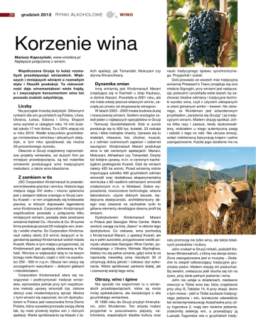26 grudzień 2012 R YNKI A LKOHOLOWE WINO Korzenie wina Mariusz Kapczyński, www.vinisfera.pl Najlepsze połączenia z winem. Współczesna Gruzja to kolaż rozmaitych przedsięwzięć winiarskich. Większych i mniejszych winiarni o rozmaitym stylu i filozofii produkcji. Ta różnorodność daje winomaniakowi wiele frajdy, a i zwyczajnym konsumentom wina też pozwala znaleźć satysfakcję. Liczby Na początek troszkę statystyki. Głównymi rynkami dla win gruzińskich są Polska, Litwa, Ukraina, Łotwa, Estonia i Chiny. Eksport wina wyniósł w ubiegłym roku 19 mln butelek (około 17 mln litrów). To o 30% więcej niż w roku 2010. Wedle szacunków gruzińskiego ministerstwa rolnictwa i aktualnych statystyk, w tym roku spodziewać się można 20-procentowego wzrostu. Obecnie w Gruzji znajdziemy najrozmaitsze projekty winiarskie, od dużych firm po mniejsze przedsięwzięcia, są też maleńkie winiarenki produkujące wino tradycyjnymi metodami, a także wina klasztorne. Z zamkiem w tle JSC Corporation Kindzmarauli to prawdziwie królewskie piwnice i winnice. Historia tego miejsca sięga XVI wieku i mocno spleciona jest z dziejami dobrze znanego w Gruzji zamku Kvareli – w nim znajdowały się królewskie piwnice, w których dojrzewało legendarne wino Kindzmarauli. Corporation Kindzmarauli współcześnie powstała z połączenia kilku mniejszych winiarni, posiada dwie siostrzane winiarnie Kakheti Co. i Koncho & Co. W sumie firma produkuje ponad 20 rodzajów win, brandy i wódki chacha. Do Corporation Kindzmarauli należy około 2/3 winnic leżących w legendarnej apelacji Kindzmarauli wokół miasta Kvareli. Warto w tym miejscu przypomnieć, że Kindzmarauli jest apelacją ulokowaną w Kahetii. Winnice w większości leżą tu na lewym brzegu rzeki Alazani, część z nich na wysokości 250 - 500 m n.p.m. Obszar ten cieszy się szczególnymi warunkami – dobrymi glebami i mikroklimatem. Corporation Kindzmarauli stara się nawiązywać i podtrzymywać tradycje winiarskie, wprowadza jednak przy tym współczesne metody uprawy winorośli (np. zielone zbiory) oraz modernistyczny sprzęt. Można z tymi winami się zapoznać, bo ich dystrybutorem w Polsce jest rzeszowska firma Dioniz Polska, która wyselekcjonowała swoją ofertę tak, by mieć przekrój stylów win z różnych apelacji. Warte spróbowania są klasyki z ta- kich apelacji, jak Tsinandali, Mukuzani czy słynna Khvanchkara. Dynamika zmian Inną winiarnią jest Kindzmarauli Marani znajdująca się w Kachetii u stóp Kaukazu, w dolinie Alazani. Powstała w 2001 roku, ale nie miała wtedy jeszcze własnych winnic, zaczęła po prostu od skupowania winogron. W latach 2003 - 2005 trwała budowa dużej i nowoczesnej winiarni. Szefem enologów został jeden z najlepszych specjalistów w Gruzji – Teimuraz Gondzhelashvili. Dziś w sumie produkuje się tu 600 tys. butelek, 23 rodzaje wina i kilka rodzajów chachy. Uprawia się tu rkatsiteli, mtswane, kisi, chichwi, muscat, a z odmian czerwonych saperavi i cabernet sauvignon. Kindzmarauli Marani produkuje wina w tak cenionych apelacjach: Manavi, Mukuzani, Akhasheni czy Tsinandali. Doszły też kolejne uprawy, m.in. w cenionym kachetyjskim podregionie Kvareli. Dziś do winiarni należy 435 ha winnic. Przed winiarnią rośnie imponująca szkółka 400 gruzińskich odmian winorośli oraz dodatkowa eksperymentalna winniczka z 80 rzadkimi odmianami winorośli znalezionymi m.in. w Mołdawii. Dobre wy posażenie, nowoczesne technologie, własne laboratorium, użycie dobrych beczek, sty listyczna elastyczność, architektoniczny design oraz otwarcie na zachodnie rynki to główne elementy określające obecny profil tej winiarni. Dystrybutorem Kindzmarauli Marani w Polsce jest Georgian Wine Center. Warto zwrócić uwagę na linię „Saero” w ofercie tego dystrybutora. Co ciekawe, wina pochodzą z Kindzmarauli Marani, z apelacji Kvareli, ale są w pełni autorskie, przygotowane wedle pomysłu właściciela Georgian Wine Center, pochodzącego z Ukrainy Michała Mychajliwa. Należy mu się pełne uznanie, gdyż wina te za naprawdę niewielką cenę niecałych 30 zł utrzymują dobrą jakość i ciekawy styl wykonania. Warto spróbować zarówno białej, jak i czerwonej wersji tego wina. Obrazy, wino i śpiew Nie sposób nie wspomnieć tu o winiarskich przedsięwzięciach, które są może mniej spektakularne, ale świadczące o sile gruzińskiego winiarstwa. W 1996 roku do Gruzji przybył Amerykanin, John Wurdeman. Ten artysta malarz przyjechał w poszukiwaniu pejzaży, natchnienia, wspaniałych śladów kultury oraz nauki tradycyjnego śpiewu synchronicznego. Przyjechał i został. Dziś prowadzi ze wszech miar tradycyjną winiarnię Pheasant’s Tears (znajduje się ona mieście Signaghi, przy winiarni jest restauracja, polecam) i przykłada wiele starań, by zachować lokalne odmiany i tradycyjne techniki wyrobu wina, czyli z użyciem zakopanych w ziemi glinianych amfor – kwewri. Nic dziwnego, że Wurdeman jest sztandarowym przykładem „zarażenia się Gruzją” i jej tradycyjnymi winami. Miałem okazję spotkać Johna kilka razy i zawsze, kiedy dyskutowaliśmy, widziałem u niego autentyczną pasję i radość z tego co robi. Nie ukrywa emocji, widać niekłamaną fascynację krajem i pełne zaangażowanie. Każde jego działanie ma na celu promocję nie tylko wina, ale także lokalnych produktów i kultury. John znalazł w Gruzji miłość, poślubił Ketevan Mindorashvili, z którą ma dwoje dzieci. Żona zaangażowana jest w muzykę – Zedache to zespół odtwarzający tradycyjne gruzińskie pieśni. Miałem okazję ich posłuchać. Są świetni, zwłaszcza jeśli słucha się ich na żywo, przy stole pełnym jedzenia i wina. John nie ustaje w działaniach, niedawno otworzył w Tbilisi wine bar, który znajdziecie przy ulicy G. Tabidze 15. A przy okazji, skoro o tym mowa – jeśli w Tbilisi szukacie tradycyjnego jedzenia i win, koniecznie odwiedźcie też winiarnię/restauracj