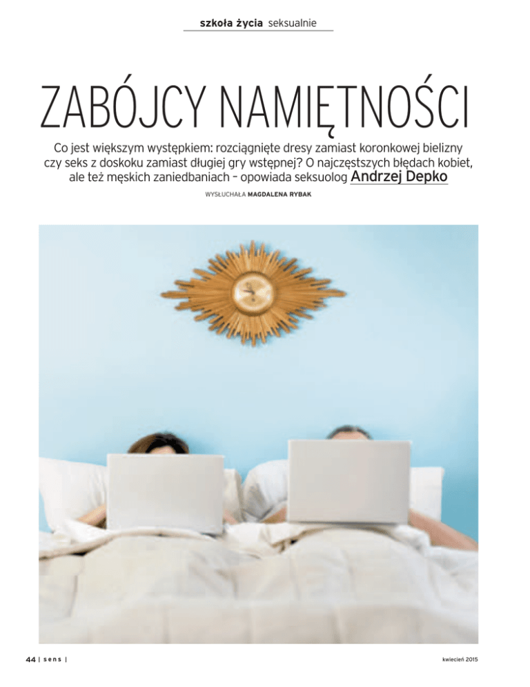 szkoła życia seksualnie Zabójcy namiętności Co jest większym występkiem: rozciągnięte dresy zamiast koronkowej bielizny czy seks z doskoku zamiast długiej gry wstępnej? O najczęstszych błędach kobiet, ale też męskich zaniedbaniach – opowiada seksuolog Andrzej Depko wysłuchała Magdalena Rybak 44 | sens | kwiecień 2015 G dy temperatura w sypialni spada do -50 stopni, zwykle powód jest jeden: utrata uczuć do partnera. Jeżeli przestajemy kochać drugą osobę, przestajemy czuć ciepło, napięcie i pragnienie bycia z nią, a jej dotyk nie wzbudza już w nas pożądania. Partnerzy nie dążą do fizycznego spełnienia, czyli przełożenia tego, co dzieje się w sferze emocjonalnej, na działania. Wtedy seks, jeśli jeszcze do niego dochodzi, staje się nieprzyjemny, mało satysfakcjonujący. Dobrze jest w takiej sytuacji zadać sobie pytanie: dlaczego uczucie gaśnie? Najczęściej z powodu rozczarowania, które może być wyrazem niedojrzałości. Zdarza się bowiem, że partnerzy mylą fascynację erotyczną z miłością i później okazuje się, że więcej ich dzieli, niż zbliża. Zaczyna dochodzić do konfliktów na tle odmiennych potrzeb i ocen rzeczywistości. Uświadamiają sobie, że w ogóle się nie kochali i nie są sobą głębiej zainteresowani. Było im po prostu świetnie ze sobą w łóżku. Miłe złego początki Namiętności zagraża też sytuacja, gdy wnosimy do związku swoje wyobrażenie na temat tego, jak wygląda relacja dwojga ludzi, czyli rodzinny archetyp. Jeżeli u dziewczyny dominującą rolę w domu pełniła matka, a u chłopaka ojciec, to każde z nich będzie dążyło do uzyskania nadrzędnej roli wobec partnera. Zacznie między nimi iskrzyć, aż pojawi się permanentny stan wojny. Z powodu iskrzenia początkowo namiętność wzrasta (łóżko staje się miejscem, gdzie następuje rozejm), ale ponieważ problem nie zostaje rozwiązany – z czasem seksualne napięcie spada do zera. Nie chcemy przecież chodzić do łóżka z kimś, kto nas rozczarował. 2015 kwiecień Przyczyną oziębłości w sypialni mogą też być odmienne wyobrażenia dotyczące życia seksualnego. Partnerzy mogą bardzo lubić seks, ale mieć inne wzorce zachowań. Jeżeli młody mężczyzna kształtował je na podstawie filmów porno, gdzie kobiety są traktowane przedmiotowo i zawsze są gotowe na seks, to on też tak będzie postrzegał swoją partnerkę. A to dla niej nie będzie przyjemne i z czasem może zniechęcić do sekandrzej depko su. Może mu to nawet powiedzieć dr n. med., seksuolog, neurolog, prezes wprost, poprosić, żeby nie łapał jej Polskiego Towarzystwa Medycyny od razu za krocze albo nie wchodził Seksualnej, certyfikowany seksuolog w nią na sucho i niespodziewanie, sądowy, autor książek, współprowadzi ale by zamiast tego pieścił jej ciało, audycję o seksie w radiu RDC a piersi i łono dotykał na samym końcu. Ale on może nie przyjmować tego do wiadomości. Seks w takim wracać na ciepły obiad, a żona jest związku szybko zaniknie. z koleżankami na mieście i każe mu Namiętność zabija również naru- zamawiać pizzę. szenie bezpieczeństwa i hierarchii Podobnie demotywująca do seksu wartości, np. poprzez zdradę. Pod- jest sytuacja, gdy jedno z partnerów waża to poczucie zaufania i rzutuje lub oboje są pracoholikami. Dom na relację emocjonalną i seksualną. traktują jak sypialnię – po powrocie Taka rana może otwierać się zwłasz- idą od razu spać, bo rano trzeba pocza przed sytuacją intymną i jeżeli jechać wcześnie do biura. Żyją dla scena zdrady staje wtedy przed ocza- swoich sukcesów zawodowych, dami, pojawia się niechęć do bliskości. leko od siebie. Przyzwyczajają się do Kolejna rzecz takiej sytuacji i gdy to rozczarowanie jak nagle zrobić lądują u terapeuty, rzeczywistością. nagle uświadamiamiejsce na seks? On przed ślubem ją sobie, że od pół W środy i piątki obiecywał, że bęroku ze sobą nie od 21.30 do 22.15? dzie dbał, troszczył współżyli. I powrót się, zabiegał, a podo bliskości okazuI wpisać to tem okazuje się, że je się trudny. Bo jak do kalendarza? wcale nie jest taki nagle zrobić miejbo wcześniej nie zaangażowany. sce na seks? W śroChce wrócić do było na to czasu? dy i piątki od 21.30 domu, obejrzeć do 22.15? I wpisać sport i napić się piwa albo wyjść to do kalendarza? Zwłaszcza jeżez kolegami. Wspólne życie okazuje li wcześniej nie było na to czasu, się inne, niż miało być. Pojawia się a potrzeby seksualne szybciej można żal i poczucie oszukania. I gdy on było zaspokoić w samotności przy wraca z piwa i niezgrabnie zabiera filmach pornograficznych. Inne rozczarowanie – wyglądem się do miłości, jest to już nieprzyjemne. Działa to też w drugą stronę zewnętrznym. Ona wychodziła za – czyli on ciężko pracuje i chciałby mąż za szczupłego Jasia, a teraz | sens | 45 szkoła życia seksualnie Kobiety biologicznie są bardziej predysponowane do tego, żeby odczuwać zapachy, i są one dla nich ważnym sygnałem. Dlatego często przyczyną śmierci pożycia seksualnego są zaniedbania higieniczne. Ale podobnie jak zapach, na poziom namiętności mogą wpływać rozrzucone po kątach skarpety czy bielizna. zmęczenie to Kolejna rzecz to sprokaci namiętności. wadzanie seksu do zbyt Źródła niemocy uproszczonego aktu. NieMężczyźni są wzrokowca- Łóżko przestaje się kojarzyć mi i kobiety powinny o tym którzy mężczyźni z czasem pamiętać. Wygodne dresy zaczynają sobie cenić szybkie z radosną i kapcie nie sprzyjają pod- zabawą we dwoje numerki, rezygnując z odkrynieceniu. Mężczyzna, który wania erotycznej mapy ciała w pracy otoczony jest elekobiety. Tracą świadomość, ganckimi kobietami i ogląda czaże kobiety wymagają adorowania sami strony pornograficzne, może również po ślubie. Z czarujących być takim ciągłym wyglądem swojej uwodzicieli, jakimi byli w okresie partner