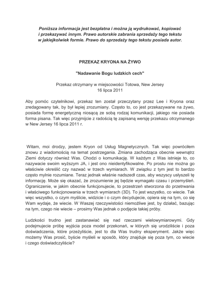 Poniższa informacja jest bezpłatna i można ją wydrukować, kopiować i przekazywać innym. Prawo autorskie zabrania sprzedaży tego tekstu w jakiejkolwiek formie. Prawo do sprzedaży tego tekstu posiada autor. PRZEKAZ KRYONA NA ŻYWO "Nadawanie Bogu ludzkich cech" Przekaz otrzymany w miejscowości Totowa, New Jersey 16 lipca 2011 Aby pomóc czytelnikowi, przekaz ten został przeczytany przez Lee i Kryona oraz zredagowany tak, by był lepiej zrozumiany. Często to, co jest przekazywane na żywo, posiada formę energetyczną niosącą ze sobą rodzaj komunikacji, jakiego nie posiada forma pisana. Tak więc przyjmijcie z radością tę zapisaną wersję przekazu otrzymanego w New Jersey 16 lipca 2011 r. Witam, moi drodzy, jestem Kryon od Usług Magnetycznych. Tak więc powróciłem znowu z wiadomością na temat postrzegania. Zmiana zachodząca obecnie wewnątrz Ziemi dotyczy również Was. Chodzi o komunikację. W każdym z Was istnieje to, co nazywacie swoim wyższym JA, i jest ono nieidentyfikowalne. Po prostu nie można go właściwie określić czy nazwać w trzech wymiarach. W związku z tym jest to bardzo często mylnie rozumiane. Teraz jednak właśnie nadszedł czas, aby wszyscy usłyszeli tę informację. Może się okazać, że zrozumienie jej będzie wymagało czasu i przemyśleń. Ograniczenie, w jakim obecnie funkcjonujecie, to przestrzeń stworzona do przetrwania i właściwego funkcjonowania w trzech wymiarach (3D). To jest wszystko, co wiecie. Tak więc wszystko, o czym myślicie, widzicie i o czym decydujecie, opiera się na tym, co się Wam wydaje, że wiecie. W Waszej rzeczywistości niemożliwe jest, by działać, bazując na tym, czego nie wiecie – prosimy Was jednak o podjęcie takiej próby. Ludzkości trudno jest zastanawiać się nad rzeczami wielowymiarowymi. Gdy podejmujecie próbę wyjścia poza model przekonań, w których się urodziliście i poza doświadczenia, które przeżyliście, jest to dla Was trudny eksperyment. Jakże więc możemy Was prosić, byście myśleli w sposób, który znajduje się poza tym, co wiecie i czego doświadczyliście? Energia tej planety się zmienia. Można powiedzieć, że przybornik z narzędziami ludzi Pracujących dla Światła został rozbudowywany. Tak więc nowy zestaw narzędzi to klucz do tego, by mieć możliwość zrobić to, co jest obecnie do wykonania, to znaczy zacząć myśleć w sposób wielowymiarowy, nawet bez świadomości tego, co się czyni. Częścią tego rozbudowanego zestawu narzędzi jest nowy sposób otrzymywania pomocy, który zaczyna się od wzrostu intuicji u starych dusz. Aby to zrozumieć, zacznijmy z afirmacją, potwierdzeniem intencji. Kiedy jesteście przed Duchem w takiej grupie jak ta lub samodzielnie słuchacie czy czytacie ten przekaz – jak czynią to niektórzy z Was – poproście o mądrość: Drogi Duchu, pomóż mi zrozumieć na poziomie wielowymiarowym koncepcje, które są mi przedstawiane. Dzięki wzmocnieniu własnego pojmowania poprawicie komunikację pomiędzy dwiema stronami zasłony (poziomem trójwymiarowym i poziomem wielowymiarowym). Nadawanie Bogu ludzkich cech Nadaję tytuł temu przekazowi, aby nie musiał tego robić mój partner (Lee Carroll). Nie zawsze to czynię, ponieważ nazywanie rzeczy jest działaniem wymaganym przez trójwymiarowość. W Waszej rzeczywistości ważne jest, by wiadomość, która do Was dociera i którą macie usłyszeć, była poprzedzona tytułem. Tak więc nadaję tytuł tej wiadomości: Nadawanie Bogu ludzkich cech – potraktujcie to jako ćwiczenie dychotomiczne*1. Mój partner siedzi w fotelu. Od dwudziestu dwóch lat otrzymuje i przekazuje Wam koncepcje rodzące się w moich myślach. Chociaż pochodzą one z drugiej strony zasłony, są obecne w każdym Człowieku, wewnątrz jego wyższego Ja, ale nie są one dostępne w prosty sposób. A to dlatego, że istnieją one w stanie wielowymiarowym, a nie w tym, do którego Człowiek jest przyzwyczajony. Tak więc dwadzieścia dwa lata temu mój partner podjął się nauki ujmowania tych przekazów w ciąg słów prezentowanych w języku, który jest dla Was zrozumiały. Nie wszyscy, którzy tutaj jesteście lub czytacie to, zrozumiecie wszystko, czego Was dzisiaj uczę. Jestem tego świadomy, dlatego że Duch nie przemawia do Ludzi ludzką mową. Zamiast tego język, w którym Duch mówi do Ludzi, jest tym, co nazywacie migawkami intuicyjnymi, które istnieją poza czasem liniowym i przychodzą wszystkie równocześnie. W ten sposób otrzymujecie najlepszą informację. Mimo to wielu z Was uważa, że doskonale rozumiecie, kim jest Bóg. Przykłady liniowości Osoba, która być może jest tutaj po raz pierwszy, mogłaby zadać mi bezpośrednie pytanie: Kim ty jesteś, Kryonie, i skąd pochodzisz? Te dwa pytania brzmią całkowicie logicznie i zwyczajnie dla każdego Człowieka, który słucha tego przekazu lub czyta go. Jednakże powiem Wam, że te pytania same z siebie świadczą o tendencyjnym liniowym myśleniu. Dla Kryona nie istnieje pytanie: Kto? On bowiem pochodzi znikąd. Jak to możliwe? Mogę Wam to wyjaśnić jedynie poprzez użycie metafory. Wiem, że metafory*2 nie poddają się pełnemu zbadaniu, ponieważ żadna analogia nie jest dla nich idealna. Tak więc przyjmijcie to jako najlepszy sposób do zrozumienia rzeczy, o których mówię. Powiedzmy zatem, że w swoim życiu czujesz głęboką miłość do innego Człowieka, zwierzęcia lub, przykładowo, do swojego dziecka. Powiedzmy, że tak przepełnia ona Twoje serce, jest tak silna, że aż płaczesz z radości! Czy w momencie gdy to odczuwasz, rozglądasz się wokół i pytasz: Kim ty w rzeczywistości jesteś? Kim ty jesteś naprawdę? Kto tam jest? Czy potraktujesz to uczucie miłości, jakby posiadało ciało i zapytasz: Skąd pochodzisz? Oczywiście, że nie! Zamiast tego zaakceptujesz tę miłość i powiesz: Wiem, że pochodzisz ode mnie, jednakże naprawdę nie czuję, byś była częścią mnie. Jest coś