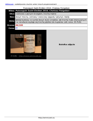WINniczek - subiektywnie o kuchni, winie i innych przyjemnościach Puisseguin Saint-Émilion 2010, Chateau Fongaban Wino: Puisseguin Saint-Émilion 2010, Chateau Fongaban Oko: rubinowe z jasnym brzegiem, trochę mętne Nos: dosyć mocny, ostrawy i owocowy (jagody i jeżyny); niezły Usta: lekkiej budowy; w sumie dosyć dużo smaków, ale trochę mało intensywnych i w rezultacie wydaje się trochę płytkie (do kupienia: Lidl; cena: 35 PLN) Ocena: 86/100 Cena: ** Butelka zdjęcie Źródło: http://www.winniczek.eu http://winniczek.eu