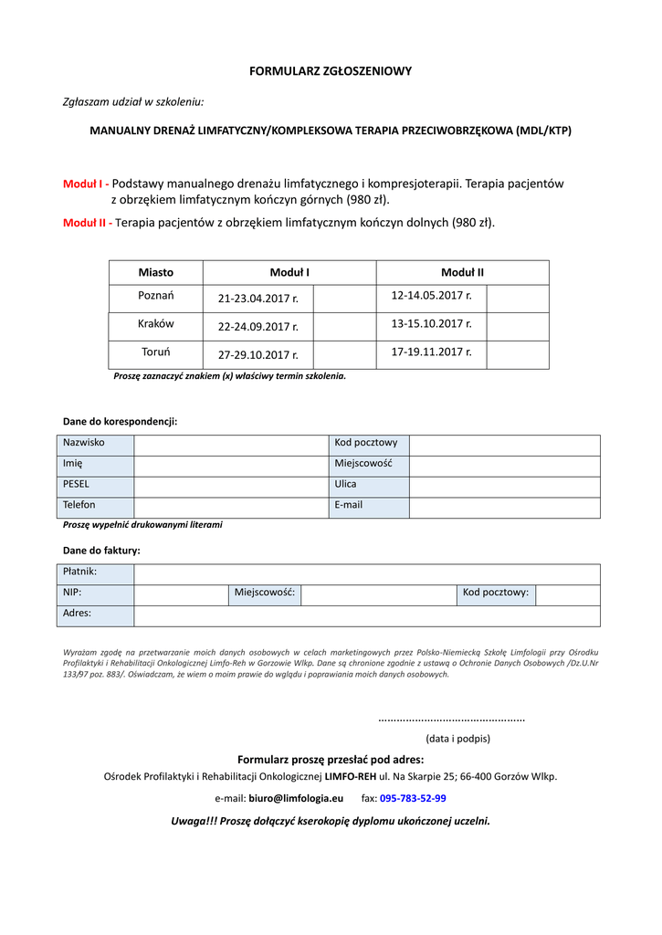 FORMULARZ ZGŁOSZENIOWY Zgłaszam udział w szkoleniu: MANUALNY DRENAŻ LIMFATYCZNY/KOMPLEKSOWA TERAPIA PRZECIWOBRZĘKOWA (MDL/KTP) Moduł I - Podstawy manualnego drenażu limfatycznego i kompresjoterapii. Terapia pacjentów z obrzękiem limfatycznym kończyn górnych (980 zł). Moduł II - Terapia pacjentów z obrzękiem limfatycznym kończyn dolnych (980 zł). Miasto Moduł I Moduł II Poznań 21-23.04.2017 r. 12-14.05.2017 r. Kraków 22-24.09.2017 r. 13-15.10.2017 r. Toruń 27-29.10.2017 r. 17-19.11.2017 r. Proszę zaznaczyć znakiem (x) właściwy termin szkolenia. Dane do korespondencji: Nazwisko Kod pocztowy Imię Miejscowość PESEL Ulica Telefon E-mail Proszę wypełnić drukowanymi literami Dane do faktury: Płatnik: NIP: Miejscowość: Kod pocztowy: Adres: Wyrażam zgodę na przetwarzanie moich danych osobowych w celach marketingowych przez Polsko-Niemiecką Szkołę Limfologii przy Ośrodku Profilaktyki i Rehabilitacji Onkologicznej Limfo-Reh w Gorzowie Wlkp. Dane są chronione zgodnie z ustawą o Ochronie Danych Osobowych /Dz.U.Nr 133/97 poz. 883/. Oświadczam, że wiem o moim prawie do wglądu i poprawiania moich danych osobowych. ………………………………………… (data i podpis) Formularz proszę przesłać pod adres: Ośrodek Profilaktyki i Rehabilitacji Onkologicznej LIMFO-REH ul. Na Skarpie 25; 66-400 Gorzów Wlkp. e-mail: [email protected] fax: 095-783-52-99 Uwaga!!! Proszę dołączyć kserokopię dyplomu ukończonej uczelni.