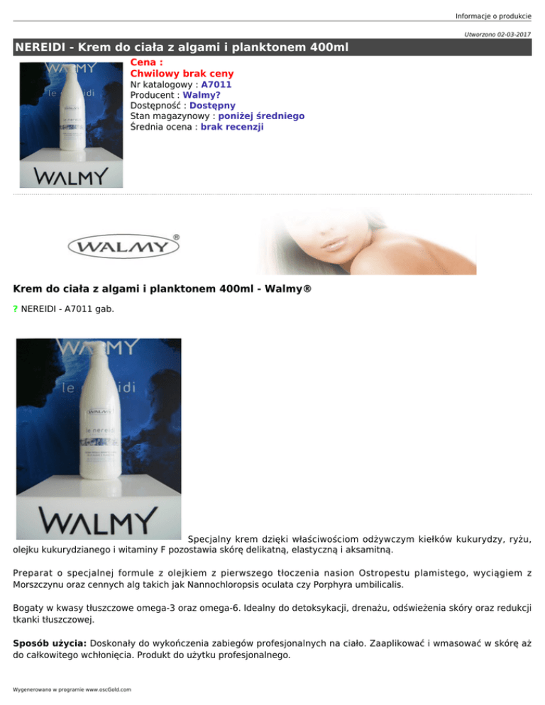 Informacje o produkcie Utworzono 02-03-2017 NEREIDI - Krem do ciała z algami i planktonem 400ml Cena : Chwilowy brak ceny Nr katalogowy : A7011 Producent : Walmy? Dostępność : Dostępny Stan magazynowy : poniżej średniego Średnia ocena : brak recenzji Krem do ciała z algami i planktonem 400ml - Walmy® ? NEREIDI - A7011 gab. Specjalny krem dzięki właściwościom odżywczym kiełków kukurydzy, ryżu, olejku kukurydzianego i witaminy F pozostawia skórę delikatną, elastyczną i aksamitną. Preparat o specjalnej formule z olejkiem z pierwszego tłoczenia nasion Ostropestu plamistego, wyciągiem z Morszczynu oraz cennych alg takich jak Nannochloropsis oculata czy Porphyra umbilicalis. Bogaty w kwasy tłuszczowe omega-3 oraz omega-6. Idealny do detoksykacji, drenażu, odświeżenia skóry oraz redukcji tkanki tłuszczowej. Sposób użycia: Doskonały do wykończenia zabiegów profesjonalnych na ciało. Zaaplikować i wmasować w skórę aż do całkowitego wchłonięcia. Produkt do użytku profesjonalnego. Wygenerowano w programie www.oscGold.com Składniki/Ingredients: AQUA, CETEARYL GLUCOSIDE, CETEARYL ALCOHOL, DICAPRYLYL ETHER, TRITICUM VULGARE GERM OIL, DECYL OLEATE, GLYCERIN, DIMETHICONE, SODIUM CETEARYL SULFATE, CICLOPENTASILOXANE, DIMETHICONE CROSSPOLYMER, FUCUS VESICULOSUS EXTRACT, ALGAE EXTRACT, PLANKTON EXTRACT, ZEA MAYS GERM OIL, SILYBUM MARIANUM SEED OIL, CAPRYLIC/CAPRICTRIGLYCERIDES, EDTA, DIAZOLIDINYL UREA, METHYL PARABEN, PROPYL PARABEN, PROPYLENE GLYCOL, LECITHIN, TOCOPHEROL, ASCORBYL PALMITATE, CITRIC ACID, PARFUM. Dystrybutor: Dermaya Instytut Kosmetyki Profesjonalnej ul. Grota-Roweckiego 2b, 80-112 Gdańsk [email protected]