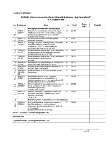 Kosztorys ofertowy Izolacja pionowa ścian fundamentowych budynku „Agronomówki” w Kraszewicach L.p. Podstawa 2 d.1 3 d.1 KNR 2-31 0807-01 KNR 2-31 0813-01 KNR 4-01 0104-02 4 d.1 TZKNBK VII -23 5 TZKNBK VII -24 d.1 6 d.1 7 d.1 8 d.1 9 d.1 10 d.1 11 d.1 KNR K-04 0102-01 KNR K-04 0103-07 KNR-W 202 060602 KNR 4-01 0105-01 KNR 2-31 23103-04 KNR 2-31 0407-04 2 12 d.2 j.m. Ilość Cena jedn. Wartość Izolacja pionowa ścian zewnętrznych 1 1 d.1 Opis KNR 4-01 0726-03 Rozebranie nawierzchni z betonowych płytek chodnikowych o wym. 35x35 cm na podsypce piaskowej z wypełnieniem spoin piaskiem 1.80*13.30+1.10*9.50 Rozebranie krawężników betonowych na podsypce piaskowej Wykopy o ścianach pionowych przy odkrywaniu odcinkami istniejących fundamentów o głębokości do 1.5 m w gruncie kat. III (13.30+9.50+4.30+9.0+9.5)*0.8*1.20 Izolacja pionowa powłokowa z lepiku smołowego lub asfaltowego na zimno pierwsza warstwa (13.30+9.50+4.30+9.0+9.5)*1.20 Izolacja pionowa powłokowa z lepiku smołowego lub asfaltowego na zimno druga warstwa Przyklejenie płyt styropianowych o zmniejszonej chłonności wody na ścianach gr.12 cm Wykonanie warstwy zbrojącej -zatapianie jednej warstwy siatki na ścianach Izolacja pionowa ścian fundamentowych z folii kubełkowej. m 2 m 34.390 9.500 m 3 43.776 m 2 54.720 m 2 54.720 m 2 54.720 m 2 54.720 m 2 54.720 3 Zasypanie wykopów ziemią z ukopów m z przerzutem ziemi na odległość do 3 m i ubiciem warstwami co 15 cm w gruncie kat. I-II (13.30+9.50+4.30+9.0+9.5)*0.7*1.20 Chodniki z kostki brukowej betonowej o grubości m2 6 cm, "dwuteownik" 20x16,5 cm na podsypce cementowo-piaskowej 1.80*13.30+1.10*9.50 Obrzeża betonowe o wymiarach 30x8 cm na m podsypce piaskowej z wypełnieniem spoin zaprawą cementową 13.30+9.50 Naprawa tynków w przyziemiu ścian zewnętrznych 38.304 2 54.720 Uzupełnienie tynków zewnętrznych zwykłych kat. III o podłożach z cegły, pustaków ceramicznych, gazo-i pianobetonów ( do 5 m2 w 1 miejscu ) (13.30+9.50+4.30+9.0+9.5)*1.20 m 34.390 22.800 Wartość kosztorysowa robót bez podatku VAT Podatek VAT Ogółem wartość kosztorysowa robót z VAT ……………………………….. (podpis)