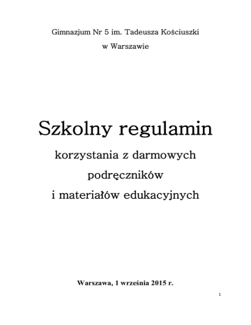 Gimnazjum Nr 5 im. Tadeusza Kościuszki w Warszawie Szkolny regulamin korzystania z darmowych podręczników i materiałów edukacyjnych Warszawa, 1 września 2015 r. 1 Spis treści Wstęp 4 I Postanowienia ogólne 6 Przedmiot regulaminu 6 Słowniczek 6 II Zadania biblioteki w zakresie udostępniania podręczników i materiałów edukacyjnych 7 III Przyjęcie podręczników na stan szkoły 8 IV Udostępnianie zbiorów 8 Użytkownicy biblioteki podręczników szkolnych 8 Okres trwania wypożyczenia 9 Procedura wypożyczania podręczników 10 Zmiana szkoły 10 V Odpowiedzialność za udostępniane podręczniki 11 Obowiązki ucznia związane z wypożyczeniem 11 Uszkodzenie albo zniszczenie podręcznika lub materiału edukacyjnego 11 Zakres odpowiedzialności 12 VI Inwentaryzacja 12 VII Postanowienia końcowe 13 Podstawa prawna 14 2 Spis załączników 1. Umowa użyczenia podręczników i materiałów edukacyjnych rodzicom ucznia (z załączonym spisem) 15 2. Wezwanie do zapłaty (z załączonym spisem spisem) 18 3. Ostatnie wezwanie do zapłaty 20 4. Protokół kontroli zbiorów bibliotecznych darmowych podręczników szkolnych i materiałów edukacyjnych 22 5. Potwierdzenie zwrotu podręczników i materiałów edukacyjnych dla rodziców ucznia 24 3 Wstęp Ustawa z dnia 30 maja 2014 r. o zmianie ustawy o systemie oświaty oraz niektórych innych ustaw (Dz. U. z 2014 r. poz. 911) wprowadza nowe zasady wyboru przez nauczycieli podręczników, materiałów edukacyjnych i ćwiczeniowych. Gwarantuje też uczniom szkół podstawowych i gimnazjów bezpłatny dostęp do podręczników, materiałów edukacyjnych lub ćwiczeniowych przeznaczonych do obowiązkowych zajęć z zakresu kształcenia ogólnego określonych w ramowych planach nauczania dla tych szkół. Zmiany z tzw. ustawy ,,podręcznikowej’’ są wprowadzane sukcesywnie począwszy od klasy I szkoły podstawowej w roku szkolnym 2014/15. Docelowo w 2017 r. podręczniki dla uczniów wszystkich klas szkół podstawowych oraz gimnazjów będą bezpłatne. W związku z wprowadzeniem dotacji na darmowe podręczniki szkoła musi zapewnić prawidłowe zasady ich wykorzystywania. Zgodnie z nowo dodanym art. 22ak ustawy szkoła ma obowiązek opracowania szczegółowych warunków korzystania przez uczniów z podręczników lub materiałów edukacyjnych uwzględniając konieczność zapewnienia co najmniej trzyletniego okresu ich używania. Celem wypełnienia tego obowiązku opracowano niniejszy Szkolny regulamin korzystania z darmowych podręczników i materiałów edukacyjnych. Reguluje on najważniejsze kwestie związane z obrotem podręcznikami w szkole: przyjęcia podręczników na stan szkoły; wypożyczania i zapewnienia uczniom dostępu do podręczników lub materiałów edukacyjnych; postępowania w przypadku ich zagubienia, zniszczenia lub niezwrócenia; corocznej inwentaryzacji celem uzupełnienia zbiorów. 4 W załącznikach zamieszczono wzory wykorzystywanych dokumentów: o umowę użyczenia podręczników rodzicom ucznia wraz z potwierdzeniem przekazania materiałów ćwiczeniowych; o wezwanie rodziców do zapłaty w przypadku zniszczenia lub niezwrócenia darmowych podręczników i materiałów edukacyjnych; o protokół kontroli zbiorów bibliotecznych podręczników szkolnych o potwierdzenie zwrotu podręczników i materiałów edukacyjnych wydawane rodzicom na życzenie - stanowiące integralną część niniejszego regulaminu. 5 Rozdział I Postanowienia ogólne §1 Przedmiot Regulaminu 1. Niniejszy Regulamin korzystania z darmowych podręczników i materiałów edukacyjnych, zwany dalej Regulaminem reguluje: a) zasady związane z wypożyczaniem i zapewnieniem uczniom dostępu do podręczników lub materiałów edukacyjnych, b) tryb przyjęcia podręczników na stan szkoły, c) postępowanie w przypadku zagubienia lub zniszczenia podręcznika lub materiału edukacyjnego. 2. Każdy uczeń, rodzic/opiekun prawny powinien zaznajomić się z Regulaminem korzystania z darmowych podręczników i materiałów edukacyjnych. 3. Udostępnianie materiałów bibliotecznych podlega rejestracji. 4. Podręczniki wypożyczane do domu są zapisywane w wykazie załączonym do Umowy użyczenia. 5. Zwrot wypożyczonych podręczników bibliotekarz potwierdza w wykazie wymienionym w ust. 4. §2 Słowniczek Użyte w Regulaminie terminy oznaczają: Szkoła – Gimnazjum Nr 5 im. Tadeusza Kościuszki w Warszawie Biblioteka – biblioteka podręczników szkolnych funkcjonująca w ramach biblioteki szkolnej Uczeń – uczeń szkoły uprawniony do korzystania z darmowych podręczników lub materiałów edukacyjnych 6 Podręcznik – podręcznik dopuszczony do użytku szkolnego Materiał edukacyjny – materiał zastępujący lub uzupełniający podręcznik, umożliwiający realizację programu nauczania, mający postać papierową lub elektroniczną Materiał ćwiczeniowy – materiał przeznaczony dla uczniów służący utrwalaniu przez nich wiadomości i umiejętności Dotacja – dotacja celowa, o której mowa w art. 22ae pkt 5 ustawy o systemie oświaty (Dz. U. z 2014 r. poz. 811) Rodzic – rodzic lub opiekun prawny ucznia Wychowawca klasy – wyznaczony przez Dyrektora Szkoły wychowawca danej klasy. Rozdział II Zadania biblioteki w zakresie udostępniania podręczników i materiałów edukacyjnych §3 1. Biblioteka podręczników szkolnych, zwana dalej biblioteką gromadzi podręczniki, materiały edukacyjne, materiały ćwiczeniowe i inne materiały biblioteczne. 2. Biblioteka nieodpłatnie: a) wypożycza uczniom podręczniki lub materiały edukacyjne mające postać papierową, lub b) zapewnia uczniom dostęp do podręczników i materiałów edukacyjnych mających postać elektroniczną, c) przekazuje uczniom materiały ćwiczeniowe bez obowiązku zwrotu lub je udostępnia. 7 3. Dołączona do podręcznika lub materiałów edukacyjnych płyta CD stanowi integralną część podręcznika lub materiałów edukacyjnych i należy ją zwrócić wraz z
