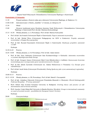 Instytut Nauk Politycznych i Dziennikarstwa Uniwersytetu Śląskiego w Katowicach Poniedziałek (12 listopada) 11.30 Wyjazd autokaru z Katowic (plac przy rektoracie Uniwersytetu Śląskiego, ul. Bankowa 11) 13.00-15.00 Zakwaterowanie w Hotelu „Jaskółka” w Ustroniu, ul. Zdrojowa 10 13.30 Obiad 15.00 Otwarcie konferencji przez Dyrektora Instytutu Nauk Politycznych i Dziennikarstwa Uniwersytetu Śląskiego w Katowicach Prof. dra hab. Mariusza Kolczyńskiego 15.15 - 16.30 Obrady plenarne, cz. I; Prowadzący: Prof. dr hab. Mariusz Kolczyński Prof. dr hab. Jan Iwanek (Uniwersytet Śląski w Katowicach): Pojęcie autonomii terytorialnej Prof. dr hab. Michał Śliwa (Uniwersytet Pedagogiczny im. KEN w Krakowie): Projekty autonomii terytorialnej w Drugiej Rzeczypospolitej Prof. dr hab. Ryszard Kaczmarek (Uniwersytet Śląski w Katowicach): Realizacja projektów autonomii w II RP Dyskusja 16.30-16.45 Przerwa 16.45- 18.00 Obrady plenarne, cz. II; Prowadzący: Prof. dr hab. Adam Jamróz Prof. dr hab. Jerzy Jaskiernia (Uniwersytet Jana Kochanowskiego w Kielcach): Autonomia terytorialna w systemie aksjologicznym Rady Europy Prof. dr hab. Grzegorz Janusz (Uniwersytet Marii Curie-Skłodowskiej w Lublinie): Zastosowanie kryterium terytorialnego przy rozwiązywaniu spraw narodowościowych w Europie Prof. dr hab. Marek Żyromski (Uniwersytet im. Adama Mickiewicza w Poznaniu): Czy Europie grozi refeudalizacja ? Prof. dr hab. Jacek Sroka (Uniwersytet Wrocławski): Dialog Społeczny jako wyraz autonomizacji regionalnej Dyskusja 18.00-18.15 Przerwa 18.15 -19.30 Obrady plenarne, cz. III; Prowadzący: Prof. dr hab. Marek S. Szczepański Prof. dr hab. Arkadiusz Żukowski (Uniwersytet Warmińsko-Mazurski w Olsztynie): Obwód Kaliningradzki Federacji Rosyjskiej – W stronę autonomii? Ph.D. Robert Sata (Central European University in Budapest): Evolving theory and practice of selfdetermination and territorial autonomy Ph.D. Jaroslav Usiak (Matej Bel University in Banska Bystrica, Slovakia): Groups in international community as a part of societal security - possibilities for European Union's Territory Dyskusja 20.00 Uroczysta kolacja 1 Wtorek (13 listopada) 7.30-9.00 Śniadanie 9.00-11.00 Obrady plenarne, cz. IV; Prowadzący: Prof. dr hab. Grzegorz Janusz Prof. dr hab. Katarzyna Sobolewska-Myślik (Uniwersytet Pedagogiczny im. KEN w Krakowie): Region jako płaszczyzna aktywności partii politycznych-zarys problemu Prof. dr hab. Ryszard Herbut (Uniwersytet Wrocławski): Partie etnocentryczne w wymiarze regionalnym Prof. dr hab. Jan Iwanek (Uniwersytet Śląski w Katowicach): Aspekty teoretyczne definicji: partia regionalna, partia lokalna, regionalne, lokalne systemy partyjne Prof. dr hab. Robert Wiszniowski (Uniwersytet Wrocławski): System partyjny w Polsce bez partii regionalnej Prof. dr hab. Wawrzyniec Konarski (Uniwersytet Jagielloński): Language as a Prerequisite for Ethnopolitics – Selected Remarks Dyskusja 11.00-11.15 Przerwa 11.15-12.15 Obrady panelowe cz. 1 Prof. dr hab. Jacek Wojnicki (Uniwersytet Warszawski): Kwestia regionalizacji w państwach ESW dr Agnieszka Zaremba, dr Magdalena Molendowska (Uniwersytet Jana Kochanowskiego w Kielcach): Autonomia terytorialna w programach i polityce partii europejskich na przykładzie koalicji liberalnochadeckiej w Parlamencie Europejskim dr Beata Kosowska-Gąstoł (Uniwersytet Jagielloński): Współpraca partii regionalnych na płaszczyźnie europejskiej Dyskusja 11.15-12.15 Obrady panelowe, cz. 2 Prof. Elisabetta Palici di Suni (University of Torino, Department of Law, Italy): The evolution of Regionalism in Italy Ph.D. Adrea Pin (University of Padua, Italy): With the Fiscal Crisis, the End of Italian Federalism? dr Witold Misiuda-Rewera (Uniwersytet Marii Curie-Skłodowskiej w Lublinie): Prawa mniejszości językowych we włoskich autonomiach regionalno-federalnych Dyskusja 12.15-12.30 Przerwa 12.30-14.00 Obrady panelowe, cz. 3 Prof. dr hab. Jan Iwanek (Uniwersytet Śląski w Katowicach): Wspólnota autonomiczna w systemie politycznym Hiszpanii. Aspekty ustrojowe i polityczne dr Iwona Wrońska (Uniwersytet Jana Kochanowskiego w Kielcach): Federacja odpowiedzią na aspiracje regionalne? 2 dr Tomasz Brańka (Uniwersytet im. Adama Mickiewicza w Poznaniu): Zwolennicy i przeciwnicy rozwiązań autonomicznych dr Grzegorz Bonusiak (Uniwersytet Rzeszowski): Elementy autonomii terytorialnej w statusie Saamów w państwach nordyckich Dyskusja 12.30-14.00 Obrady panelowe cz.4 dr Sebastian Kubas (Uniwersytet Śląski w Katowicach): Proces walki o autonomię Słowacji do czasu jej uzyskania w 1938 roku dr Natalia Cwicinskaja (Uniwersytet im. Adama Mickiewicza w Poznaniu): Integralność państwa a instytucja autonomii terytorialnej na przykładzie Republiki Mołdowa dr Robert Rajczyk (Uniwersytet Śląski w Katowicach): Autonomia Gagauzji jako panaceum na separatyzm dr Małgorzata Mieczkowska (Uniwersytet Serbołużyczan w Niemczech po 1990 roku Szczeciński): Ewolucja pozycji społeczno-politycznej Dyskusja 14.00-15.00 Obiad 15.00-16.30 Obrady panelowe, cz. 5 Prof. dr hab. Jerzy Mizgalski (Akademia im. Jana Długosza w Częstochowie): Tożsamość narodowa a tożsamość polityczna partii/ugrupowania politycznego działających w środowisku regionalnym/lokalnym Prof. dr hab. Miron Kłusak (Akademia Marynarki Wojennej): Priorytety w strategii rozwoju Pomorza Gdańskiego Prof. dr hab. Krzysztof Gładkowski (Uniwersytet Warmińsko-Mazurski w Olsztynie): Anachronizm czy awangarda? Polityka historyczna i nacjonalizm a regionalizm otwarty dr Jacek Poniedziałek (Uniwersytet Warmińsko-Mazurski w Olsztynie): Autonomia regionalna po mazursku Dyskusja 15.00-16.30 Obrady panelowe, cz. 6 dr Rafał Klepka (Akademia im. Jana Długosza w Częstochowie): Od państwa unitarnego do federacji – uwagi nad ustrojem terytorialnym Belgii dr Małgorzata Domagała (Uniwersytet Śląski): Rozwiązania autonomii terytorialnej w Wielkiej Brytanii Ph.D. Petr Just (Metropolitan University Pr