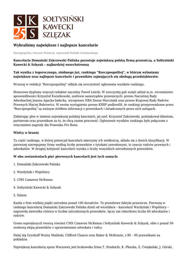 Wybraliśmy największe i najlepsze kancelarie Rzeczpospolita, Ireneusz Walencik, wypowiedź Rudolfa Ostrihanskiego Kancelaria Domański Zakrzewski Palinka pozostaje największą polską firmą prawniczą, a Sołtysiński Kawecki & Szlęzak – najbardziej wszechstronną Tak wynika z tegorocznego, siódmego już, rankingu "Rzeczpospolitej", w którym wyłaniamy największe oraz najlepsze kancelarie i prawników zajmujących się obsługą przedsiębiorstw. Wczoraj w redakcji "Rzeczpospolitej" odbyła się uroczystość ogłoszenia wyników rankingu. Honorowe dyplomy wręczał redaktor naczelny Paweł Lisicki. W uroczystej gali wzięli udział m.in. wiceminister sprawiedliwości Krzysztof Kwiatkowski, szefowie samorządów prawniczych: prezes Naczelnej Rady Adwokackiej Joanna Agacka-Indecka, wiceprezes NRA Zenon Marciniak oraz prezes Krajowej Rady Radców Prawnych Maciej Bobrowicz. W swoim wystąpieniu prezes KRRP podkreślił, że rankingi przeprowadzane przez "Rzeczpospolitą" są ważnym źródłem informacji o prawnikach i świadczonych przez nich usługach. Zabierając głos w imieniu największej polskiej kancelarii, jej szef, Krzysztof Zakrzewski, podziękował klientom, partnerom oraz prawnikom za to, że chcą razem pracować. Ogłoszenie wyników rankingu było połączone z wręczeniem nagrody dla Prawnika Pro Bono. Wielcy w branży Ta część rankingu, w której potencjał kancelarii mierzymy ich wielkością, składa się z dwóch klasyfikacji. W pierwszej szeregujemy firmy według liczby prawników z tytułami zawodowymi, to znaczy radców prawnych i adwokatów. W drugiej kolejność kancelarii wynika z liczby wszystkich zatrudnionych prawników. W obu zestawieniach pięć pierwszych kancelarii jest tych samych: 1. Domański Zakrzewski Palinka 2. Wardyński i Wspólnicy 3. CMS Cameron McKenna 4. Sołtysiński Kawecki & Szlęzak 5. Salans Każda z firm wielkiej piątki zatrudnia ponad 100 doradców. To prawdziwe fabryki prawnicze. Pierwszą w rankingu kancelarię Domański Zakrzewski Palinka dzieli od wicelidera – kancelarii Wardyński i Wspólnicy – naprawdę niewielka różnica w liczbie zatrudnionych prawników, łączy zaś rekordowa liczba 60 adwokatów i radców. Grono największych tworzą również CMS Cameron McKenna i Sołtysiński Kawecki & Szlęzak, obie z ponad 50osobową ekipą prawników z uprawnieniami adwokata i radcy. Dalej idą Grynhoff Woźny Maliński, Clifford Chance oraz Baker & McKenzie, z 80 – 90 prawnikami na pokładzie. Największą kancelarią spoza Warszawy jest krakowska firma T. Studnicki, K. Płeszka, Z. Ćwiąkalski, J. Górski, w rankingu zajmująca wysokie 13. miejsce. Wyspecjalizowani liderzy Druga część rankingu przedstawia najlepsze zespoły oraz prawników w osiemnastu dziedzinach prawa. Podstawą wyboru były rekomendacje innych kancelarii, które w ankietach rankingowych wskazywały wyróżniających się konkurentów z branży. W tym roku udało się wybrać znacznie szersze niż w poprzednich latach grono liderów oraz kancelarii i prawników rekomendowanych. Najwięcej tytułów lidera – trzy – zdobyła firma Sołtysiński Kawecki & Szlęzak (prawo spółek, antymonopolowe oraz własności intelektualnej). Uzasadnia to uznanie jej za najwszechstronniejszą polską kancelarię. Bardzo dobrze wypadły także dwie inne kancelarie, które zdobyły po dwa tytuły lidera: Wardyński i Wspólnicy (wyspecjalizowana w obsłudze procesów sądowych i prawie upadłościowym) oraz Clifford Chance (prawo bankowe i finansowe oraz nieruchomości). Na uwagę zasługuje zdobycie tytułu w dziedzinie prawa pracy przez niewielką, ale docenianą specjalistyczną kancelarię Bartłomieja Raczkowskiego. Drugi raz z rzędu w prawie podatkowym największe uznanie rekomendujących kancelarii prawniczych zdobyła spółka doradztwa podatkowego MDDP Michalik Dłuska Dziedzic i Partnerzy. Po raz pierwszy udało się wyłonić zdecydowanych liderów w dziedzinie prawa energetycznego (Chadbourne & Parke), farmaceutycznego (Baker & McKenzie), ubezpieczeniowego (Lovells) oraz upadłościowego (wspomniany już Wardyński i Wspólnicy). Doradztwo prawne to najczęściej praca zespołowa, ale liczy się wyrazisty lider, który potrafi ją poprowadzić. Tegoroczny ranking wyłonił również grono najlepszych prawników. Plejada gwiazd liczy 16 osób. Wśród nich prym wiodą specjaliści z kancelarii Clifford Chance – aż trzech zdobyło tytuły lidera. Oprócz powtarzających się nazwisk pojawili się także "nowicjusze". Pierwszy raz tytuł lidera w dziedzinie fuzji i przejęć przypadł Krzysztofowi Zakrzewskiemu, szefowi kancelarii Domański Zakrzewski Palinka (wespół z Jarosławem Grzesiakiem z Dewey & LeBoeuf). Także Arkadiusz Krasnodębski z Salansa (prawo energetyczne) i Stanisław Wajda z Clifford Chance (prawo ochrony środowiska) zwyciężyli po raz pierwszy. Obroty przekroczyły setkę Odrębną klasyfikację rankingu sporządziliśmy na podstawie zadeklarowanych przez kancelarie rocznych przychodów za 2008 r. Znalazły się w niej firmy, które zdecydowały się przedstawić nam swoje wyniki finansowe jako obiektywny miernik pozycji na rynku. Od dwóch lat najwyższe, ponad 100-milionowe, obroty osiąga warszawskie biuro kancelarii Clifford Chance, tegoroczny zwycięzca w kategorii przychodów. Ranking pokazuje, że wyniki finansowe firm prawniczych były bardzo dobre i kryzys, który zaczął się w ostatnich miesiącach 2008 r., nie odcisnął jeszcze na nich swego piętna. Rynek usług prawniczych wzrósł o 10 proc. Po raz pierwszy opracowaliśmy też ranking według dochodów kancelarii w 2008 r. Swoje zyski zdecydowała się ujawnić zaledwie połowa z tych, które wzięły udział w zestawieniu według obrotów. Mamy nadzieję, że idea tworzenia poważnego rankingu dochodowego znajdzie w następnych latach więcej zwolenników. Pomagają pro bono Drugi raz w naszym rankingu dokonaliśmy wyboru kancelarii najbardziej zaangaż