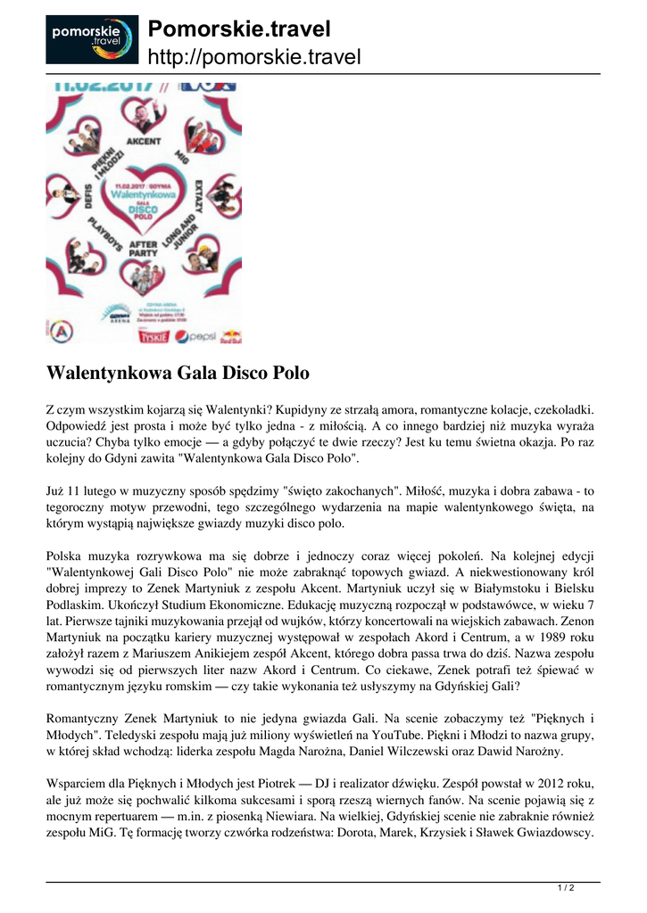 Pomorskie.travel http://pomorskie.travel Walentynkowa Gala Disco Polo Z czym wszystkim kojarzą się Walentynki? Kupidyny ze strzałą amora, romantyczne kolacje, czekoladki. Odpowiedź jest prosta i może być tylko jedna - z miłością. A co innego bardziej niż muzyka wyraża uczucia? Chyba tylko emocje — a gdyby połączyć te dwie rzeczy? Jest ku temu świetna okazja. Po raz kolejny do Gdyni zawita "Walentynkowa Gala Disco Polo". Już 11 lutego w muzyczny sposób spędzimy "święto zakochanych". Miłość, muzyka i dobra zabawa - to tegoroczny motyw przewodni, tego szczególnego wydarzenia na mapie walentynkowego święta, na którym wystąpią największe gwiazdy muzyki disco polo. Polska muzyka rozrywkowa ma się dobrze i jednoczy coraz więcej pokoleń. Na kolejnej edycji "Walentynkowej Gali Disco Polo" nie może zabraknąć topowych gwiazd. A niekwestionowany król dobrej imprezy to Zenek Martyniuk z zespołu Akcent. Martyniuk uczył się w Białymstoku i Bielsku Podlaskim. Ukończył Studium Ekonomiczne. Edukację muzyczną rozpoczął w podstawówce, w wieku 7 lat. Pierwsze tajniki muzykowania przejął od wujków, którzy koncertowali na wiejskich zabawach. Zenon Martyniuk na początku kariery muzycznej występował w zespołach Akord i Centrum, a w 1989 roku założył razem z Mariuszem Anikiejem zespół Akcent, którego dobra passa trwa do dziś. Nazwa zespołu wywodzi się od pierwszych liter nazw Akord i Centrum. Co ciekawe, Zenek potrafi też śpiewać w romantycznym języku romskim — czy takie wykonania też usłyszymy na Gdyńskiej Gali? Romantyczny Zenek Martyniuk to nie jedyna gwiazda Gali. Na scenie zobaczymy też "Pięknych i Młodych". Teledyski zespołu mają już miliony wyświetleń na YouTube. Piękni i Młodzi to nazwa grupy, w której skład wchodzą: liderka zespołu Magda Narożna, Daniel Wilczewski oraz Dawid Narożny. Wsparciem dla Pięknych i Młodych jest Piotrek — DJ i realizator dźwięku. Zespół powstał w 2012 roku, ale już może się pochwalić kilkoma sukcesami i sporą rzeszą wiernych fanów. Na scenie pojawią się z mocnym repertuarem — m.in. z piosenką Niewiara. Na wielkiej, Gdyńskiej scenie nie zabraknie również zespołu MiG. Tę formację tworzy czwórka rodzeństwa: Dorota, Marek, Krzysiek i Sławek Gwiazdowscy. 1/2 Pomorskie.travel http://pomorskie.travel W zeszłym roku MiG obchodził swój jubileusz, czyli 15-lecie istnienia zespołu. Dodatkowo głosami telewidzów Polo Tv zdobył tytuł Super PREMIERY za utwór Wymarzona. Obecną nowością grupy jest utwór "Słodka wariatka" która także cieszy się niezwykłą popularnością. O sporej ilości popularności mogą też mówić chłopaki z zespołu Playboys — zespół posiadający własny styl, charakter i zróżnicowane kompozycje, umiejące zadowolić nawet najbardziej zagorzałego słuchacza muzyki disco — dance. Początek imprezy o godz. 19:00 Gdynia Arena, ul. Kazimierza Górskiego 8 www.gdyniaarena.pl Karolina Kromp 2/2 Powered by TCPDF (www.tcpdf.org)