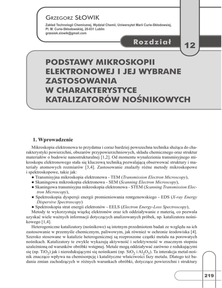 GRZEGORZ SŁOWIK Zakład Technologii Chemicznej, Wydział Chemii, Uniwersytet Marii Curie-Skłodowsiej, Pl. M. Curie-Skłodowskiej, 20-031 Lublin [email protected] Rozdział 12 PODSTAWY MIKROSKOPII ELEKTRONOWEJ I JEJ WYBRANE ZASTOSOWANIA W CHARAKTERYSTYCE KATALIZATORÓW NOŚNIKOWYCH 1. Wprowadzenie Mikroskopia elektronowa to przydatna i coraz bardziej powszechna technika służąca do charakterystyki powierzchni, obszarów przypowierzchniowych, składu chemicznego oraz struktur materiałów o budowie nanostrukturalnej [1,2]. Od momentu wynalezienia transmisyjnego mikroskopu elektronowego stała się kluczową techniką pozwalającą obserwować struktury i materiały atomowych rozmiarów [3,4]. Zastosowanie znalazły różne metody mikroskopowe i spektroskopowe, takie jak: ● Transmisyjna mikroskopia elektronowa - TEM (Transmission Electron Microscopy), ● Skaningowa mikroskopia elektronowa - SEM (Scanning Electron Microscopy), ● Skaningowa transmisyjna mikroskopia elektronowa - STEM (Scanning Transmission Electron Microscopy), ● Spektroskopia dyspersji energii promieniowania rentgenowskiego - EDS (X-ray Energy Dispersive Spectroscopy) ● Spektroskopia strat energii elektronów - EELS (Electron Energy-Loss Spectroscopy), Metody te wykorzystują wiązkę elektronów oraz ich oddziaływanie z materią, co pozwala uzyskać wiele ważnych informacji dotyczących analizowanych próbek, np. katalizatora nośnikowego [1,4]. Heterogeniczne katalizatory (nośnikowe) są istotnym przedmiotem badań ze względu na ich zastosowanie w przemyśle chemicznym, paliwowym, jak również w ochronie środowiska [4]. Szeroko stosowane w katalizie heterogenicznej są rozproszone cząstki metalu na porowatych nośnikach. Katalizatory te zwykle wykazują aktywność i selektywność w znacznym stopniu uzależnioną od warunków obróbki wstępnej. Metale mogą oddziaływać zarówno z redukującymi się (np. TiO2) jak i nieredukującymi się nośnikami (np. SiO2 i Al2O3). Ta interakcja metal-nośnik znacząco wpływa na chemisorpcję i katalityczne właściwości fazy metalu. Dlatego też badania zmian zachodzących w różnych warunkach obróbki, dotyczące powierzchni i struktury 219 Grzegorz SŁOWIK wewnętrznej, morfologii oraz struktury elektronowej, mają kluczowe znaczenie w wyjaśnieniu mechanizmu interakcji metal-nośnik, a także korelacji między strukturą a katalitycznymi właściwościami [5]. Główny wpływ na właściwości katalityczne katalizatora wywierają: struktura warstwy powierzchniowej fazy biorącej udział w reakcji oraz zjawiska, które na niej zachodzą podczas kontaktu z reagentami [6]. Wydajność materiałów katalitycznych zwykle zależy od precyzyjnej struktury atomowej i składu bardzo specyficznych miejsc aktywnych katalitycznie. Tym samym, konieczne staje się przeprowadzenie w układzie heterogenicznego katalizatora charakterystyki strukturalnej i chemicznej w skali atomowej w celu zidentyfikowania wszelkich istniejących struktur i relacji chemicznych [7]. Wraz z poprawą rozdzielczości mikroskopów możliwe jest obecnie bezpośrednie obrazowanie złożonych nanostruktur materiałów katalitycznych [3]. Dzięki zastosowaniu nowoczesnych metod aparaturowych, wykorzystujących różne zjawiska fizyczne, a zwłaszcza mikroskopii elektronowej, możliwe jest bliższe poznanie budowy powierzchni ciał stałych [7], a także niektórych podstawowych zjawisk na nich zachodzących [6]. Dlatego też mikroskopia elektronowa jest niewątpliwie jednym z najważniejszych narzędzi stosowanych w charakterystyce katalizatorów nośnikowych [3]. 2. Mikroskop elektronowy 2.1 Ogólne informacje o mikroskopie elektronowym Pierwszy transmisyjny mikroskop elektronowy (TEM) został zbudowany przez Ernsta Ruska i Maxa Knolla w Berlinie w latach 1931-1934 [8]. W roku 1986 Ruska za swój wynalazek otrzymał nagrodę Nobla z fizyki [3,9]. Często mikroskop elektronowy jest porównywany do optycznego, ponieważ zarówno optyka w mikroskopii elektronowej jak i mikroskopii świetlnej są podobne do siebie [1,9]. Jednakże, istnieją między nimi pewne różnice. Przyspieszane elektrony posiadają o wiele mniejszą długość fali niż długość fali światła widzialnego, bądź fotonów promieniowania UV, dzięki czemu mikroskopia elektronowa pozwala uzyskać dużo większą rozdzielczość w porównaniu do mikroskopii świetlnej. Kolejną istotną różnicą jest to, że elektrony oddziałują z materią znacznie silniej niż fotony [1], przez co konieczne jest stosowanie próżni [9], co najmniej 10-4 Pa. Elektrony posiadają ładunek, dlatego też ich wiązka może zostać zogniskowana poprzez zastosowanie pola elektrycznego bądź magnetycznego. Wykorzystując pole elektrostatyczne, zogniskowaną wiązkę elektronów można w prosty sposób kontrolować [1]. Podstawowym elementem mikroskopu elektronowego jest kolumna zawierająca źródło elektronów (z którego emitowane są elektrony). Wstępnie ukształtowana wiązka elektronów w obszarze między katodą a anodą, zostaje rozpędzona uzyskując energię: E = eU (1) (gdzie e – ładunek elektronu, U – napięcie między katodą a anodą) [10]. Poprzez wzrost napięcia zwiększamy pęd elektronów, a to powoduje zmniejszenie długości fali. Obecność wysokiej próżni w kolumnie pozwala na swobodne poruszanie się elektronów od działa do ekranu. Zastosowanie soczewek magnetycznych pozwala na płynną zmianę biegu elektronów. Wiązka rozpędzonych elektronów padająca na próbkę wywołuje szereg efektów, wykorzystywanych w różnych aparaturach badawczych. Część z elektronów przechodzi przez preparat, a następnie skupiana jest przez układ trzech soczewek: obiektywową, pośrednią i projekcyjną. W dalszej kolejności elektrony przechodzą przez przesłonę i trafiają na ekran fluoroscencyjny [11]. W zależności od tego czy jest to mikroskop transmisyjny czy skaningowy, zasada działania i elementy budowy w pewnym st