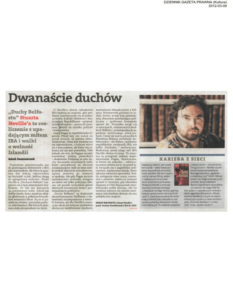 DZIENNIK GAZETA PRAWNA (Kultura) 2012-03-09 Dwanaście duchów U Neville'a dawni członkowie IRA tęsknią za czasami, gdy pro blemy rozwiązywało się za pomo cą bomb, koktajli Mołotowa i bro ni palnej. Republikanie - przynaj mniej oficjalnie - porzucili prze moc, weszli na ścieżkę polityki i kompromisu. Carry Fegan to republikańska le genda. Przed laty nie wahał się przed niczym, za sprawę odsie dział swoje. Teraz jest starzejącym się samotnikiem, o którym mówi się z szacunkiem, ale który też ni komu już nie jest potrzebny. Nikt jednak nie wie, że Fegana zaczęły nawiedzać widma przeszłości - dosłownie. Podążają za nim du Jakub Demiańcznk chy dwunastu niewinnych osób, Popkultura przyzwyczaiła nas które zamordował na zlecenie do postrzegania terrorystów z IRA zwierzchników. Jeśli on teraz zabi jako bojowników, dla których prze je swoich dawnych mocodawców, moc jest jedyną odpowiedzią upiory zostawią go wreszcie na brytyjski ucisk, jedyną drogą w spokoju. Ale gdy Fegan zacznie do upragnionej wolności. Stuart wyrównywać rachunki, ściągnie Neville w „Duchach Belfastu" roz na siebie nie tylko policyjną obła prawia się z tym stereotypem bez wę, ale przede wszystkim gniew litośnie. Tu nie ma gotowych dawnych towarzyszy broni i pro na poświęcenie ludzi, takich jak minentnych polityków. Bobby Sands, który zmarł po straj „Duchy Belfastu" są doskonale ku głodowym w północnoirlandz- skonstruowanym thrillerem z ele kim więzieniu Maże. Są za to pa mentami zaczerpniętymi z estety zerni na władzę i pieniądze polity ki horroru, ale dla Neville'a sensa cy oraz bandyci, dla których prze cyjna akcja jest jedynie pretekstem moc stała się sposobem na życie. służącym wnikliwemu zbadaniu „Duchy Belfastu" Stuarta Neville'a to roz liczenie i upadającym mitem IRA i walki o wolność Irlandii mentalności Irlandczyków z Pół nocy. Bohaterowie powieści to lu dzie, którzy wciąż żyją przeszło ścią, obsesyjnie powtarzający poli tyczne i społeczne komunały sprzed lat. Wszystko toczy się w mrocznych, zaśmieconych zauł kach Belfastu i przesiąkniętych za pachem zwietrzałego piwa pu bach. Unosi się nad tą prozą duch Brendana Behana (notabene dublińczyka) - ale Behan, radykalny republikanin, zwolennik IRA, nie byłby „Duchami..." zachwycony. Budowany przez niego mit IRA Neville obraca w ruinę. Tu wszy scy są przegrani: nękany wspo mnieniami Fegan, dziewczyna, w której się zakocha - odrzuco na przez rodzinę za to, że przed la ty związała się z angielskim poli cjantem, zapijaczony ksiądz, który zdradza tajemnice spowiedzi. Każ dy pielęgnuje stare urazy, rozma wia o zemście, tęskni za czasami sprzed 11 września, gdy irlandzka diaspora w USA finansowała repu blikańską walkę zbrojną. Ale im bardziej nakręca się spirala prze mocy, tym bardziej okazuje się ona pułapką bez wyjścia. DUCHY BELFASTU | Stuart Neville | przeł. Tomasz Konatkowski | W.A.B. 2012 KARIERA Z SIECI Najlepszy debiut, jaki czyta łem od lat - takie hasło po jawia się podczas promocji wielu tytułów. Ale tym razem użył je James Ellroy, jeden z najlepszych amerykań skich autorów kryminałów. Obdarzył Neville'a entuzja styczną recenzją (dodając: „Uważajcie na tego faceta, gdy bę dziecie spacerować ciemnymi uli cami"), choć jeszcze parę lat wcze śniej o Irlandczyku słyszeli co naj wyżej czytelnicy literackich zinów internetowych. To właśnie na jednej z takich stron - a konkretnie ThugLit.com - Neville opubli kował swoje opowiadanie. Wynagrodzeniem, zgodnie z obietnicą, był T-shirt. Młody pisarz nie mógł przecież prze widzieć, że po zaledwie dwóch tygodniach od publika cji napisze do niego Nat Sobel, jeden z największych nowojor skich agentów literackich. Wtedy kariera Neville'a ruszyła na dobre. Irlandczyk wydal już dwie kontynu acje „Duchów Belfastu" („Collusion" oraz „Stolen Souls"). PfitTIT Belfastu