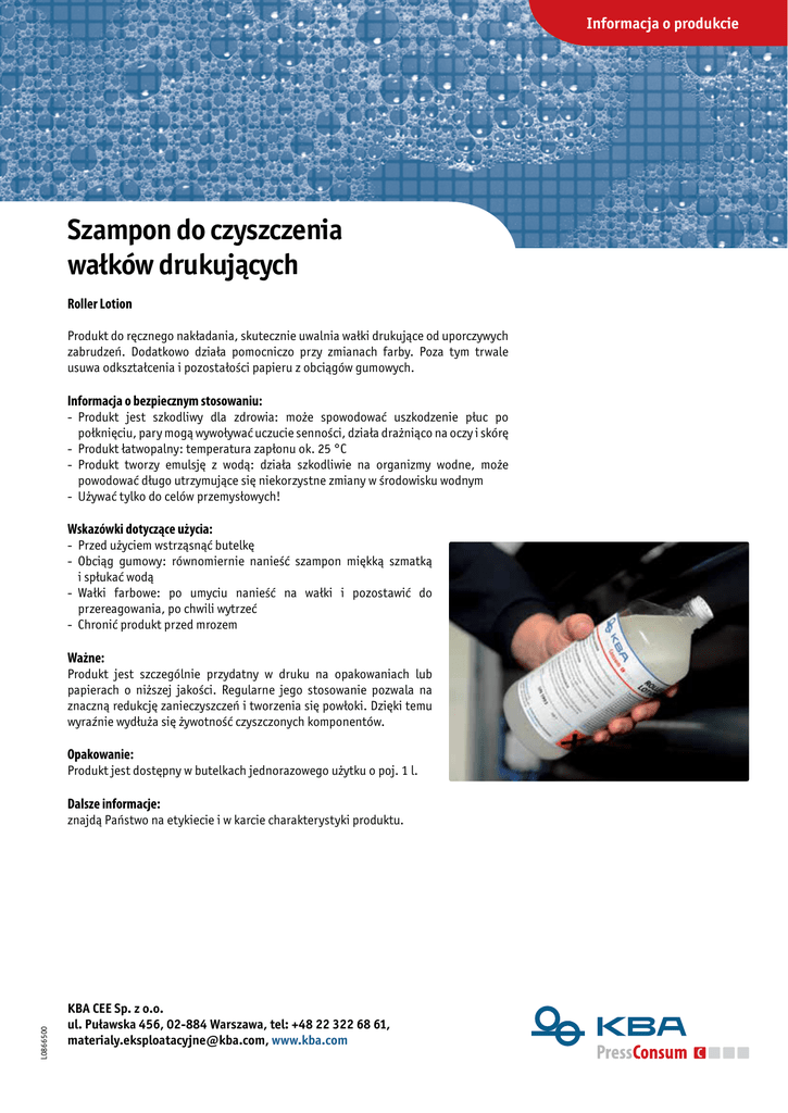 Informacja o produkcie Szampon do czyszczenia Roller Lotion wałków drukujących Roller Lotion Produkt do ręcznego nakładania, skutecznie uwalnia wałki drukujące od uporczywych zabrudzeń. Dodatkowo działa pomocniczo przy zmianach farby. Poza tym trwale usuwa odkształcenia i pozostałości papieru z obciągów gumowych. Informacja o bezpiecznym stosowaniu: - Produkt jest szkodliwy dla zdrowia: może spowodować uszkodzenie płuc po połknięciu, pary mogą wywoływać uczucie senności, działa drażniąco na oczy i skórę - Produkt łatwopalny: temperatura zapłonu ok. 25 °C -Produkt tworzy emulsję z wodą: działa szkodliwie na organizmy wodne, może powodować długo utrzymujące się niekorzystne zmiany w środowisku wodnym - Używać tylko do celów przemysłowych! Wskazówki dotyczące użycia: - Przed użyciem wstrząsnąć butelkę -Obciąg gumowy: równomiernie nanieść szampon miękką szmatką i spłukać wodą - Wałki farbowe: po umyciu nanieść na wałki i pozostawić do przereagowania, po chwili wytrzeć - Chronić produkt przed mrozem Ważne: Produkt jest szczególnie przydatny w druku na opakowaniach lub papierach o niższej jakości. Regularne jego stosowanie pozwala na znaczną redukcję zanieczyszczeń i tworzenia się powłoki. Dzięki temu wyraźnie wydłuża się żywotność czyszczonych komponentów. Opakowanie: Produkt jest dostępny w butelkach jednorazowego użytku o poj. 1 l. Dalsze informacje: L0866500 znajdą Państwo na etykiecie i w karcie charakterystyki produktu. KBA CEE Sp. z o.o. ul. Puławska 456, 02-884 Warszawa, tel: +48 22 322 68 61, [email protected], www.kba.com