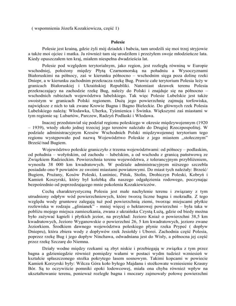 ( wspomnienia Józefa Kozakiewicza, część 1) Polesie Polesie jest krainą, gdzie żyli mój dziadek i babcia, tam urodzili się moi trzej stryjowie a także moi ojciec i matka. Ja również tam się urodziłem i przeżyłem swoje młodzieńcze lata. Kiedy opuszczałem ten kraj, miałem niespełna dwadzieścia lat. Polesie pod względem terytorialnym, jako region, jest rozległą równiną w Europie wschodniej, położony między Płytą Czarnomorską na południu a Wysoczyznami Białoruskimi na północy, zaś w kierunku północno – wschodnim sięga poza dolinę rzeki Dniepr, a w kierunku zachodnim przekracza rzekę Bug. Prawie całe terytorium Polesia leży w granicach Białoruskiej i Ukraińskiej Republiki. Natomiast skrawek terenu Polesia przekraczający na zachodzie rzekę Bug, należy do Polski i znajduje się na północno – wschodnich rubieżach województwa lubelskiego. Tak więc Polesie Lubelskie jest także swoistym w granicach Polski regionem. Dużą jego powierzchnię zajmują torfowiska, największe z nich to tak zwane Krowie Bagna i Bagno Bieleckie. Do głównych rzek Polesia Lubelskiego należą: Włodawka, Uherka, Tyśmienica i Świnka. Większymi zaś miastami w tym regionie są: Lubartów, Parczew, Radzyń Podlaski i Włodawa. Inaczej przedstawiał się podział regionu poleskiego w okresie międzywojennym (1920 – 1939), wtedy około jednej trzeciej jego terenów należało do Drugiej Rzeczpospolitej. W podziale administracyjnym Kresów Wschodnich Polski międzywojennej terytorium tego regionu występowało pod nazwą Województwo Poleskie z jego miastem ,,stołecznym” Brześć/nad Bugiem. Województwo poleskie graniczyło z trzema województwami: od północy – podlaskim, od południa – wołyńskim, od zachodu – lubelskim, a od wschodu z granicą państwową ze Związkiem Radzieckim. Powierzchnia terenu województwa, z tolerancyjnym przybliżeniem, wynosiła 38 000 km kwadratowych. W podziale administracyjnym niższego szczebla posiadało ono 9 powiatów ze swoimi miastami powiatowymi. Do miast tych należały: Brześć/ Bugiem, Prużany, Kosów Poleski, Łuniniec, Pińsk, Stolin, Drohiczyn Poleski, Kobryń i Kamień Koszyrski, który był kolebką dla naszego odgałęzienia rodowego, poczynając bezpośrednio od poprzedzającego mnie pokolenia Kozakiewiczów. Cechą charakterystyczną Polesia jest małe nachylenie terenu i związany z tym utrudniony odpływ wód powierzchniowych, które tworzą liczne bagna i mokradła. Z tego względu wody gruntowe zalegają tuż pod powierzchnią ziemi, tworząc miejscami płytkie rozlewiska w rodzaju ,,glinianek” - mniej więcej o hektarowej powierzchni – była taka w pobliżu mojego miejsca zamieszkania, zwana z ukraińska Czystą Łużą, gdzie od biedy można było zażywać kąpieli i płytkich jezior, na przykład: Jezioro Kniaź o powierzchni 38,5 km kwadratowych, Jezioro Wyganowskie o powierzchni 26, 5 km kwadratowych, jezioro zwane Jeziorkiem. Środkiem dawnego województwa poleskiego płynie rzeka Prypeć ( dopływ Dniepru), która zbiera wody z dopływów rzek Jesiołdy i Uborei. Zachodnia część Polesia, poprzez rzekę Bug i jego dopływ Ninchawa, odwadniana jest do Wisły, a północna jej część przez rzekę Szczarę do Niemna. Działy wodne między rzekami są zbyt niskie i przebiegają w związku z tym przez bagna a gdzieniegdzie również pomiędzy wałami w postaci wydm tudzież wzniesień w kształcie spłaszczonego stożka pokrytego lasem sosnowym. Takimi kopcami w powiecie Kamień Korzyrski były: Wilcza Góra koło byłego Majdanu i stożkowate wzniesienie Krasny Bór. Są to oczywiście pomniki epoki lodowcowej, miała ona chyba również wpływ na ukształtowanie terenu, ponieważ rozległe bagna i moczary zajmowały połowę powierzchni Polesia. Oprócz bagien i torfowisk, charakterystycznym składnikiem krajobrazu Polesia, były lasy w postaci borów sosnowych rosnące na terenach piaszczystych. Na terenach podmokłych, głównie bagiennych, występowały drzewa liściaste jak olszyna typowa, często z domieszką brzozy omszonej. Drzewa te rosły zwykle na wzniesieniach, pomiędzy którymi teren zalany był wodą. Były tam też skupiska lasów jesionowych i świerkowych, lecz zajmowały one zwykle tereny mniej zabagnione i rosły na żyźniejszych glebach niż poprzednie. Poza tym występowały tam jesion wyniosły, dąb, grab, które stanowiły kompozycję lasów mieszanych. Podszyt leśny stanowiły wierzba szara i uszata, zwłaszcza wierzba szara występowała na zalewiskach torfowych niskich, także czeremcha, leszczyna, kruszyna, wiąz, kalina, chmiel, łoza w swoich obszernych zaroślach łozowych i wiele innych. Wśród roślinności bagiennej występowała jeszcze wierzba i brzoza karłowata, takie, jakie rosną w podbiegunowej tundrze. W południowej części Polesia spotykało się dość dużo krzewów różanecznika żółtego, który niegdyś należał do roślinności Błot Pontyjskich w środkowej części Włoch, na wybrzeżu Morza Tyrreńskiego. Jagody z różanecznika żółtego podobne są do jagody czarnej (czernica), lecz rosną na wyższym krzewie. Owoc ten jest dość smaczny, nazywany był włochaczem, a nazwa ta kojarzy się z Włochami. Jagód tych na terenie Polski nigdzie się nie spotyka. Na terenach podwyższonych, międzybagiennych i łąkowych, pokaźne zagęszczenia lasów mieszanych dawały dość wysokopienne krzewy leszczyny. Sprzyjający klimat i warunki naturalne były powodem, że rodziły one mnóstwo orzechów. Na leszczynach była masa owoców występujących w postaci zwartych jakby szyszek (szyszaki) od dwóch do sześciu orzechów, razem połączonych kielichami zielonych łupin, które wyrastały z jednego pędu na gałęzi. Kto miał czas i chęci do zabawienia się w wiewiórkę, mógł nazbierać w ciągu jednego sezonu i nagromadzić na zapas ponad sto kilogramów orzechów laskowych. Ponadto w lasach było dużo różnego rodzaju 
