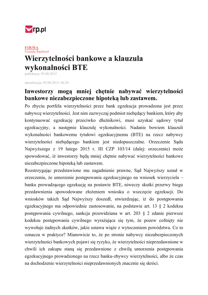 FIRMA Urszula Rachwol Wierzytelności bankowe a klauzula wykonalności BTE publikacja: 05.08.2015 aktualizacja: 05.08.2015, 06:20 Inwestorzy mogą mniej chętnie nabywać wierzytelności bankowe niezabezpieczone hipoteką lub zastawem. Po zbyciu portfela wierzytelności przez bank egzekucja prowadzona jest przez nabywcę wierzytelności. Jest nim zazwyczaj podmiot niebędący bankiem, który aby kontynuować egzekucję przeciwko dłużnikowi, musi uzyskać sądowy tytuł egzekucyjny, a następnie klauzulę wykonalności. Nadanie bowiem klauzuli wykonalności bankowemu tytułowi egzekucyjnemu (BTE) na rzecz nabywcy wierzytelności niebędącego bankiem jest niedopuszczalne. Orzeczenie Sądu Najwyższego z 19 lutego 2015 r. III CZP 103/14 (dalej: orzeczenie) może spowodować, iż inwestorzy będą mniej chętnie nabywać wierzytelności bankowe niezabezpieczone hipoteką lub zastawem. Rozstrzygając przedstawione mu zagadnienie prawne, Sąd Najwyższy uznał w orzeczeniu, że umorzenie postępowania egzekucyjnego na wniosek wierzyciela – banku prowadzącego egzekucję na postawie BTE, niweczy skutki przerwy biegu przedawnienia spowodowane złożeniem wniosku o wszczęcie egzekucji. Do wniosków takich Sąd Najwyższy doszedł, stwierdzając, iż do postępowania egzekucyjnego ma odpowiednie zastosowanie, na podstawie art. 13 § 2 kodeksu postępowania cywilnego, sankcja przewidziana w art. 203 § 2 zdanie pierwsze kodeksu postępowania cywilnego wyrażająca się tym, że pozew cofnięty nie wywołuje żadnych skutków, jakie ustawa wiąże z wytoczeniem powództwa. Co to oznacza w praktyce? Mianowicie to, że po stronie nabywcy niezabezpieczonych wierzytelności bankowych pojawi się ryzyko, że wierzytelności nieprzedawnione w chwili ich zakupu staną się przedawnione z chwilą umorzenia postępowania egzekucyjnego prowadzonego na rzecz banku-zbywcy wierzytelności, albo że czas na dochodzenie wierzytelności nieprzedawnionych znacznie się skróci. O co chodziło W sprawie, która była podstawą wydania orzeczenia, bank po uzyskaniu klauzuli wykonalności na bankowym tytule egzekucyjnym wszczął postępowanie egzekucyjne egzekucyjnego przeciwko swojemu bank sekurytyzacyjnemu. zbył dłużnikowi. dochodzoną Uwzględniając stanowisko W trakcie postępowania wierzytelność funduszowi wierzyciela, który nie podtrzymywał woli kontynuowania egzekucji, komornik umorzył postępowanie egzekucyjne na podstawie art. 825 pkt 1 kodeksu postępowania cywilnego. W sprawie doszło zatem do dwukrotnego przerwania biegu przedawnienia – po raz pierwszy, gdy bank złożył do sądu wniosek o nadanie klauzuli wykonalności BTE, oraz ponownie, gdy bank złożył wniosek o wszczęcie egzekucji przeciwko dłużnikowi. Nabywca wierzytelności, mimo że nabył od banku wierzytelność przed upływem trzech lat od dnia, w którym BTE nadano klauzulę wykonalności, zainicjował działania mające na celu dochodzenie wierzytelności od dłużnika po upływie tego terminu. Jego wierzytelność została przez sąd uznana za przedawnioną, gdyż roszczenie z tytułu udzielonego kredytu, jako czynność dokonana w ramach prowadzonej przez bank działalności gospodarczej, podlega na podstawie art. 118 kodeksu cywilnego trzyletniemu terminowi przedawnienia, a powództwo o jej zasądzenie od dłużnika zostało oddalone. Sąd Najwyższy potwierdził w orzeczeniu, że skutek drugiego przerwania biegu przedawnienia został zniwelowany umorzeniem postępowania egzekucyjnego na skutek cofnięcia przez bank wniosku o wszczęcie egzekucji przeciwko dłużnikowi po sprzedaży przez bank wierzytelności tego dłużnika. Termin przedawnienia w tej sprawie został zatem przerwany jedynie złożeniem wniosku o nadanie klauzuli wykonalności BTE, a ponownie rozpoczął on bieg w dniu nadania przez sąd klauzuli wykonalności temu tytułowi egzekucyjnemu. Nie można wykluczyć, że w znacznej liczbie spraw dochodzić będzie do sytuacji, w której inwestor będzie nabywał od banku nieprzedawnioną wierzytelność, która stanie się przedawniona z chwilą umorzenia postępowania egzekucyjnego na wniosek banku-zbywcy wierzytelności. Stanie się tak, gdy na wniosek banku postępowanie egzekucyjne zostanie umorzone po upływie trzech lat od dnia nadania przez sąd klauzuli wykonalności BTE. Inwestor nie będzie wówczas dysponował żadnymi narzędziami do „przedłużenia" terminu przedawnienia nabytej wierzytelności poprzez doprowadzenie do ponownego przerwania jej biegu przedawnienia. Co do zasady bieg przedawnienia przerywa się przez każdą czynność przed organem powołanym do egzekwowania roszczeń przedsięwziętą bezpośrednio w celu zaspokojenia roszczenia. W razie przerwania przedawnienia przedawnienie biegnie na nowo, jeżeli postępowanie zostało zakończone. Umorzenie postępowania egzekucyjnego stanowi jego zakończenie. Jak wynika z orzeczenia, nie każde jednak umorzenie postępowania egzekucyjnego odniesie skutek w postaci przerwania biegu przedawnienia. Orzeczenie dotyczy właśnie sytuacji, w której na skutek umorzenia postępowania egzekucyjnego na wniosek wierzyciela dochodzi do zniweczenia przerwy biegu przedawnienia. W zależności zatem od tego, jaka będzie podstawa umorzenia postępowania egzekucyjnego, nastąpi lub nie skutek przerwania biegu przedawnienia. Wprawdzie umorzenie postępowania egzekucyjnego nie pozbawia nowego wierzyciela możności wszczęcia ponownej egzekucji, chyba że z innych przyczyn będzie ona niedopuszczalna, jednak zniweczenie skutku przerwy biegu przedawnienia powoduje ryzyko, że po upływie terminu przedawnienia ten, przeciwko komu przysługuje roszczenie, może uchylić się od jego zaspokojenia, chyba że zrzeka się korzystania z zarzutu przedawnienia. Jakie konsekwencje W uzasadnieniu orzeczenia Sąd Najwyższy stwierdza, że wbrew pozorom nie stanowi to przesadnego ograniczenia obrotu wierzytelnościami, lecz jest wynikiem koniecznego z punktu widzen