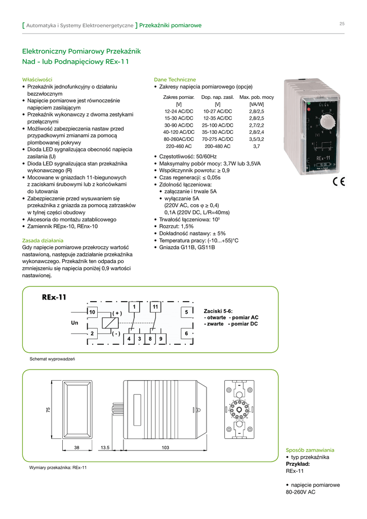 [ Automatyka i Systemy Elektroenergetyczne ] Przekaźniki pomiarowe 25 Elektroniczny Pomiarowy Przekaźnik Nad - lub Podnapięciowy REx-11 Właściwości • Przekaźnik jednofunkcyjny o działaniu bezzwłocznym • Napięcie pomiarowe jest równocześnie napięciem zasilającym • Przekaźnik wykonawczy z dwoma zestykami przełącznymi • Możliwość zabezpieczenia nastaw przed przypadkowymi zmianami za pomocą plombowanej pokrywy • Dioda LED sygnalizująca obecność napięcia zasilania (U) • Dioda LED sygnalizująca stan przekaźnika wykonawczego (R) • Mocowane w gniazdach 11-biegunowych z zaciskami śrubowymi lub z końcówkami do lutowania • Zabezpieczenie przed wysuwaniem się przekaźnika z gniazda za pomocą zatrzasków w tylnej części obudowy • Akcesoria do montażu zatablicowego • Zamiennik REpx-10, REnx-10 Zasada działania Gdy napięcie pomiarowe przekroczy wartość nastawioną, następuje zadziałanie przekaźnika wykonawczego. Przekaźnik ten odpada po zmniejszeniu się napięcia poniżej 0,9 wartości nastawionej. Dane Techniczne • Zakresy napięcia pomiarowego (opcje) Zakres pomiar. [V] 12-24 AC/DC 15-30 AC/DC 30-90 AC/DC 40-120 AC/DC 80-260AC/DC 220-460 AC Dop. nap. zasil. [V] 10-27 AC/DC 12-35 AC/DC 25-100 AC/DC 35-130 AC/DC 70-275 AC/DC 200-480 AC Max. pob. mocy [VA/W] 2,8/2,5 2,8/2,5 2,7/2,2 2,8/2,4 3,5/3,2 3,7 • Częstotliwość: 50/60Hz • Maksymalny pobór mocy: 3,7W lub 3,5VA • Współczynnik powrotu: ≥ 0,9 • Czas regeneracji: ≤ 0,05s • Zdolność łączeniowa: • załączanie i trwale 5A • wyłączanie 5A (220V AC, cos j ≥ 0,4) 0,1A (220V DC, L/R=40ms) • Trwałość łączeniowa: 105 • Rozrzut: 1,5% • Dokładność nastawy: ± 5% • Temperatura pracy: (-10...+55)°C • Gniazda G11B, GS11B Schemat wyprowadzeń Wymiary przekaźnika: REx-11 Sposób zamawiania • typ przekaźnika Przykład: REx-11 • napięcie pomiarowe 80-260V AC [ Automatyka i Systemy Elektroenergetyczne ] Przekaźniki pomiarowe 26 Elektroniczny Pomiarowy Przekaźnik Nad - i Podnapięciowy REx-20 Właściwości • Dwa tryby pracy; działanie bezzwłoczne • Przekaźnik wykonawczy z dwoma zestykami przełącznymi • Cztery wersje napięciowe • Niezależna nastawa napięć pomiarowych U1 i U2 • Możliwość zabezpieczenia nastaw przed przypadkowymi zmianami za pomocą plombowanej pokrywy • Dioda LED (U2) sygnalizująca przekroczenie napięcia pomiarowego powyżej wartości U2 • Dioda LED sygnalizująca stan przekaźnika wykonawczego (R) • Dioda LED (U1) sygnalizująca spadek napięcia pomiarowego poniżej wartości U1 • Mocowane w gniazdach 11-biegunowych z zaciskami śrubowymi lub końcówkami do lutowania • Zabezpieczenie przed wysuwaniem się przekaźnika z gniazda za pomocą zatrzasków w tylnej części obudowy • Akcesoria do montażu zatablicowego Dane Techniczne • Zakresy napięcia pomiarowego oraz maksymalny pobór mocy Zakres pomiar. [V] 15-30 AC/DC 30-90 AC/DC 40-120 AC/DC 80-260 AC/DC 220-460 AC Dop. nap. zasil. [V] 12-35 AC/DC 25-100 AC/DC 35-130 AC/DC 70-275 AC/DC 200-480 AC Max. pob. mocy [VA/W] 2,8/2,5 2,7/2,2 2,8/2,4 3,5/3,2 3,7 • Częstotliwość: 50/60Hz • Współczynnik powrotu: ≥ 0,9 • Czas regeneracji: < 0,05s • Zdolność łączeniowa: • załączanie i trwale 5A • wyłączanie 5A (220V AC, cos j ≥ 0,4) 0,1A (220V DC, L/R=40ms) • Trwałość łączeniowa: 105 • Rozrzut: 1,5% • Dokładność nastawy: ± 10% • Temperatura pracy: (-10...+55)°C • Gniazda G11B, GS11B Zasada działania Tryb „okienkowy” (5 i 7 rozwarte). Przekaźnik wykonawczy zostaje pobudzony gdy wartość napięcia pomiarowego (zasilania) znajdzie się w przedziale U1<Upom<U2. Gdy wartość napięcia pomiarowego spadnie poniżej U1 lub podniesie się powyżej U2 następuje odwzbudzenie przekaźnika wykonawczego. Tryb z jednym napięciem pomiarowym (5 i 7 zwarte). Blokowanie działania przekaźnika dla napięcia U2. Przekaźnik wykonawczy zostaje pobudzony, jeśli wartość napięcia pomiarowego przekroczy nastawioną wartość U1. Niezależna nastawa napięć pomiarowych U1 i U2. Schemat wyprowadzeń Sposób zamawiania • typ przekaźnika Przykład: REx-20 • napięcie zasilania 30-90V AC/DC Wymiary przekaźnika: REx-20 [ Automatyka i Systemy Elektroenergetyczne ] Przekaźniki pomiarowe 27 Elektroniczny Przekaźnik Czasowy Nad - i Podnapięciowy REx-30 Właściwości • Dwa tryby pracy; działanie bezzwłoczne • Przekaźnik wykonawczy z dwoma zestykami przełącznymi • Trzy wersje napięciowe • Nastawa napięć pomiarowych U1 i U2 oddzielnymi potencjometrami • Dioda LED (U2) sygnalizująca przekroczenie napięcia pomiarowego powyżej wartości U2 • Dioda LED sygnalizująca stan przekaźnika wykonawczego (R) • Dioda LED (U1) sygnalizująca spadek napięcia pomiarowego poniżej wartości U1 • Montaż na szynie 35mm Dane Techniczne • Zakresy napięcia pomiarowego oraz maksymalny pobór mocy Zakres pomiar. [V] 15-30 AC/DC 30-90 AC/DC 40-120 AC/DC 80-260 AC/DC Dop. nap. zasil. [V] 12-35 AC/DC 25-100 AC/DC 35-130 AC/DC 70-275 AC/DC Max. pob. mocy [VA/W] 2,8/2,5 2,7/2,2 2,8/2,4 3,5/3,2 • Częstotliwość: 50/60Hz • Współczynnik powrotu: ≥ 0,9 • Czas regeneracji: < 0,05s • Zdolność łączeniowa: • załączanie i trwale 5A • wyłączanie 5A (220V AC, cos j ≥ 0,4) 0,1A (220V DC, L/R=40ms) • Trwałość łączeniowa: 105 • Rozrzut: 1,5% • Dokładność nastawy: ± 10% • Temperatura pracy: (-10...+55)°C Zasada działania Tryb „okienkowy” (P i S rozwarte) Przekaźnik wykonawczy zostaje pobudzony gdy wartość napięcia pomiarowego (zasilającego) znajdzie się w przedziale U1<Upom<U2. Gdy wartość napięcia pomiarowego spadnie poniżej U1 lub podniesie się powyżej U2 następuje odwzbudzenie przekaźnika wykonawczego. Tryb z jednym napięciem pomiarowym (P i S zwarte). Blokowanie działania przekaźnika dla napięcia U2. Przekaźnik wykonawczy zostaje pobudzony, jeśli wartość