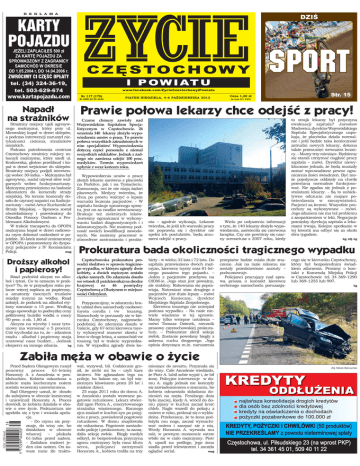 R E K L A M A C Z Ę S TO C H O W Y I P O W I AT U www.facebook.com/ZycieCzestochowyiPowiatu Nr 117 (170) Nr ISSN 22 99 4440 Napadł na strażników Strażnicy miejscy ujęli agresywnego mężczyznę, który przy ul. Mirowskiej kopał w drzwi sklepów, a podczas interwencji naruszył nietykalności cielesną strażników miejskich. Podczas patrolowania centrum Częstochowy strażnicy miejscy zobaczyli mężczyznę, który szedł ul. Krakowską, głośno przeklinał i kopał w drzwi wejściowe do sklepów. Strażnicy miejscy podjęli interwencję wobec 30-latka. – Mężczyzna był agresywny, nadal używał słów wulgarnych wobec funkcjonariuszy. Mężczyznę przewieziono na badanie alkomatem do komendy straży miejskiej. Na terenie komendy doszło do czynnej napaści na funkcjonariuszy – mówi Artur Kucharski ze Straży Miejskiej. – Sprawca został obezwładniony i przewieziony do Ośrodka Pomocy Osobom z Problemami Alkoholowymi. W trakcie transportu do OPOPA mężczyzna kopał w drzwi radiowozu czym dokonał uszkodzeń w pojeździe. 30-latek został umieszczony w OPOPA i pozostawiony do dyspozycji policjantów z IV Komisariatu mag Policji. Droższy alkohol i papierosy! Rząd podniósł akcyzę na alkohol i tytoń. Co to oznacza w praktyce? To, że w przyszłym roku palacze więcej zapłacą za papierosy, a amatorzy mocnych trunków między innymi za wódkę. Rząd założył, że podatek na alkohol etylowy wzrośnie o 15 proc. Według niego spowoduje to podwyżkę ceny półlitrowej butelki wódki o mocy 40 proc. o ok. 1,80 zł. Akcyza na wyroby i susz tytoniowy ma wzrosnąć o 5 procent. Cóż wychodzi na to, że - zdaniem rządu - alkohol i papierosy mają uratować nasz budżet... Jednak kg eksperci są innego zdania. PIĄTEK-NIEDZIELA, 4-6 PAŹDZIERNIKA 2013 Cena 1,20 zł Str. 15 (w tym 8% VAT) Prawie połowa lekarzy chce odejść z pracy! Czarne chmury zawisły nad Wojewódzkim Szpitalem Specjalistycznym w Częstochowie. 26 września 140 lekarzy złożyło wypowiedzenia umów o pracę. To prawie połowa wszystkich zatrudnionych w nim specjalistów! Wypowiedzenia dotyczą części personelu z niemal wszystkich oddziałów. Jednak z żadnego nie zamierza odejść 100 proc. medyków. Termin wypowiedzeń upłynie z wraz końcem roku. Wypowiedzenia umów o pracę złożyli lekarze zarówno z placówki na Parkitce, jak i na Tysiącleciu. Zaznaczają, oni że nie mają żądań płacowych. Medycy twierdzą, że chcą po prostu walczyć o lepsze warunki leczenia pacjentów. - W szpitalu brakuje sprawnego sprzętu, jest on za rzadko serwisowany. Brakuje też niektórych leków. Jesteśmy ograniczani w wykonywaniu badań diagnostycznych i i laboratoryjnych. Nie możemy podnosić swoich kwalifikacji zawodowych. Nie możemy pracować w atmosferze zastraszania i poniża- nia – zgodnie wyliczają. Lekarze twierdzą, że jeśli ich warunki pracy nie poprawią się i dyrektor nie spełni ich postulatów, będą zmuszeni odejść z pracy. Wielu po usłyszeniu informacji o tym, że 140 lekarzy złożyło wypowiedzenia, zaświeciła się czerwona lampka. Czy nie powtórzy się czarny scenariusz z 2007 roku, kiedy to strajk lekarzy był przyczyną ewakuacji szpitala? Jarosław Madowicz, dyrektor Wojewódzkiego Szpitala Specjalistycznego uspokaja, że placówka działa normalnie i jeśli będzie taka konieczność zatrudni nowych lekarzy, dokona także przesunięć wewnątrz lecznicy. - Mamy trzy miesiące. Będziemy się starali utrzymać ciągłość pracy szpitala – mówi. Dyrektor niewykluczone jednak, że będą musiały zostać wprowadzone pewne ograniczenia ilości świadczeń. Być może pojedyncze oddziały na chwilę przestaną normalnie funkcjonować. Nie zgadza się jednak z postulatami lekarzy. - Są to subiektywne odczucia nie mające potwierdzenia w rzeczywistości. Pacjenci są leczeni. Wszystkie procedury są wykonywane – mówi. Jego zdaniem nie ma też problemu z zaopatrzeniem w leki. Negocjacje pomiędzy dyrekcją szpitala a lekarzami trwają. Kolejne spotkanie w tej kwestii ma odbyć się za około dwa tygodnie. kg, zdj. kg Prokuratura bada okoliczności tragicznego wypadku Częstochowska prokuratura prowadzi śledztwo w sprawie tragicznego wypadku, w którym zginęły dwie kobiety, a dwóch mężczyzn zostało ciężko rannych. Do zdarzenia doszło we wtorek (1 października) na drodze krajowej nr 46 pomiędzy Częstochową a Olsztynem w miejscowości Odrzykoń. Przypomnijmy, w zdarzeniu brały udział dwa samochody osobowe: toyota corolla i vw touareg. Samochody te poruszały się w kierunku Częstochowy, najprawdopodobniej do zderzenia doszło w trakcie, gdy 67-letni kierowca toyoty wykonywał manewr skrętu w lewo w drogę leśną, a samochód vw touareg był w trakcie wyprzedzania. W wypadku zginęły dwie ko- biety - w wieku 33 lata i 72 lata. Do szpitala przewieziono dwóch mężczyzn, kierowcę toyoty oraz 81-letniego pasażera tego pojazdu. – Jeden z pacjentów przebywa na OIOM-ie. Jego stan jest poważny, ale stabilny. Rokowania się poprawiają. Natomiast stan drugiego z pacjentów jest dużo lepszy – mówi Wojciech Konieczny, dyrektor Miejskiego Szpitala Zespolonego. Kierowca touarega nie ucierpiał podczas wypadku. - Na razie niewiele wiadomo w tej sprawie. Mamy tylko wstępne ustalenia – mówi Tomasz Ozimek, rzecznik prasowy częstochowskiej prokuratury. – Prokurator zlecił sekcję zwłok. Zostanie powołany biegły z zakresu ruchu drogowego. Jego opinia dotycząca m.in. naruszenia przepisów będzie miała duże znaczenie. Jak na razie nikomu nie zostały przedstawione zarzuty – podsumowuje. Policjanci pracujący nad sprawą proszą o kontakt kierowcę srebrnego samochodu poruszają- cego się w kierunku Częstochowy, który był bezpośrednim świadkiem zdarzenia. Prosimy o kontakt z Komendą Miejską Policji w Częstochowie tel. 34 369-1290 lub 369-1255 lub 997. kg Zabiła męża w obawie o życie Przed Sądem Okręgowym ruszył ponowny proces