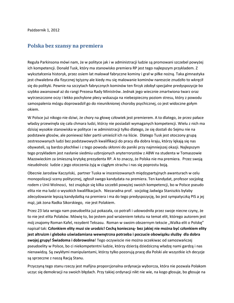 Pażdzernik 1, 2012 Polska bez szansy na premiera Reguła Parkinsona mówi nam, że w polityce jak i w administracji ludzie są promowani szczebel powyżej ich kompetencji. Donald Tusk, który ma stanowisko premiera RP jest tego najlepszym przykladem. Z wykształcenia historyk, przez osiem lat malował fabryczne kominy i grał w piłke nożną. Taka gimnastyka jest chwalebna dla fizycznej tężyzny ale kiedy mu się malowanie kominów nareszcie znudziło to wkręcił się do polityki. Pewnie na szczytach fabrycznych kominów ten fircyk zdobył specjalne predyspozycje bo szybko awansował aż do rangi Prezesa Rady Ministrów. Jednak jego wiecznie zmartwiona twarz oraz wytrzeszczone oczy i lekko pochylone plecy wskazuja na niebezpieczny poziom stresu, który z powodu samospalenia mózgu doprowadził go do nieuniknionej choroby psychicznej, co jest widoczne gołym okiem. W Polsce już nikogo nie dziwi, że chory na głowę człowiek jest premierem. A to dlatego, że przez pałace władzy przewinęła się cała chmara ludzi, którzy nie posiadali wymaganych kompetencji. Wielu z nich ma dzisiaj wysokie stanowiska w polityce i w administracji tylko dlatego, że się dostali do Sejmu nie na podstawie głosów, ale ponieważ lider partii umieścił ich na liście. Dlatego Tusk jest otoczony grupą zestresowanych ludzi bez podstawowych kwalifikacji do pracy dla dobra kraju, którzy lękają się nas obywateli, są bardzo płochliwi i z tego powodu skłonni do paniki przy najmniejszej okazji. Najlepszym tego przykładem jest nasłanie siedmiu uzbrojonych anyterrorystów z ABW na studenta w Tomaszowie Mazowieckim za śmieszną krytykę prezydenta RP. A to znaczy, że Polska nie ma premiera. Przez swoją nieudolnośc ludzie z jego otoczenia żyją w ciągłym strachu i nas się poprostu boją. Obecnie Jarosław Kaczyński, partner Tuska w inscenizowanych międzypartyjnych awanturach w celu monopolizacji sceny politycznej, zgłosił swego kandydata na premiera. Ten kandydat, profesor socjolog rodem z Unii Wolnosci, też znajduje się kilka szczebli powyżej swoich kompetencji, bo w Polsce pseudo elita nie ma ludzi o wysokich kwalifikacjach. Niezaradna prof. socjolog Jadwiga Staniszkis byłaby zdecydowanie lepszą kandydatką na premiera i ma do tego predyspozycję, bo jest sympatyczką PIS a jej mąż, jak żona Radka Sikorskiego, nie jest Polakiem. Przez 23 lata wroga nam pseudoelita już pokazała, co potrafi i udowodniła przez swoje niecne czyny, że to nie jest elita Polaków. Mówię to, bo jestem pod wrażeniem tekstu na temat elit, którego autorem jest mój znajomy Roman Kafel, rezydent Teksasu. Roman w swoim obszernym tekscie „Walka elit o Polskę” napisał tak: Członkiem elity musi sie urodzic! Cechą konieczną- bez jakiej nie można być członkiem elity jest altruizm i gleboko uświadamiana wewnętrzna potrzeba i poczucie obowiązku służby dla dobra swojej grupy! Świadoma i dobrowolna! Tego oczywiscie nie można oczekiwac od samozwańczej pseudoelity w Polsce, bo ci niekompetentni ludzie, którzy dzierżą dziedziczną władzę nami gardzą i nas nienawidzą. Są zwykłymi manipulantami, którzy tylko pozorują pracę dla Polski ale wszystkie ich decyzje są sprzeczne z naszą Racją Stanu. Przyczyną tego stanu rzeczy jest mafijna proporcjonalna ordynacja wyborcza, która nie pozwala Polakom uczyc się demokracji na swoich błędach. Przy takiej ordynacji nikt nie wie, na kogo głosuje, bo głosuje na partię, a nie na konkretnego człowieka, którego zna i który go potem będzie reprezentował w Sejmie. Listę kandydatów układa lider partii według swojego widzimisię. Są to ludzie mierni ale wierni i zawsze głosują według zaleceń ich lidera, bo inaczej nie będą na liście kandydatów w kolejnych wyborach. Ordynacja jednomandatowych okręgów wyborczych (JOW) pozwala ludziom na wybór konkretnych ludzi i ocenę ich pożyteczności oraz lokalne ich rozliczenie przez wybroców. To daje szanse na korektę błedów. Tak się powinna rodzic elita, która rzeczywiscie będzie dla Polski i Polaków opiekuńcza i pożyteczna. Niech teraz wodzowie układu POPIS, Donald Tusk i Jarosław Kaczyński pokażą nam tajne listy swoich kandydatów preferencyjnych w ostatnich wyborach do Sejmu. Niech wyjdzie naga prawda na jaw, bo po ich nazwiskach rozpoznamy jaki to układ, który szybko po wyborach zapomina o ludziach, którzy na te partie bezwiednie głosowali. Oglądałem wyrywkowo u siebie w domu internetową transmisję pochodu „Obudż sie Polsko”. Przypadkowo zobaczyłem przemowę Jarosława Kaczyńskiego. Byłem w szoku, że ten pyszałkowaty, obcy nam kulturowo manipulant, który był naszym śmiertelnym wrogiem w czasie wyborów w 90, 91 i 93 roku bezczelnie przemawia teraz tak, jakby czytał mój program z wyborów na prezydenta, czy też program silnie zwalczanej przez układ Partii X. Jeśli ktoś ma kopie tych programów z pewnością się z tym zgodzi. Wiadomo, że nie ma kary za kradzież programów politycznych, ale ten wcielony diabeł, który nas bardzo nienawidzi ubrał się teraz w ornat i na mszę dzwoni. Propozycja technicznego rządu fachowców wyszła ode mnie już w 90 roku i przez lata była promowana przez Partię X. Jest to dobrze udokumentowane w obszernej broszurze „Polska potrzebuje gospodarza”, wydanej przez Partię X w 1991 roku i ogólnie dostępnej przy dużym nakładzie druku. Kaczyński, który teraz ten program sobie przywłaszczył, już nam pokazał, co potrafi, kiedy był premierem i jak wtedy brutalnie, chwytami poniżej pasa niszczył ruch narodowy w polityce, kiedy to nawet niemoralnie odsunął swoich koalicjantów: Samoobronę i LPR w nicośc, aby partnerstwie PO-PIS nikt nie przeszkadzał. Rodem ze znienawidzonego dziś KOR-u, Kaczyński nosi teraz „biały kapelusz” i krzyczy o sprawiedliwośc dla Polaków a przecież on sam tworzył 23-y lata temu podstawy dzisiejszej biedy, jako współpracownik KOR i uczestnik haniebnych 
