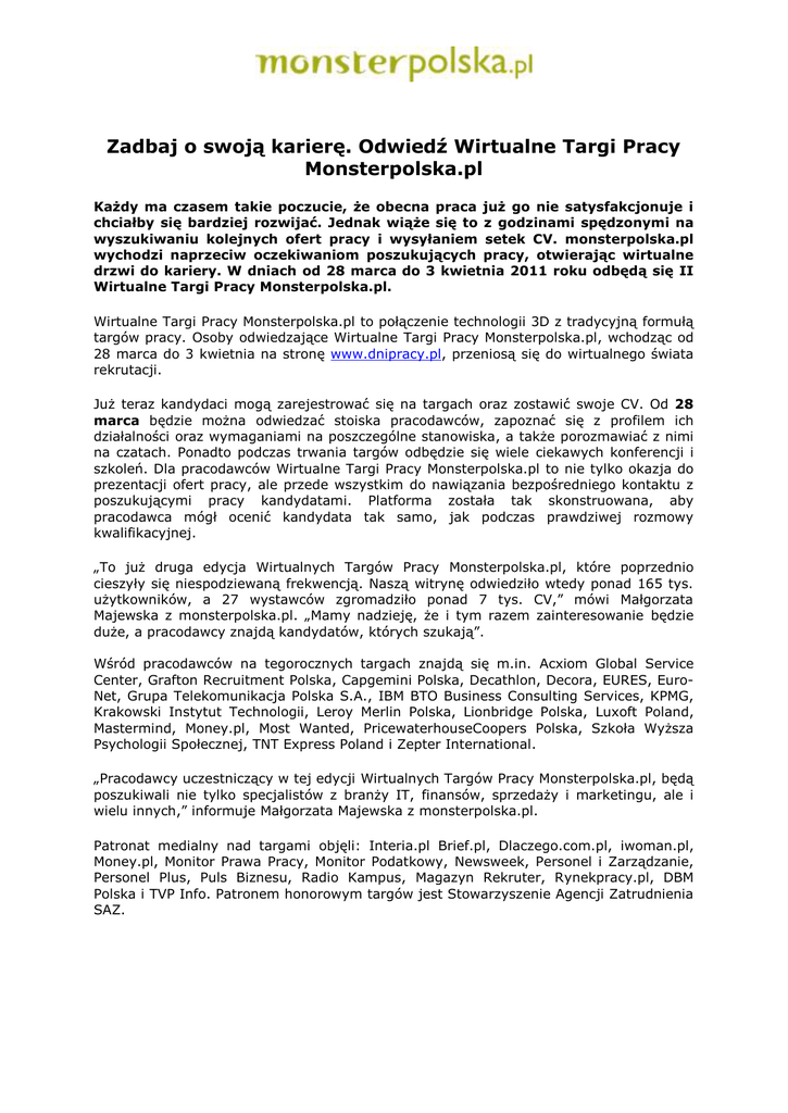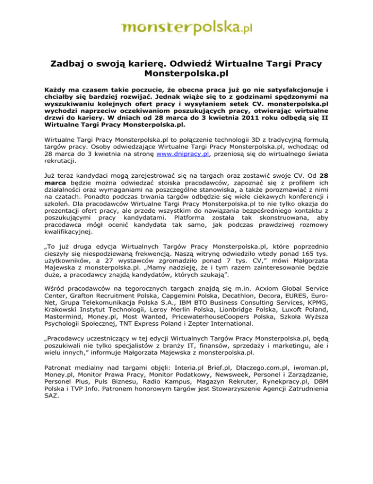 Zadbaj o swoją karierę. Odwiedź Wirtualne Targi Pracy Monsterpolska.pl Każdy ma czasem takie poczucie, że obecna praca już go nie satysfakcjonuje i chciałby się bardziej rozwijać. Jednak wiąże się to z godzinami spędzonymi na wyszukiwaniu kolejnych ofert pracy i wysyłaniem setek CV. monsterpolska.pl wychodzi naprzeciw oczekiwaniom poszukujących pracy, otwierając wirtualne drzwi do kariery. W dniach od 28 marca do 3 kwietnia 2011 roku odbędą się II Wirtualne Targi Pracy Monsterpolska.pl. Wirtualne Targi Pracy Monsterpolska.pl to połączenie technologii 3D z tradycyjną formułą targów pracy. Osoby odwiedzające Wirtualne Targi Pracy Monsterpolska.pl, wchodząc od 28 marca do 3 kwietnia na stronę www.dnipracy.pl, przeniosą się do wirtualnego świata rekrutacji. Już teraz kandydaci mogą zarejestrować się na targach oraz zostawić swoje CV. Od 28 marca będzie można odwiedzać stoiska pracodawców, zapoznać się z profilem ich działalności oraz wymaganiami na poszczególne stanowiska, a także porozmawiać z nimi na czatach. Ponadto podczas trwania targów odbędzie się wiele ciekawych konferencji i szkoleń. Dla pracodawców Wirtualne Targi Pracy Monsterpolska.pl to nie tylko okazja do prezentacji ofert pracy, ale przede wszystkim do nawiązania bezpośredniego kontaktu z poszukującymi pracy kandydatami. Platforma została tak skonstruowana, aby pracodawca mógł ocenić kandydata tak samo, jak podczas prawdziwej rozmowy kwalifikacyjnej. „To już druga edycja Wirtualnych Targów Pracy Monsterpolska.pl, które poprzednio cieszyły się niespodziewaną frekwencją. Naszą witrynę odwiedziło wtedy ponad 165 tys. użytkowników, a 27 wystawców zgromadziło ponad 7 tys. CV,” mówi Małgorzata Majewska z monsterpolska.pl. „Mamy nadzieję, że i tym razem zainteresowanie będzie duże, a pracodawcy znajdą kandydatów, których szukają”. Wśród pracodawców na tegorocznych targach znajdą się m.in. Acxiom Global Service Center, Grafton Recruitment Polska, Capgemini Polska, Decathlon, Decora, EURES, EuroNet, Grupa Telekomunikacja Polska S.A., IBM BTO Business Consulting Services, KPMG, Krakowski Instytut Technologii, Leroy Merlin Polska, Lionbridge Polska, Luxoft Poland, Mastermind, Money.pl, Most Wanted, PricewaterhouseCoopers Polska, Szkoła Wyższa Psychologii Społecznej, TNT Express Poland i Zepter International. „Pracodawcy uczestniczący w tej edycji Wirtualnych Targów Pracy Monsterpolska.pl, będą poszukiwali nie tylko specjalistów z branży IT, finansów, sprzedaży i marketingu, ale i wielu innych,” informuje Małgorzata Majewska z monsterpolska.pl. Patronat medialny nad targami objęli: Interia.pl Brief.pl, Dlaczego.com.pl, iwoman.pl, Money.pl, Monitor Prawa Pracy, Monitor Podatkowy, Newsweek, Personel i Zarządzanie, Personel Plus, Puls Biznesu, Radio Kampus, Magazyn Rekruter, Rynekpracy.pl, DBM Polska i TVP Info. Patronem honorowym targów jest Stowarzyszenie Agencji Zatrudnienia SAZ. Informacje dodatkowe: monsterpolska.pl (Monster Worldwide Polska Sp. z o.o.) to część największego na świecie serwisu kariery monster.com. W Polsce firma jest obecna już od 1999 roku, wcześniej jako jobpilot.pl. Celem monsterpolska.pl jest ułatwienie kontaktu pomiędzy prężnie rozwijającymi się firmami a profesjonalistami. Pracobiorcom, serwis monsterpolska.pl oferuje możliwości rozwoju i kierowania swoją karierą zawodową. Pracodawcom ułatwia poszukiwanie wykwalifikowanych kandydatów. Jest to możliwie dzięki nowoczesnym technologiom i innowacyjnym usługom, usprawniającym proces rekrutacji. Kontakt dla mediów: Ewelina Nowicka Triple PR ul. Elektoralna 24/73 00-892 Warszawa tel. 22 216 54 20; [email protected]