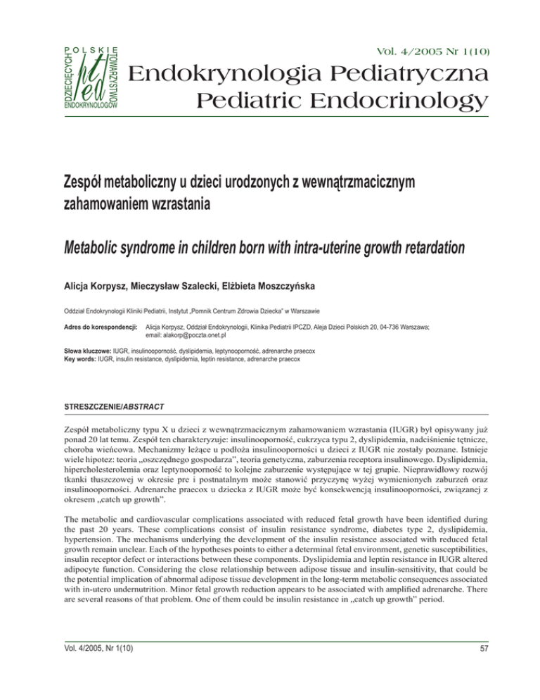 Vol. 4/2005 Nr 1(10) Endokrynologia Pediatryczna Pediatric Endocrinology Zespół metaboliczny u dzieci urodzonych z wewnątrzmacicznym zahamowaniem wzrastania Metabolic syndrome in children born with intra-uterine growth retardation Alicja Korpysz, Mieczysław Szalecki, Elżbieta Moszczyńska Oddział Endokrynologii Kliniki Pediatrii, Instytut „Pomnik Centrum Zdrowia Dziecka” w Warszawie Adres do korespondencji: Alicja Korpysz, Oddział Endokrynologii, Klinika Pediatrii IPCZD, Aleja Dzieci Polskich 20, 04-736 Warszawa; email: [email protected] Słowa kluczowe: IUGR, insulinooporność, dyslipidemia, leptynooporność, adrenarche praecox Key words: IUGR, insulin resistance, dyslipidemia, leptin resistance, adrenarche praecox STRESZCZENIE/ STRESZCZENIE/ABSTRACT Zespół metaboliczny typu X u dzieci z wewnątrzmacicznym zahamowaniem wzrastania (IUGR) był opisywany już ponad 20 lat temu. Zespół ten charakteryzuje: insulinooporność, cukrzyca typu 2, dyslipidemia, nadciśnienie tętnicze, choroba wieńcowa. Mechanizmy leżące u podłoża insulinooporności u dzieci z IUGR nie zostały poznane. Istnieje wiele hipotez: teoria „oszczędnego gospodarza”, teoria genetyczna, zaburzenia receptora insulinowego. Dyslipidemia, hipercholesterolemia oraz leptynooporność to kolejne zaburzenie występujące w tej grupie. Nieprawidłowy rozwój tkanki tłuszczowej w okresie pre i postnatalnym może stanowić przyczynę wyżej wymienionych zaburzeń oraz insulinooporności. Adrenarche praecox u dziecka z IUGR może być konsekwencją insulinooporności, związanej z okresem „catch up growth”. The metabolic and cardiovascular complications associated with reduced fetal growth have been identified during the past 20 years. These complications consist of insulin resistance syndrome, diabetes type 2, dyslipidemia, hypertension. The mechanisms underlying the development of the insulin resistance associated with reduced fetal growth remain unclear. Each of the hypotheses points to either a determinal fetal environment, genetic susceptibilities, insulin receptor defect or interactions between these components. Dyslipidemia and leptin resistance in IUGR altered adipocyte function. Considering the close relationship between adipose tissue and insulin-sensitivity, that could be the potential implication of abnormal adipose tissue development in the long-term metabolic consequences associated with in-utero undernutrition. Minor fetal growth reduction appears to be associated with amplified adrenarche. There are several reasons of that problem. One of them could be insulin resistance in „catch up growth” period. Vol. 4/2005, Nr 1(10) 57 Praca przeglądowa Insulinooporność, hipercholesterolemia, adrenarche praecox stanowią o zespole typu X (zespole metabolicznym) opisywanym wśród dorosłych urodzonych z hipotrofią wewnatrzmaciczną. Zespół metaboliczny typu X charakteryzuje się nadciśnieniem tętniczym, chorobą wieńcową oraz cukrzycą typu 2. Częstość występowania, mechanizm powstawania hipotrofii wewnątrzmacicznej oraz towarzyszącego zaburzenia wzrastania przedstawiono szczegółowo w artykule Czy dystrofia wewnątrzmaciczna (IUGR) jako przyczyna zaburzeń wzrastania u dzieci jest wskazaniem do leczenia hormonem wzrostu?. Wiele prac prospektywnych i retrospektywnych wskazuje na znacznie częstsze występowanie u dorosłych urodzonych z hipotrofią wewnątrzmaciczną nadciśnienia, otyłości, zaburzeń gospodarki lipidowej i węglowodanowej, w tym cukrzycy typu 2, a więc składowych zespołu metabolicznego. W pracy na podstawie najnowszego piśmiennictwa przedstawiamy hipotezy dotyczące mechanizmu powstawania zespołu metabolicznego występującego u osobników urodzonych z wewnątrzmacicznym zahamowaniem wzrastania. Insulinoodporność Przyczyny insulinooporności występujące u dzieci z wewnątrzmacicznym zahamowaniem wzrastania nie są poznane i istnieje wiele hipotez dotyczących jej powstawania [1–19]. Aktualnie w piśmiennictwie dominują: „teoria oszczędnego gospodarza” (thrifty phenotyp), teoria genetyczna, oporność receptora insulinowego oraz nieprawidłowy skład masy ciała z przewagą tkanki tłuszczowej, powstający w okresie „catch up growth”. Hipoteza „thrifty phenotyp” zakłada zmiany adaptacyjne płodu do warunków niedożywienia. W trzustce płodu z wewnątrzmacicznym zahamowaniem wzrastania liczba wysepek β może być zmniejszona. Następstwem jest zmniejszona produkcja insuliny. Efekt zmniejszonego wydzielania insuliny utrzymuje się w życiu dorosłym, zwłaszcza przy zastosowaniu diety wysokotłuszczowej i bogatowęglowodanowej [2, 3]. Hipoteza ta zakłada również molekularny defekt receptora insuliny w mięśniach oraz oporność na antylipolityczną aktywność insuliny w tkance tłuszczowej [2]. Według Czernichowa i Jaquet spadek wydzielania insuliny przez zmniejszoną liczbę wysepek trzustkowych β nie istnieje. Według tych autorów 58 Endokrynol. Ped., 4/2005;1(10):57-61 przyczyną insulinooprności w grupie dzieci z IUGR jest zmniejszona wrażliwość receptora insulinowego [10, 11]. Przyczyny genetyczne Stwierdzono jednoczesne występowanie różnych form alleli (polimorfizm) związanych z insulinoopornością u dzieci urodzonych z IUGR. Najczęściej opisywany jest polimorfizm genu IGF1. To zaburzenie może mieć związek z ryzykiem choroby wieńcowej [6]. Innym zaburzeniem genetycznym jest polimorfizm genu (INS) VNTR. Z nim może być związane wystąpienie zespołu policystycznych jajników (PCO), hirsutyzm i adrenarche praecox (wyjaśnienie tego zjawiska nastąpi w dalszej części artykułu) [7]. Polimorfizm genu kodującego receptor jądrowy PPAR-γ może być przyczyną oporności na antylipolityczną czynność insuliny w tkance tłuszczowej. Zaburzenie dotyczy nieprawidłowej funkcji tzw. receptorów sierocych, czyli receptorów związanych z przekazywaniem sygnału insulinowego do wnętrza jądra komórkowego [8]