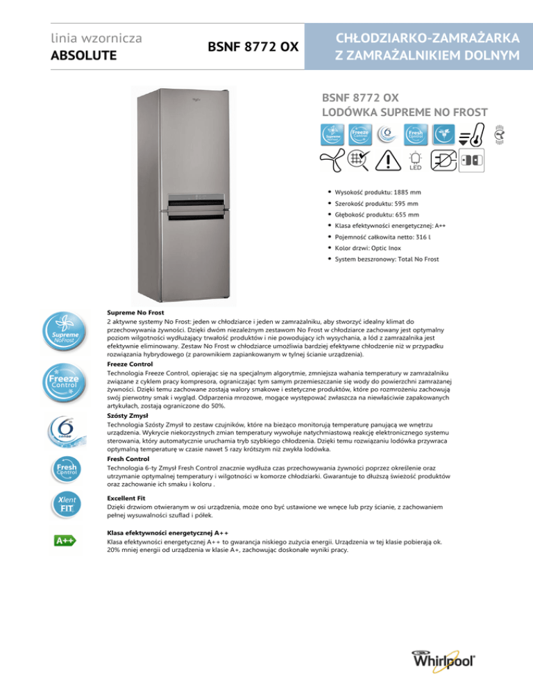 linia wzornicza ABSOLUTE CHŁODZIARKO-ZAMRAŻARKA Z ZAMRAŻALNIKIEM DOLNYM BSNF 8772 OX BSNF 8772 OX LODÓWKA SUPREME NO FROST • • • • • • • Wysokość produktu: 1885 mm Szerokość produktu: 595 mm Głębokość produktu: 655 mm Klasa efektywności energetycznej: A++ Pojemność całkowita netto: 316 l Kolor drzwi: Optic Inox System bezszronowy: Total No Frost Supreme No Frost 2 aktywne systemy No Frost: jeden w chłodziarce i jeden w zamrażalniku, aby stworzyć idealny klimat do przechowywania żywności. Dzięki dwóm niezależnym zestawom No Frost w chłodziarce zachowany jest optymalny poziom wilgotności wydłużający trwałość produktów i nie powodujący ich wysychania, a lód z zamrażalnika jest efektywnie eliminowany. Zestaw No Frost w chłodziarce umożliwia bardziej efektywne chłodzenie niż w przypadku rozwiązania hybrydowego (z parownikiem zapiankowanym w tylnej ścianie urządzenia). Freeze Control Technologia Freeze Control, opierając się na specjalnym algorytmie, zmniejsza wahania temperatury w zamrażalniku związane z cyklem pracy kompresora, ograniczając tym samym przemieszczanie się wody do powierzchni zamrażanej żywności. Dzięki temu zachowane zostają walory smakowe i estetyczne produktów, które po rozmrożeniu zachowują swój pierwotny smak i wygląd. Odparzenia mrozowe, mogące występować zwłaszcza na niewłaściwie zapakowanych artykułach, zostają ograniczone do 50%. Szósty Zmysł Technologia Szósty Zmysł to zestaw czujników, które na bieżąco monitorują temperaturę panującą we wnętrzu urządzenia. Wykrycie niekorzystnych zmian temperatury wywołuje natychmiastową reakcję elektronicznego systemu sterowania, który automatycznie uruchamia tryb szybkiego chłodzenia. Dzięki temu rozwiązaniu lodówka przywraca optymalną temperaturę w czasie nawet 5 razy krótszym niż zwykła lodówka. Fresh Control Technologia 6-ty Zmysł Fresh Control znacznie wydłuża czas przechowywania żywności poprzez określenie oraz utrzymanie optymalnej temperatury i wilgotności w komorze chłodziarki. Gwarantuje to dłuższą świeżość produktów oraz zachowanie ich smaku i koloru . Excellent Fit Dzięki drzwiom otwieranym w osi urządzenia, może ono być ustawione we wnęce lub przy ścianie, z zachowaniem pełnej wysuwalności szuflad i półek. Klasa efektywności energetycznej A++ Klasa efektywności energetycznej A++ to gwarancja niskiego zużycia energii. Urządzenia w tej klasie pobierają ok. 20% mniej energii od urządzenia w klasie A+, zachowując doskonałe wyniki pracy. CHŁODZIARKO-ZAMRAŻARKA Z ZAMRAŻALNIKIEM DOLNYM linia wzornicza ABSOLUTE OZNACZENIE MODELU BSNF 8772 OX BSNF 8772 OX EAN 8003437900587 12nc 850526511020 Linia wzornicza ABSOLUTE GŁÓWNE CECHY Wysokość produktu Szerokość produktu 1885 mm Głębokość produktu Pojemność całkowita netto 655 mm Klasa efektywności energetycznej Kolor drzwi System bezszronowy Sterowanie Wyświetlacz Zewnętrzny podajnik wody z ltrem 595 mm 316 l A++ Optic Inox Total No Frost elektroniczne zewnętrzny w uchwycie - TECHNOLOGIE Technologia 6-ty Zmysł Technologia Fresh Control • Technologia Supreme No Frost Technologia Stop Frost • Technologia Freeze Control Technologia 6th Sense Live • • - - FUNKCJE ELEKTRONICZNE Funkcja szybkiego chłodzenia Funkcja szybkiego mrożenia • Tryb "Party" Tryb wakacyjny • Alarm braku zasilania Alarm otwartych drzwi • Alarm wzrostu temperatury Sygnalizacja usterki Zabezpieczenie przed dziećmi WYPOSAŻENIE CHŁODZIARKI - - • • wizualna i dźwiękowa - Rodzaj oświetlenia Wentylator LED górne i boczne Filtr antybakteryjny Multi ow • Całkowita liczba półek w chłodziarce Podwieszany uchwyt na butelki (kolor Inox) 4 Elektronicznie sterowany przedział Activ0° Przedział na mięso i ryby • • • - • Liczba szuflad na warzywa i owoce Całkowita liczba balkoników 2 Zamykany balkonik na nabiał Balkonik na butelki • Tacka na jajka WYPOSAŻENIE ZAMRAŻARKI • Liczba przedziałów z klapką Sposób przygotowywania lodu 3 • 0 Quick Ice Liczba balkoników Szklane półki w zamrażalniku 0 Liczba szuflad DANE TECHNICZNE 3 Dzienne zużycie energii Roczne zużycie energii • 0,66 kWh / 24h 242 kWh / rok Pojemność netto chłodziarki Pojemność netto zamrażarki 222 l Czas utrzym. temp. w przyp. braku zasilania Zdolność zamrażania 24 h Oznaczenie gwiazdkowe zamrażalnika Poziom hałasu Klasa klimatyczna Czynnik chłodzący Ciężar netto Obustronny montaż drzwi 94 l 15,5 kg / 24h 42 dB(A) SN-T R600a 71 kg •
