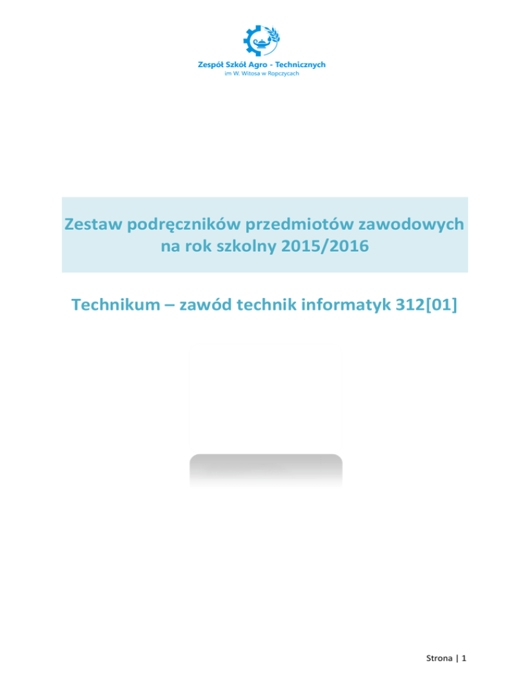 Zestaw podręczników przedmiotów zawodowych na rok szkolny 2015/2016 Technikum – zawód technik informatyk 312[01] Strona | 1 Podręczniki dla klasy pierwszej Przedmiot Autor Tytuł Technik informatyk Oprogramowanie biurowe Jolanta Pokorska Oprogramowanie biurowe Radosław Jaworski Technologia informacyjna Grażyna Koba Oprogramowanie biurowe Technologia informacyjna Systemy operacyjne i sieci komputerowe Paweł Bensel Technik informatyk Systemy operacyjne i sieci komputerowe Krzysztof Pytel, Sylwia Osetek Programowanie strukturalne i obiektowe Przemysław Domka, Małgorzata Łokioska Urządzenia techniki komputerowej Urządzenia Tomasz Marciniuk techniki komputerowej Wydawnictwo Okładka HELION Index 1 WSiP Index 2 MIGRA Index 3 HELION Index 4 WSiP Index 5 WSiP Index 6 WSiP Index 7 Oprogramowanie biurowe dla szkół ponadgimnazjalnych System i sieci komputerowe Systemy operacyjne i sieci komputerowe Część 1 Programowanie strukturalne i obiektowe Index 1 Index 2 Index 3 Index 5 Index 6 Index 7 Index 4 Tabela 1. Okładki książek z danego przedmiotu. Strona | 2 Podręczniki dla klasy drugiej Przedmiot Autor Oprogramowanie biurowe Jolanta Pokorska Oprogramowanie biurowe Radosław Jaworski Technologia informacyjna Grażyna Koba Oprogramowanie biurowe Technologia informacyjna Systemy operacyjne i sieci komputerowe Paweł Bensel Technik informatyk Systemy operacyjne i sieci komputerowe Krzysztof Pytel, Sylwia Osetek Programowanie strukturalne i obiektowe Przemysław Domka, Małgorzata Łokioska Urządzenia techniki komputerowej Multimedia i grafika komputerowa Multimedia i grafika komputerowa Tytuł Technik informatyk Wydawnictwo Okładka HELION Index 1 WSiP Index 2 MIGRA Index 3 HELION Index 4 WSiP Index 5 WSiP Index 6 WSiP Index 7 WSIP Index 8 HELION Index 9 Oprogramowanie biurowe dla szkół ponadgimnazjalnych System i sieci komputerowe Systemy operacyjne i sieci komputerowe Część 1 Programowanie strukturalne i obiektowe Urządzenia Tomasz Marciniuk techniki komputerowej Multimedia i Radosław grafika Jaworski komputerowa Technik informatyk Tomasz Rudny Multimedia i grafika komputerowa Index 1 Index 2 Index 3 Index 4 Index 5 Index 6 Index 7 Index 8 Strona | 3 Index 9 Tabela 2. Okładki książek z danego przedmiotu. Strona | 4 Podręczniki dla klasy trzeciej Przedmiot Systemy operacyjne i sieci komputerowe Autor Tytuł Paweł Bensel Krzysztof Pytel, Sylwia Osetek Programowanie strukturalne i obiektowe Przemysław Domka, Małgorzata Łokioska Index 1 Okładka HELION Index 1 WSiP Index 2 WSiP Index 3 HELION Index 4 WSIP Index 5 Technik informatyk System i sieci komputerowe Systemy operacyjne i sieci komputerowe Multimedia i grafika komputerowa Multimedia i grafika komputerowa Wydawnictwo Systemy operacyjne i sieci komputerowe Część 1 Programowanie strukturalne i obiektowe Tomasz Rudny Technik informatyk Multimedia i grafika komputerowa Multimedia i grafika komputerowa Radosław Jaworski Index 2 Index 3 Index 4 Index 5 Tabela 3. Okładki książek z danego przedmiotu. Strona | 5 Podręczniki dla klasy czwartej Przedmiot Systemy operacyjne i sieci komputerowe Autor Tytuł Paweł Bensel Krzysztof Pytel, Sylwia Osetek Programowanie strukturalne i obiektowe Przemysław Domka, Małgorzata Łokioska Index 1 Okładka HELION Index 1 WSiP Index 2 WSiP Index 3 HELION Index 4 WSIP Index 5 Technik informatyk System i sieci komputerowe Systemy operacyjne i sieci komputerowe Multimedia i grafika komputerowa Multimedia i grafika komputerowa Wydawnictwo Systemy operacyjne i sieci komputerowe Część 2 Programowanie strukturalne i obiektowe Tomasz Rudny Technik informatyk Multimedia i grafika komputerowa Multimedia i grafika komputerowa Radosław Jaworski Index 2 Index 3 Index 4 Index 5 Tabela 4. Okładki książek z danego przedmiotu. Strona | 6 Spis treści Podręczniki dla klasy pierwszej ........................................................................................................... 2 Podręczniki dla klasy drugiej ............................................................................................................... 3 Podręczniki dla klasy trzeciej ............................................................................................................... 5 Podręczniki dla klasy czwartej ............................................................................................................. 6 Strona | 7