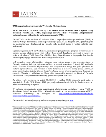 Tatry mountain resorts, a.s. TMR organizuje czwartą edycję Weekendu Akcjonariuszy BRATYSŁAWA (26 marca 2014 r.) – W dniach 12-13 kwietnia 2014 r. spółka Tatry mountain resorts, a.s. (TMR) organizuje czwartą edycję Weekendu Akcjonariuszy, podczas którego odbędzie się walne zgromadzenie TMR. Zarząd TMR zwołał na dzień 12 kwietnia 2014 r. zwyczajne walne zgromadzenie (ZWZ) w Holiday Village Tatralandia, które rozpocznie się o godz. 11.00. Program ZWZ przewiduje m. in. podsumowanie działalności za ubiegły rok, podział zysku i wybór członka rady nadzorczej. Oprócz programu ZWZ na Weekend Akcjonariuszy przygotowano program towarzyszący, w ramach którego akcjonariusze i ich rodziny będą mogli bezpłatnie korzystać z zabawy na stoku w ośrodkach TMR Jasná Tatry Niskie i Tatry Wysokie oraz w Aquaparku Tatralandia. Ponadto przysługują im rabaty na wiele usług dodatkowych. „W ubiegłym roku ukończyliśmy pierwszy etap intensywnego cyklu inwestycyjnego w Tatrach, podczas którego zainwestowaliśmy w rozwój ośrodków i hoteli 190 milionów euro. Podczas Weekendu Akcjonariuszy nasi akcjonariusze mogą nie tylko głosować na walnym zgromadzeniu, lecz również w pełni korzystać z owoców naszej pracy, takich jak najnowocześniejsza kolejka linowa funitel w Jasnej, nowo otwarta restauracja Rotunda na szczycie Chopoku z widokiem na Tatry albo tatrzańskiej egzotyki w Tropical Paradise Tatralandia“ – wyjaśnia Bohuš Hlavatý, prezes zarządu i CEO TMR. Za ubiegły rok obrotowy na dzień 31.10.2013 r. spółka TMR osiągnęła zysk netto w wysokości 5,7 mln EUR. Zarząd TMR proponuje odprowadzenie 10% do funduszu rezerw i pozostawienie reszty w Spółce. W walnym zgromadzeniu mogą uczestniczyć akcjonariusze posiadający akcje TMR na decydujący dzień 9 kwietnia 2014 r. Więcej informacji, w tym szczegółowy program ZWZ i stosowne dokumenty, są dostępne na http://tmr.sk/dla-inwestorow/publikacjeustawowe/walne-zgromadzenia/. Zaproszenie i informacje o programie towarzyszącym są dostępne tutaj. Tatry mountain resorts, a.s. (TMR) jest największym podmiotem w dziedzinie turystyki w Europie Środkowej i Wschodniej, który posiada i prowadzi atrakcyjne ośrodki górskie oraz hotele. W Tatrach Niskich TMR posiada i zarządza ośrodkiem Jasná Nízke Tatry oraz hotalami Wellness hotel Grand Jasná, Boutique Hotel Tri studničky, Chalets Jasná De Luxe, Horský Hotel Srdiečko oraz Million Star Hotel. TMR jest również właścicielem Aquaparku Tatralandia. Jest to największy słowacki termalny park wodny czynny przez cały rok, który oprócz wodnej zabawy oferuje Tropical Paradise – specjalną tropikalną halę z wodą morską, a także zabawę w Fun Parku oraz zakwaterowanie w bungalowach i apartamentach Holiday Village Tatralandia. W Tatrach Wysokich spółka TMR posiada i prowadzi ośrodek Vysoké Tatry w miejcowościach Tatranská Lomnica, Starý Smokovec i Štrbské Pleso. TMR posiada i zarządza w Tatrach Wysokich hotelami: Grandhotel Praha Tatranská Lomnica, Grandhotel Starý Smokovec oraz Hotel FIS Štrbské Pleso. TMR posiada 19% akcji spółki Melida, a.s., która wynajmuje i zarządza ośrodkiem Špindlerův Mlýn w Czechach. TMR posiada w Polsce ośrodek narciarski w Szczyrku. TMR posiada też i wynajmuje hotele Slovakia, Kosodrevina, Liptov, Ski&Fun Záhradky i Bungalovy. Do końca roku 2013 zostało zainwestowane w rozwój i modernizację powyższych ośrodków prawie 190 mln €. Akcje spółki TMR można kupić na trzech europejskich Giełdach Papierów Wartościowych – w Bratysławie, Pradze i w Warszawie.