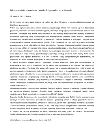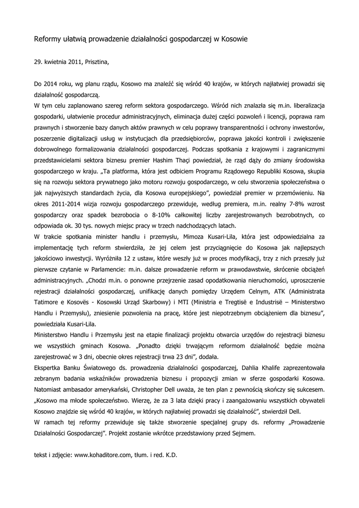 Reformy ułatwią prowadzenie działalności gospodarczej w Kosowie 29. kwietnia 2011, Prisztina, Do 2014 roku, wg planu rządu, Kosowo ma znaleźć się wśród 40 krajów, w których najłatwiej prowadzi się działalność gospodarczą. W tym celu zaplanowano szereg reform sektora gospodarczego. Wśród nich znalazła się m.in. liberalizacja gospodarki, ułatwienie procedur administracyjnych, eliminacja dużej części pozwoleń i licencji, poprawa ram prawnych i stworzenie bazy danych aktów prawnych w celu poprawy transparentności i ochrony inwestorów, poszerzenie digitalizacji usług w instytucjach dla przedsiębiorców, poprawa jakości kontroli i zwiększenie dobrowolnego formalizowania działalności gospodarczej. Podczas spotkania z krajowymi i zagranicznymi przedstawicielami sektora biznesu premier Hashim Thaçi powiedział, że rząd dąży do zmiany środowiska gospodarczego w kraju. „Ta platforma, która jest odbiciem Programu Rządowego Republiki Kosowa, skupia się na rozwoju sektora prywatnego jako motoru rozwoju gospodarczego, w celu stworzenia społeczeństwa o jak najwyższych standardach życia, dla Kosowa europejskiego”, powiedział premier w przemówieniu. Na okres 2011-2014 wizja rozwoju gospodarczego przewiduje, według premiera, m.in. realny 7-8% wzrost gospodarczy oraz spadek bezrobocia o 8-10% całkowitej liczby zarejestrowanych bezrobotnych, co odpowiada ok. 30 tys. nowych miejsc pracy w trzech nadchodzących latach. W trakcie spotkania minister handlu i przemysłu, Mimoza Kusari-Lila, która jest odpowiedzialna za implementację tych reform stwierdziła, że jej celem jest przyciągnięcie do Kosowa jak najlepszych jakościowo inwestycji. Wyróżniła 12 z ustaw, które weszły już w proces modyfikacji, trzy z nich przeszły już pierwsze czytanie w Parlamencie: m.in. dalsze prowadzenie reform w prawodawstwie, skrócenie obciążeń administracyjnych. „Chodzi m.in. o ponowne przejrzenie zasad opodatkowania nieruchomości, uproszczenie rejestracji działalności gospodarczej, unifikację danych pomiędzy Urzędem Celnym, ATK (Administrata Tatimore e Kosovës - Kosowski Urząd Skarbowy) i MTI (Ministria e Tregtisë e Industrisë – Ministerstwo Handlu i Przemysłu), zniesienie pozwolenia na pracę, które jest niepotrzebnym obciążeniem dla biznesu”, powiedziała Kusari-Lila. Ministerstwo Handlu i Przemysłu jest na etapie finalizacji projektu otwarcia urzędów do rejestracji biznesu we wszystkich gminach Kosowa. „Ponadto dzięki trwającym reformom działalność będzie można zarejestrować w 3 dni, obecnie okres rejestracji trwa 23 dni”, dodała. Ekspertka Banku Światowego ds. prowadzenia działalności gospodarczej, Dahlia Khalife zaprezentowała zebranym badania wskaźników prowadzenia biznesu i propozycji zmian w sferze gospodarki Kosowa. Natomiast ambasador amerykański, Christopher Dell uważa, że ten plan z pewnością skończy się sukcesem. „Kosowo ma młode społeczeństwo. Wierzę, że za 3 lata dzięki pracy i zaangażowaniu wszystkich obywateli Kosowo znajdzie się wśród 40 krajów, w których najłatwiej prowadzi się działalność”, stwierdził Dell. W ramach tej reformy przewiduje się także stworzenie specjalnej grupy ds. reformy „Prowadzenie Działalności Gospodarczej”. Projekt zostanie wkrótce przedstawiony przed Sejmem. tekst i zdjęcie: www.kohaditore.com, tłum. i red. K.D. Sektor prywatny: minimalne wynagrodzenie będzie wynosić 170 euro 28. kwietnia 2011, Prisztina, Minimalna płaca w Kosowie ma wynosić 170 euro miesięcznie. Na spotkaniu zorganizowanym przez Kosowską Izbę Gospodarczą przedstawiciele grupy przedsiębiorców zostali poinformowani, że w w artykule 57 Kodeksu Pracy, który wszedł w życie 16 grudnia 2010 roku została uwzględniona płaca minimalna. Związki zawodowe proponowały, aby minimalne wynagrodzenie wynosiło 250 euro miesięcznie, ale przedstawiciele Izby byli temu przeciwni twierdząc, że do tej kwestii należy podejść realnie. Pracodawcy zgodnie przyjęli propozycję płacy minimalnej w wysokości 170 euro. www.kohaditore.com, tłum. K.D. Ambasador Kosowa wśród gości na ślubie Williama i Kate 28. kwietnia 2011, Londyn, Ambasador Republiki Kosowa w Wielkiej Brytanii, Muhamet Hamiti był jednym z 1900 gości biorących udział w zaślubinach księcia Walii Williama, która odbyła się 29 kwietnia. Jako jedyny Kosowianin został zaproszony na tę ceremonię odbywającą się w kościele Westminster Abbey w Londynie. Na ślub nie zaproszono między innymi byłego premiera Wlk. Brytanii Tony’ego Blaira czy Gordona Browna. www.kohaditore.com, tłum. i red. K.D. Czy Lunacek zastąpi Pietera Feitha? 26. kwietnia 2011 r., Prisztina, Posłanka Parlamentu Europejskiego na Kosowo, Ulrike Lunacek, dąży do tego, aby zostać Specjalnym Przedstawicielem Unii Europejskiej w Kosowie, pisze w dzisiejszym numerze dziennik „Koha Ditore”. Jej kandydatura została dobrze przyjęta także przez Wysoką Przedstawciel Unii Europejskiej ds. Polityki Wspólnej Zagranicznej i Bezpieczeństwa, Catherine Ashton. Lunacek – polityk Partii Zielonych w Austrii znana jest jako wielka propagatorka rozwoju Kosowa i jej integracji z Unią Europejską. Do ostatecznego wyboru Specjalnego Przedstawiciela UE w Kosowie funkcję tę tymczasowo będzie pełnić dyplomata włoski Fernando Gentilini, który służył w Kosowie w latach 2004-2005. tekst i zdjęcie: www.indeksonline.net, tłum. i red. K.D. Ponad trzy miliony euro z podatku od nieruchomości 19. kwietnia 2011 r., Prisztina, Odnotowano wzrost wpływów z podatku od nieruchomości w porównaniu z tym samym okresem w roku 2010. W okresie od stycznia do marca 2011 wpływy te przekroczyły prognozy przekraczając za ten okres kwotę ponad 3 milionów euro. „Suma z podatku za okres styczeń-marzec 2011 jest wyższa niż suma zainkasowana w tym samym okresie w roku ubiegłym i przekracza ją o 1 mln 35 tys. 933 euro ze wzrostem o 50 %