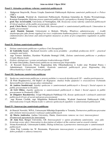 /stan na dzień 1 lipca 2016/ Panel I: Aktualne problemy reformy zamówień publicznych 1. 2. 3. 4. 5. Małgorzat Stręciwilk, Prezes Urzędu Zamówień Publicznych Reforma zamówień publicznych w Polsce (TBC) Marta Łaszuk, Wydział ds. Zamówień Publicznych, Dyrekcja Generalna ds. Rynku Wewnętrznego, Komisja Europejska, Reforma prawa zamówień publicznych z perspektywy Komisji Europejskiej prof. Sue Arrowsmith, University of Nottingham, GB, Krytyczna ocena reformy zamówień publicznych (Critical analysis of the public procurement reform) prof. Chris Bovis, Univeristy of Hull, GB, Innowacyjność w zamówieniach publicznych ( Innovation in public procurement) prof. Daniele Senzani, Uniwersytet w Bolonii, Włochy, Władztwo administracyjne i środki antykorupcyjne jako forma regulacji na rzecz zwiększania konkurencyjności w zamówieniach publicznych (Administrative discretion and anticorruption measures as form of pro-competitive regulation in public tender) Panel II: Zielone zamówienia publiczne 6. 7. Zielone zamówienia publiczne w polityce Unii Europejskiej dr Gabriella Gyori, Rachunek kosztów cyklu życia produktu – przykłady praktyczne (LCC – practical examples and tools) mgr Tomasz Jakubiec, Dyrektor Wydziału Strategii UMŁ, Zielone zamówienia publiczne w praktyce 8. Urzędu Miasta Łodzi 9. Etykiety ekologiczne i system zarzadzania środowiskowego EMAS 10. dr Anna Górczyńska, Zamówienia publiczne na innowacyjne bioprodukty 11. dr Ryszard Krawczyk, Prezes Regionalnej Izby Obrachunkowej w Łodzi oraz Wydział Prawa i Administracji, Uniwersytet Łódzki, Kontrola zamówień publicznych przez Regionalną Izbę Obrachunkową w Łodzi – wybrane przypadki Panel III: Społeczne zamówienia publiczne 12. 13. 14. 15. 16. 17. Społeczne zamówienia publiczne w prawie polskim i w nowych dyrektywach UE – analiza porównawcza dr Piotr Bogdanowicz, Od Ruffert do Regiopost. Analiza braku spójności w orzecznictwie Trybunału Sprawiedliwości dotyczącego płacy minimalnej. dr Andrea Sundstrand, Aspekty społeczne w zamówieniach publicznych w Szwecji ( Social aspects in public procurement in Sweden) dr Grit Olkke, Aspekty społeczne w zamówieniach publicznych w Danii ( Social aspects in public procurement in Denmark) (TBC) dr Zbigniew Raczkiewicz, Urząd Oficjalnych Publikacji UE, Koszty społecznych i zielonych zamówień publicznych (Costs of social and green procurement) mgr Roman Cieślak, mgr Magdalena Bednarek-Sicińska, Wydział Zamówień Publicznych UMŁ, Doświadczenia Urzędu Miasta Łodzi w zakresie społecznych aspektów w zamówieniach publicznych Panel IV: Innowacyjne zamówienia publiczne 18. 19. 20. 21. 22. dr Henryk Nowicki, WPiA, Uniwersytet Mikołaja Kopernika w Toruniu, Partnerstwo publiczno-prywatne jako element innowacyjności realizacji zadań publicznych dr Marta Andrecka, Aarhus University, Dania, Zamówienia ramowe na rzecz innowacyjnosci (Framework agreement for innovation) dr Ama Eyo, Bangor University, GB, Innowacyjność w opisie przedmiotu zamówienia oraz jako kryterium oceny ofert ( Innovation in description of subject of the contract and as award criteria) Iwona Kowalczyk, Uniwersytet Łódzki, Dialog techniczny a partnerstwo innowacyjne w zamówieniach publicznych Artur Fraj, Lotnisko im. W. Reymonta, Wspieranie innowacyjności w zamówieniach publicznych dobre praktyki w sektorze lotnictwa