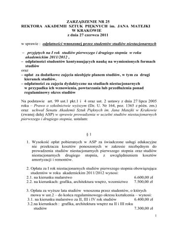 ZARZĄDZENIE NR 25 REKTORA AKADEMII SZTUK PIĘKNYCH im. JANA MATEJKI W KRAKOWIE z dnia 27 czerwca 2011 w sprawie : odpłatności wnoszonej przez studentów studiów niestacjonarnych – przyjętych na I rok studiów pierwszego i drugiego stopnia w roku akademickim 2011/2012 , – odpłatności studentów kontynuujących naukę na wymienionych formach studiów oraz – opłat za dodatkowe zajęcia nieobjęte planem studiów, w tym za drugi kierunek studiów, – odpłatności za zajęcia dydaktyczne na studiach niestacjonarnych w przypadku ich wznowienia, powtarzania lub przedłużenia ponad regulaminowy okres studiów Na podstawie art. 99 ust.1 pkt.1 i 4 oraz ust. 2 ustawy z dnia 27 lipca 2005 roku – Prawo o szkolnictwie wyższym (Dz. U. Nr 164, poz. 1365 z późn. zm.) oraz uchwał Senatu Akademii Sztuk Pięknych im. Jana Matejki w Krakowie (zwanej dalej ASP) w sprawie prowadzenia w uczelni studiów niestacjonarnych pierwszego i drugiego stopnia, ustalam: §1 1. Wysokość opłat pobieranych w ASP za świadczone usługi edukacyjne nie przekracza kosztów ponoszonych w zakresie niezbędnym do prowadzenia studiów niestacjonarnych pierwszego stopnia oraz studiów niestacjonarnych drugiego stopnia, z uwzględnieniem kosztów amortyzacji i remontów. 2. Opłata za I rok niestacjonarnych studiów pierwszego stopnia obowiązująca studentów w roku akademickim 2011/2012 wynosi: 2.1. na kierunku malarstwo 6.600,00 zł 2.2. na kierunkach: grafika, architektura wnętrz, wzornictwo 7.500,00 zł 3. Opłata za wyższe lata studiów wnoszona przez studentów, o których mowa w ust.2 – do końca regulaminowego okresu kształcenia – wynosi: 3.1. na kierunku malarstwo za II, III i IV rok studiów 6.400,00 zł 3.2.na kierunkach : grafika, architektura wnętrz na II i III roku studiów 7.300,00 zł 1 3.3. na kierunku wzornictwo za II i III rok 3.4. za siódmy semestr na kierunku :architektura wnętrz 3.5. za siódmy semestr na kierunku: wzornictwo 7.500,00 zł 3.200,00 zł 3.800,00 zł. 4. Opłata za I i II rok studiów niestacjonarnych drugiego stopnia rozpoczętych roku 2011/2012 wynosi: 4.1.I i II rok na kierunku malarstwo 5.800,00 zł 4.2. I i II rok na kierunkach: grafika, architektura wnętrz 6.100,00 zł 4.3. I rok na kierunku wzornictwo 8.200,00 zł, II rok na kierunku wzornictwo 7.600,00 zł. 5. Studenci, którzy rozpoczęli studia w roku 2008, 2009 lub 2010 wnoszą opłaty w wysokości zobowiązań podpisanych przez strony umowy „o warunkach odpłatności za kształcenie studentów na studiach niestacjonarnych pierwszego/drugiego stopnia w ASP w Krakowie” tj. przez Dziekana Wydziału i Studenta – do końca regulaminowego okresu kształcenia. 6.Obywatele państw członkowskich Unii Europejskiej, Konfederacji Szwajcarskiej lub państw członkowskich EFTA mogą podejmować i odbywać studia wyższe, doktoranckie oraz inne formy kształcenia na zasadach obowiązujących obywateli polskich, z tym że osobom tym nie przysługuje prawo do stypendium socjalnego, stypendium specjalnego dla osób niepełnosprawnych i zapomóg, albo na zasadach określonych w ust. 3 i 4 art.43 ustawy – Prawo o szkolnictwie wyższym. 6a.Posiadacze ważnej Karty Polaka mogą podejmować studia wyższe, doktoranckie oraz inne formy kształcenia na zasadach obowiązujących obywateli polskich, albo na zasadach określonych w ust. 3 i 4 art. 43 ustawy. 7. Cudzoziemcy, obywatele innych państw niż wymienione w ust. 6, przyjęci na studia niestacjonarne pierwszego stopnia lub studia niestacjonarne drugiego stopnia wnoszą opłaty ustalone zarządzeniem Rektora nr 33/2006 z 14 listopada 2006 roku, § 10 ust. 1 pkt. 1 oraz w aneksie do cytowanego zarządzenia z dnia 18 maja 2009 r. 8. Cudzoziemcy odbywający kształcenie w dniu wejścia w życie przepisów rozporządzenia MNiSW z 9 września 2009 r. zmieniającego rozporządzenie w sprawie podejmowania i odbywania przez cudzoziemców studiów i szkoleń oraz ich uczestniczenia w badaniach naukowych i pracach rozwojowych (Dz. U. nr 176, poz. 1365) ponoszą opłaty za kształcenie na zasadach i w wysokości określonej w dotychczasowych przepisach do końca okresu kształcenia przewidzianego dla danej formy kształcenia. 2 9. Akademia zastrzega sobie prawo do zmiany opłaty ustalonej na rok akademicki w roku następnym w przypadku zmian w programie studiów albo nadzwyczajnych okoliczności. 10.Studenci studiów niestacjonarnych mogą realizować drugi kierunek studiów niestacjonarnych zgodnie z § 3 ust. 2 i 3 oraz § 4 ust. 2 i 3 niniejszego zarządzenia. 11.Studenci studiów niestacjonarnych pierwszego lub drugiego stopnia uczestniczący w wymianie zagranicznej w ramach programów LLP/Erasmus lub CEEPUS wnoszą obniżoną opłatę za studia w terminach obowiązujących wszystkich studentów: semestralnie 1.800,00 zł. Obniżona opłata za studia wnoszona przez wyjeżdżających studentów pokrywa koszty ponoszone przez Akademię. 12.Student ASP, który przedłużył pobyt w szkole zagranicznej bez uzgodnienia z Wydziałem macierzystym, w okresie przedłużonego pobytu nie otrzymuje świadczeń pomocy materialnej z budżetu Akademii do terminu powrotu i zaliczenia odpowiednio semestru lub roku akademickiego. 13.Student może wnosić opłatę za rok lub semestr studiów. 14. Zwrot opłat wniesionych z a studia: 14.1. Student może domagać się zwrotu opłat za studia w całości w przypadku wypowiedzenia umowy o naukę przed rozpoczęciem nauczania. 14.2. W przypadku pisemnej rezygnacji ze studiów po rozpoczęciu nauczania lub w przypadku skreślenia z listy studentów, studentowi przysługuje – na jego pisemny wniosek – zwrot wpłaconej opłaty za studia w wysokości proporcjonalnej do nieodbytych zajęć objętych planem studiów i ponoszonych przez Akademię kosztów, licząc od dnia, w którym student złożył rezygnację ze studiów lub został skreślony z listy studentów. 14.3. Wniosek, o którym mowa w ust.14.2., student składa niezwłocznie po wyst