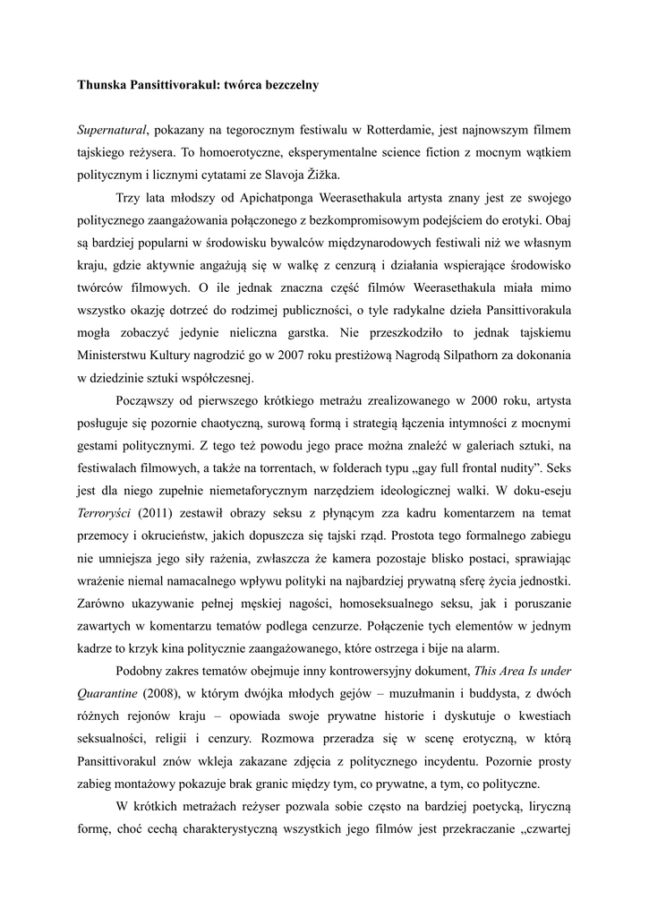 Thunska Pansittivorakul: twórca bezczelny Supernatural, pokazany na tegorocznym festiwalu w Rotterdamie, jest najnowszym filmem tajskiego reżysera. To homoerotyczne, eksperymentalne science fiction z mocnym wątkiem politycznym i licznymi cytatami ze Slavoja Žižka. Trzy lata młodszy od Apichatponga Weerasethakula artysta znany jest ze swojego politycznego zaangażowania połączonego z bezkompromisowym podejściem do erotyki. Obaj są bardziej popularni w środowisku bywalców międzynarodowych festiwali niż we własnym kraju, gdzie aktywnie angażują się w walkę z cenzurą i działania wspierające środowisko twórców filmowych. O ile jednak znaczna część filmów Weerasethakula miała mimo wszystko okazję dotrzeć do rodzimej publiczności, o tyle radykalne dzieła Pansittivorakula mogła zobaczyć jedynie nieliczna garstka. Nie przeszkodziło to jednak tajskiemu Ministerstwu Kultury nagrodzić go w 2007 roku prestiżową Nagrodą Silpathorn za dokonania w dziedzinie sztuki współczesnej. Począwszy od pierwszego krótkiego metrażu zrealizowanego w 2000 roku, artysta posługuje się pozornie chaotyczną, surową formą i strategią łączenia intymności z mocnymi gestami politycznymi. Z tego też powodu jego prace można znaleźć w galeriach sztuki, na festiwalach filmowych, a także na torrentach, w folderach typu „gay full frontal nudity”. Seks jest dla niego zupełnie niemetaforycznym narzędziem ideologicznej walki. W doku-eseju Terroryści (2011) zestawił obrazy seksu z płynącym zza kadru komentarzem na temat przemocy i okrucieństw, jakich dopuszcza się tajski rząd. Prostota tego formalnego zabiegu nie umniejsza jego siły rażenia, zwłaszcza że kamera pozostaje blisko postaci, sprawiając wrażenie niemal namacalnego wpływu polityki na najbardziej prywatną sferę życia jednostki. Zarówno ukazywanie pełnej męskiej nagości, homoseksualnego seksu, jak i poruszanie zawartych w komentarzu tematów podlega cenzurze. Połączenie tych elementów w jednym kadrze to krzyk kina politycznie zaangażowanego, które ostrzega i bije na alarm. Podobny zakres tematów obejmuje inny kontrowersyjny dokument, This Area Is under Quarantine (2008), w którym dwójka młodych gejów – muzułmanin i buddysta, z dwóch różnych rejonów kraju – opowiada swoje prywatne historie i dyskutuje o kwestiach seksualności, religii i cenzury. Rozmowa przeradza się w scenę erotyczną, w którą Pansittivorakul znów wkleja zakazane zdjęcia z politycznego incydentu. Pozornie prosty zabieg montażowy pokazuje brak granic między tym, co prywatne, a tym, co polityczne. W krótkich metrażach reżyser pozwala sobie często na bardziej poetycką, liryczną formę, choć cechą charakterystyczną wszystkich jego filmów jest przekraczanie „czwartej ściany”. Kamera jest w widoczny sposób obecna w filmie, zdarza się, że twórca wyciąga zza niej dłoń w kierunku bohaterów, wyraźnie zaznaczając swoją obecność i nieustannie podważając filmową iluzję. Tego rodzaju zabiegom towarzyszą luki fabularne, przebitki montażowe, a całość często fotografowana jest z ręki. Ujęcia robią czasem wrażenie przypadkowych i chwiejnych, a równocześnie spontanicznych i dzikich. Filmy Pansittivorakula przypominają proste szkice, co nie znaczy, że nie posiadają wyrazistej struktury. Wzorem dla artysty jest twórczość filmowa Andy’ego Warhola, jego bezkompromisowe podejście do rejestrowania prozaicznych zdarzeń i fascynacja ciałem, którego bliska obecność staje się niemal nie do wytrzymania. Ciało jest też ważnym tematem jego najnowszej produkcji – paradoksalnym, ponieważ w przedstawionej w filmie przyszłej rzeczywistości ludzkie interakcje zostały zastąpione komunikacją z podłączonymi do sieci awatarami. Supernatural (2014) to pierwszy fabularny film twórcy, a zarazem jego najbardziej złożona produkcja, w której po raz kolejny porusza tematy polityczne – zakorzenione w aktualnych problemach Tajlandii, choć ubrane tym razem w znacznie bardziej przystępne formy. Dzięki większemu budżetowi reżyser poszerza także swoje wizualne spektrum. Przerzuca widza między kilkoma sceneriami, które wyglądają znajomo, równocześnie pozostawiając wrażenie dystansu i obcości. Oniryczna atmosfera sprawia, że film na przemian wciąga i odpycha, zbija z tropu, by za chwilę podrzucić znajomy temat i konwencję. Kilka luźno powiązanych historii tworzy rodzaj kolażu, w którym rozmowy i monologi na temat religii, społeczeństwa i filozofii splatają się z prozaicznymi czynnościami, chwilami bezruchu i zawieszenia. Jest to jednak, jak na opowieść o niemożności fizycznego kontaktu, splot niezwykle zmysłowy. Film będzie można zobaczyć na tegorocznym festiwalu Pięć Smaków. Jagoda Murczyńska