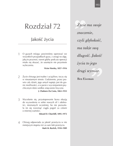 193 Rozdział 72 Życie ma swoje Jakość życia czyli głębokość, znaczenie, ma także swą 1O guzach mózgu: powinniśmy operować we wszystkich przypadkach guza, z uwagi na ulgę, jaką to przynosi, nawet gdyby podczas operacji miało się okazać, że usunięcie nie przyniesie wyleczenia. Victor Horsley, 1857–1916 2Życie chirurga jest trudne i uciążliwe, toczy się w nieustannym stresie. Codziennie, przez prawie cały dzień, jego umysł napięty jest do granic możliwości, a w parze z wyczerpaniem psychicznym idzie wielkie zmęczenie fizyczne. J. Chalmers Da Costa, 1863–1933 3Wycofanie się, przystopowanie bywa okazją do wyzwolenia w sobie nowych sił i zdolności, nieznanych wcześniej, bo nie pozwalała im się rozwinąć ciągła pogoń za celami o miernej wartości. Edward D. Churchill, 1895–1972 4Chirurg odpowiada za jakość przeżycia w nie mniejszym stopniu niż za sam fakt przeżycia. Mark M. Ravitch, 1910–1989 długość. Jakość życia to jego drugi wymiar. Ben Eiseman 194 72 Jakość życia 5Trudno jest poprawić samopoczucie pacjenta asymptomatycznego. Stanley O. Hoerr, 1909–1990 6Chirurgom nie wolno poprzestawać na zmierzaniu do celu, gdy chodzi o trzy tradycyjne, łatwo mierzalne parametry: śmiertelność operacyjną i zachorowalność (które staramy się zmniejszać) oraz przeżywalność długoterminową (którą próbujemy wydłużać). Muszą oni również uwzględniać aspekt jakości życia. Michael Trede 7 Operacja paliatywna ma przynieść ulgę pacjentowi, nie chirurgowi. 8 Przed poważną operacją staraj się wyjść z domu w dobrym nastroju. 9Nie zanoś do domu swoich problemów zawodowych, a problemów domo- Od redaktora wych nie wnoś do pracy. Obawa, że „to by krwawiło” albo że „przeszkadzałoby”, nie jest wskazaniem do operacji paliatywnej. Żona, która nie zrzędzi, to bezcenny atut w karierze każdego chirurga. 195 Rozdział 73 Prawdziwy Lektura w samolocie chirurg czyta książkę, 1 L ecz aby się wybić, aby zyskać rozgłos i szacunek w swoim zawodzie, nie wystarczy czytać; trzeba aktywnie myśleć i rozważać wiedzę, uczyć się – jak zaleca Bacon – rzetelnego namysłu nad książkami. a nie wpatruje się w laptopa. Jacob M. Da Costa, 1833–1900 Moshe Schein 2To zdumiewające, jak mało czytając, lekarz może uprawiać swój zawód, ale to zarazem oczywiste, że robi to wówczas nadzwyczaj źle. William Osler, 1849–1919 3O ileż lepiej jest mieć ściany zasłonięte rzęda- mi książek, z którymi budujemy przyjazne relacje, niż przypadkowo otrzymanymi obrazkami, cieszącymi oko przez chwilę. Obrazy z czasem powszednieją, a fascynacja książkami nie mija nigdy. William J. Mayo, 1861–1939 196 73 Lektura 4Podręczniki poprzedniego pokolenia były równie duże jak dzisiejsze, ale zawierały inny zasób dezinformacji. Mark M. Ravitch, 1910–1989 5Gdybyś więcej przeczytał, mniej byś odkrył i wynalazł samodzielnie. Karl Sternberg 197 Rozdział 74 Reoperacja Ostatnim, który dostrzega konieczność reoperacji, 1 hirurg jest jak kapitan jachtu oceanicznego. Wie, C do jakiego portu zmierza, ale nie do końca potrafi przewidzieć kurs. Na każdym etapie musi mieć gotowy plan, oparty na roboczej znajomości obecnej pozycji. Dzięki temu w razie niepomyślnego obrotu spraw zawsze ma jeden z kilku portów awaryjnych do dyspozycji, jeśli jednak wszystkie one okazałyby się poza zasięgiem, musi umieć znaleźć schronienie pod osłoną lądu, do czasu, aż możliwe będzie wznowienie podróży. William Heneage Ogilvie, 1887–1971 2Lepsza negatywna relaparotomia niż pozytywna autopsja, ale i tak nie jest to łagodna procedura. Roger Saadia 3Najważniejsza rzecz w chirurgii reoperacyjnej: wiedzieć kiedy. Timothy Fabian jest wykonawca operacji. Mark M. Ravitch, 1910–1989 198 Od redaktora 74 Reoperacja 4Lepiej ocalić pacjenta w dwóch operacjach, niż zabić w jednej. 5 Hernan Diaz On jest zbyt chory, by go nie reoperować. Zbyt wczesna reoperacja to miecz obosieczny. Musimy nauczyć się, jak używać go jedynie przeciw wrogom – niekontrolowanym przyczynom. Po obcym kraju nie jeździsz bez mapy, więc tak samo nie badaj uprzednio operowanego brzucha bez zajrzenia do zapisu operacji. Jeśli blizna ma wygląd dojrzały, takie same są zrosty wewnątrz: spoiste i bezkrwawe. Bardzo boleœnie odczuwa chirurg koniecznoœć reoperacji powikłania po własnej operacji. Woli po cudzej. Kto operuje i ucieka, daleko nie ucieknie. Być może już nazajutrz zmuszony będzie reoperować. 199 Rozdział 75 Reputacja Rób mądrą minę, nic nie mów, pomrukuj. 1Nuta cynizmu w zachowaniu i nawykach przydaje lekarzowi autorytetu w oczach postronnych i wielce sprzyja jego reputacji. Walter Scott, 1771–1832 2Trzeba mieć duszę znachora, by zabiegać o rozgłos wśród laików, a nie o dobrą opinię w środowisku. J. Chalmers Da Costa, 1863–1933 3Reputacja chirurga w istocie opierać się musi na oryginalności, uczeniu słowem mówionym, uczeniu słowem pisanym i umiejętnościach operacyjnych. William J. Mayo, 1861–1939 4Prawdziwy chirurg nie powie, że nie zna strachu. Boi się o swoich pacjentów, obawia się swoich braków i błędów, natomiast spokojny jest o swoją opinię zawodową. Samuel J. Mixter, 1880–1958 Mowę masz po to, by skrywać myśl. William Osler, 1849–1919 200 Za dobre to, Rozdział 76 aby było Badania prawdziwe, lub zbyt prawdziwe, aby mogło być 1Sądzę, że twoje rozwiązanie jest prawidłowe, ale dlaczego tylko rozumować? Niech potwierdzi je eksperyment. dobre. William Heneage John Hunter, 1728–1793 2Zbiór świadectw na każdy temat medyczny sprowadzić można do zaledwie trzech źródeł: obserwacji żywego osobnika, badania zwłok oraz eksperymentów na organizmach żywych. Ogilvie, 1887–1971 Astley Paston Cooper, 1768–1841 3Najwyższy ideał w medycynie osiąga ten, kto łączy znajomość fizjologii i chirurgii z artystyczną stroną swojego rzemiosła. Theod