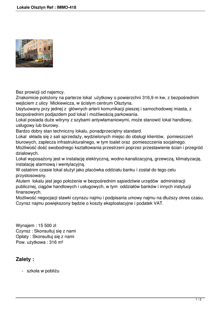 Lokale Olsztyn Ref : IMMO-418 Bez prowizji od najemcy. Znakomicie położony na parterze lokal użytkowy o powierzchni 316,9 m kw, z bezpośrednim wejściem z ulicy Mickiewicza, w ścisłym centrum Olsztyna. Usytuowany przy jednej z głównych arterii komunikacji pieszej i samochodowej miasta, z bezpośrednim podjazdem pod lokal i możliwością parkowania. Lokal posiada duże witryny z szybami antywłamaniowymi, może stanowić lokal handlowy, usługowy lub biurowy. Bardzo dobry stan techniczny lokalu, ponadprzeciętny standard. Lokal składa się z sali sprzedaży, wydzielonych miejsc do obsługi klientów, pomieszczeń biurowych, zaplecza infrastrukturalnego, w tym toalet oraz pomieszczenia socjalnego. Możliwość dość swobodnego kształtowania przestrzeni poprzez przestawienie ścian i przegród działowych. Lokal wyposażony jest w instalację elektryczną, wodno-kanalizacyjną, grzewczą, klimatyzację, instalację alarmową i wentylacyjną. W ostatnim czasie lokal służył jako placówka oddziału banku i został do tego celu przystosowany. Atutem lokalu jest jego położenie w bezpośrednim sąsiedztwie urzędów administracji publicznej, ciągów handlowych i usługowych, w tym oddziałów banków i innych instytucji finansowych. Możliwość negocjacji stawki czynszu najmu i podpisania umowy najmu na dłuższy okres czasu. Czynsz najmu powiększony będzie o koszty eksploatacyjne i podatek VAT. Wynajem : 15 500 zł Czynsz : Skonsultuj się z nami Opłaty : Skonsultuj się z nami Pow. użytkowa : 316 m² Zalety : - szkoła w pobliżu 1/2 Lokale Olsztyn Ref : IMMO-418 Adres : Olsztyn ul. Adama Mickiewicza, 10-900 OLSZTYN http://www.immobilia.olsztyn.pl/index.php?view=properties&id=65&option=com_jea&Itemid=14 2/2