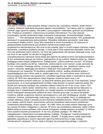 Ks. dr Waldemar Kulbat: Rodzina i jej wrogowie poniedziałek, 15 czerwca 2009 09:57 Póki jest to możliwe, wykorzystujmy okazję i cieszmy się z pluralizmu mediów, dzięki którym możemy zobaczyć dyskretnie skrywane aspekty rzeczywistości. Ten luksus, póki co, zapewnia Internet i jego ogromne zasoby. Oto jeden z pouczających materiałów, godnych przemyślenia. Film „Postęp po szwedzku” umieszczony na portalu internetowym You tube ukazuje przerażający rezultat systematycznego niszczenia tradycyjnego, chrześcijańskiego modelu rodziny. Film demaskuje samotność i izolację „nowego” społeczeństwa: 70% gospodarstw domowych to gospodarstwa jednoosobowe. Wszędzie doskwiera samotność i brak więzi uczuciowych między ludźmi. Autor filmu stwierdza w swoim komentarzu, że widoczne w społeczeństwie wyobcowanie jest skutkiem zamierzonej polityki partii socjalistyczno-demokratycznej. Nie musi to być prawdą, gdyż w innych krajach Zachodu rządzą liberałowie, a podobne problemy istnieją. A może jest to wina większości obywateli, którym nie chce się opiekować swymi dziećmi, nie chce się zastanawiać nad sensem własnego życia, czyli nie chce im się myśleć, bo tak jest im wygodniej ? Charakterystyczną natomiast cechą władz jest dążenie do pełnej kontroli nad społeczeństwem. W tym przeszkodą okazuje się rodzina, stąd dążenie do jej rozbicia. Niektóre partie np. „Zieloni” propagują nawet związki poligamiczne. Padają słowa: „rodzina powinna umrzeć!”. W Szwecji każdego roku zawiera się 38 tys. małżeństw. Jednocześnie w tym samym czasie dochodzi do 31 tys. rozwodów. Powstają rodziny, w których pojawiają się tzw. „plastikowi rodzice, czyli ojczymi, macochy, opiekujący się dziećmi z własnych oraz poprzednio zawartych i rozwiązanych już związków. W rezultacie szwedzkie rodziny według określenia jednej z wypowiadających się w filmie osób to „wielka jajecznica”. Do zniszczenia więzi rodzinnych przyczyniają się również nieuzasadnione i szkodliwe ingerencje władz w wewnętrzne sprawy rodziny: W 1979 roku wprowadzono zakaz klapsów i karcenia dzieci wraz z ich indoktrynowaniem przeciw rodzicom: za skarcenie dziecka grozi kara do 10 lat więzienia. Dzieci są pouczane, że w razie jakiegokolwiek konfliktu mają donosić na swoich rodziców policji. Na skutek tych donosów każdego roku państwo odbiera rodzicom od 10 do 12 tys. dzieci. Film ukazuje jedną z takich spraw: dziewczynka z zemsty, za uśpienie kociąt donosi fałszywie na swojego ojca o molestowanie seksualne, ten zostaje skazany na wieloletnie więzienie, po trzech miesiącach dziewczynka oddana do domu dziecka przyznaje, że zarzut był jednak zmyślony, jednak urzędnicza machina wprowadzona w ruch jest nieubłagana, rezultat - tragedia rodziców i dziecka, pozbawionego rodzinnego domu. Inny przykład: chory na epilepsję syn zostaje odebrany matce z powodu jej domniemanej nadopiekuńczości. Władze socjalne oddają go w opiekę rodzinie byłych narkomanów, później człowiekowi obarczonemu problemem uzależnienia alkoholowego. W tym czasie, do matki, która ma zakaz widzeń własnego syna, syn wysyła 40 listów z błaganiem o ratunek. W końcu syn pozbawiony właściwej opieki umiera. Matka wytacza proces państwu, który jednak przegrywa, zostaje skazana na opłatę 1,5 miliona koron tytułem kosztów procesowych. A oto inny przykład „postępu”: W 1995 roku zalegalizowano małżeństwa homoseksualistów i lesbijek. „Postępowy” kościół protestancki zostaje zmuszony do udzielania takim osobom „ślubów”. Z drugiej strony nawet organizacje gejowskie sygnalizują w swoich raportach ogromną ilość przemocy w tego rodzaju nienaturalnych związkach. 40 tys. osób w Szwecji ma przynajmniej jednego z rodziców 1/2 Ks. dr Waldemar Kulbat: Rodzina i jej wrogowie poniedziałek, 15 czerwca 2009 09:57 homoseksualistę lub lesbijkę. Jak może to wpływać na wychowanie tych dzieci? Odpowiedzi należałoby szukać analizując wskaźniki przestępczości, uzależnień, samobójstw. Najbardziej tragiczne jest, że osierocone dzieci, przeważnie z innych krajów, są oddawane w adopcję homoseksualistom i lesbijkom. Ma to rzekomo wpłynąć na ograniczenie „homofobii”. Co powiedziałyby rodziny z których pochodzą te dzieci, gdyby ich los był im znany? Prześladowani natomiast są duchowni, którzy głoszą naukę Pisma św. o grzesznym charakterze dewiacji. Pastor zielonoświątkowy Ake Green za zacytowanie nauki Biblii na ten temat na ambonie zostaje skazany na miesiąc więzienia, sąd drugiej instancji go uniewinnił, jednak sprawa nadal jest rozpatrywana w przez Sąd Najwyższy. Pastorka protestancka w rozmowie z dziennikarzem stwierdza, że Biblia dla niej nie jest wcale słowem Bożym , poza tym jej zdaniem nie odpowiada ona na pytania współczesnego człowieka. Natomiast Pastor –gej proponuje swojego kolegę, który wiernie głosi Słowo Boże wysłać do obozu koncentracyjnego celem reedukacji! Ake Green, za wierność nauce Pisma św. jest nieustannie maltretowany, otrzymuje telefony i listy z groźbami pozbawienia go życia i obelgami. Mnożą się także bluźniercze wystawy, na których „dzieła sztuki” ośmieszają osobę Chrystusa i apostołów. Na koniec wstrząsający fakt, w filmie ukazany na początku, jednak stanowiący pewną konkluzję: 90% ciał zmarłych poddawanych jest kremacji. Po pogrzebie 45% urn zostaje nieodebranych. Coraz więcej ceremonii pogrzebowych pozbawionych jest religijnej oprawy. Pozbawieni sentymentów, praktyczni Szwedzi nawet energię cieplną pieców kremacyjnych wykorzystują do ogrzewania domów. W filmie, jak w soczewce skupiają się współczesne zagrożenia i tendencje antyrodzinne, antymałżeńskie i antychrześcijańskie, które mają swoje odbicie również i w innych krajach. W oparciu o przedstawione fakty należałoby przeprowadzić wnikliwą analizę negatywnych zja