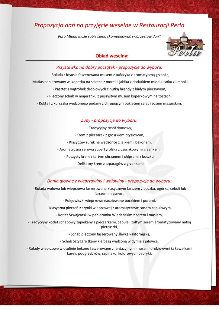 Propozycja dao na przyjęcie weselne w Restauracji Perła