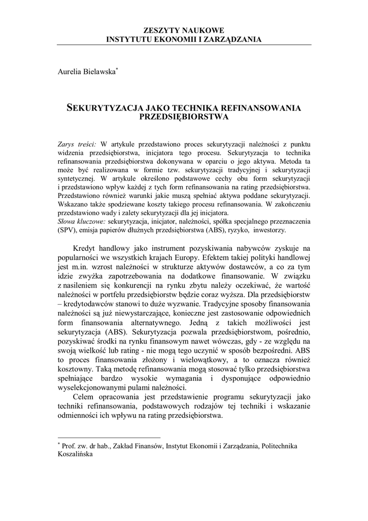 ZESZYTY NAUKOWE INSTYTUTU EKONOMII I ZARZĄDZANIA Aurelia Bielawska SEKURYTYZACJA JAKO TECHNIKA REFINANSOWANIA PRZEDSIĘBIORSTWA Zarys treści: W artykule przedstawiono proces sekurytyzacji należności z punktu widzenia przedsiębiorstwa, inicjatora tego procesu. Sekurytyzacja to technika refinansowania przedsiębiorstwa dokonywana w oparciu o jego aktywa. Metoda ta może być realizowana w formie tzw. sekurytyzacji tradycyjnej i sekurytyzacji syntetycznej. W artykule określono podstawowe cechy obu form sekurytyzacji i przedstawiono wpływ każdej z tych form refinansowania na rating przedsiębiorstwa. Przedstawiono również warunki jakie muszą spełniać aktywa poddane sekurytyzacji. Wskazano także spodziewane koszty takiego procesu refinansowania. W zakończeniu przedstawiono wady i zalety sekurytyzacji dla jej inicjatora. Słowa kluczowe: sekurytyzacja, inicjator, należności, spółka specjalnego przeznaczenia (SPV), emisja papierów dłużnych przedsiębiorstwa (ABS), ryzyko, inwestorzy. Kredyt handlowy jako instrument pozyskiwania nabywców zyskuje na popularności we wszystkich krajach Europy. Efektem takiej polityki handlowej jest m.in. wzrost należności w strukturze aktywów dostawców, a co za tym idzie zwyżka zapotrzebowania na dodatkowe finansowanie. W związku z nasileniem się konkurencji na rynku zbytu należy oczekiwać, że wartość należności w portfelu przedsiębiorstw będzie coraz wyższa. Dla przedsiębiorstw – kredytodawców stanowi to duże wyzwanie. Tradycyjne sposoby finansowania należności są już niewystarczające, konieczne jest zastosowanie odpowiednich form finansowania alternatywnego. Jedną z takich możliwości jest sekurytyzacja (ABS). Sekurytyzacja pozwala przedsiębiorstwom, pośrednio, pozyskiwać środki na rynku finansowym nawet wówczas, gdy - ze względu na swoją wielkość lub rating - nie mogą tego uczynić w sposób bezpośredni. ABS to proces finansowania złożony i wielowątkowy, a to oznacza również kosztowny. Taką metodę refinansowania mogą stosować tylko przedsiębiorstwa spełniające bardzo wysokie wymagania i dysponujące odpowiednio wyselekcjonowanymi pulami należności. Celem opracowania jest przedstawienie programu sekurytyzacji jako techniki refinansowania, podstawowych rodzajów tej techniki i wskazanie odmienności ich wpływu na rating przedsiębiorstwa. Prof. zw. dr hab., Zakład Finansów, Instytut Ekonomii i Zarządzania, Politechnika Koszalińska Aurelia Bielawska Pojęcie i istota sekurytyzacji Istotą sekurytyzacji jest wydzielenie z majątku przedsiębiorstwa (inicjatora transakcji), prawne usamodzielnienie i ubezpieczenie zdywersyfikowanej puli najlepiej homogenicznych aktywów oraz ich sprzedaż na rynku finansowym w formie papierów wartościowych, niezależnie od ich wcześniejszego właściciela. Sekurytyzowane należności („Asset-Backed“) stanowią zabezpieczenie („Securities“) papierów wartościowych plasowanych na rynku finansowym i oferowanych inwestorom instytucjonalnym. ABS jest również sposobem na zmniejszenie ryzyka finansowego inicjatora, co jest szczególnie istotne ze względu na coraz ostrzejsze wymagania banków - odnośnie do zarządzania ryzykiem kredytobiorców - wynikające z implementacji Nowej Umowy Kapitałowej. Technika ABS zrodziła się, w latach siedemdziesiątych ubiegłego wieku, na gruncie amerykańskiego systemu finansowego. Na kontynencie europejskim pojawiła się po raz pierwszy na Wyspach Brytyjskich w roku 1987; gdzie dokonano sekurytyzacji kredytów hipotecznych. Następnie ten sposób refinansowania został zastosowany we Francję, Belgii, Hiszpanii, Niemczech, Szwecji, Włoszech. W Polsce pierwszy program sekurytyzacji aktywów uruchomiono w 1999. Sekurytyzacja to nowoczesna technika refinansowania, w ramach której zdywersyfikowana pula aktywów wraz z generowanymi przez nie strumieniami pieniężnymi zostaje wyizolowana z bilansu podmiotu gospodarczego (inicjatora transakcji), zabezpieczona dzięki wewnętrznym lub zewnętrznym technikom oraz prawnie usamodzielniona w spółce celowej tzw. spółce specjalnego przeznaczenia (SPV). SPV następnie refinansuje zakupioną pulę aktywów poprzez emisję papierów dłużnych na krajowych i (lub) międzynarodowych rynkach finansowych. Spółka celowa musi być podmiotem niezależnym od inicjatora, oznacza to, że inicjator nie może rozporządzać majątkiem SPV. SPV nie może ponosić odpowiedzialności za zobowiązania żadnego innego podmiotu, nie może również angażować się w działalność inną niż odnosząca się do zarządzania majątkiem będącym przedmiotem sekurytyzacji. Spółka celowa nie może być powiązana kapitałowo bądź organizacyjnie z inicjatorem transakcji, co oznacza, iż inicjator nie może być w sposób pośredni lub bezpośredni akcjonariuszem bądź wspólnikiem, jak również inicjator nie może nabywać jakichkolwiek papierów obligacyjnych uprawniających do zamiany na akcje lub udziały spółki celowej. Zakaz powiązań organizacyjnych pomiędzy spółką specjalnego przeznaczenia a inicjatorem odnosi się przede wszystkim do łączenia funkcji w zarządach lub w radach obu instytucji. Przedmiotem działalności tak zorganizowanej spółki SPV może być wyłącznie nabywanie wierzytelności, emisja papierów wartościowych oraz wykonywanie czynności z tym związanych. 162 Sekurytyzacja jako technika… Dłużnicy spłata zobowiązań Transakcja swapowa / zabezpieczająca nadanie ratingu oplata za transakcję zawarcie transakcji swapowej Doradca /zabezpieczenie spłaty (specjalne konto) Inicjator (aranżer) AKTYWA opłata na rzecz doradcy PASYWA pula aktywów finansowych Agencja ratingowa koszty nadania ratingu koszty ubezpieczeni a Podmiot udzielający zabezpieczeń transfer aktywów zapłata za aktywa dodatkowe zabezpieczenia kontrakty pierwotne raty kapitałowe i odsetki Spółka Specjalnego Przeznaczenia (SPV) emisja ABS ubezpieczenie transakcji przyc