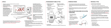 Witaj! Dziękujemy za wybranie produktu Polar! W tym niewielkim poradniku przedstawimy podstawowe funkcje FT60, Twojego partnera w pracy nad lepszą kondycją. Serwis internetowy polarpersonaltrainer.com Korzystanie z serwisu jest darmowe, jednak do przesyłania danych treningowych potrzebne jest urządzenie Polar FlowLink (sprzedawane oddzielnie). Na stronie internetowej można śledzić postępy i otrzymać porady dotyczące treningu. Pełną wersję podręcznika użytkownika oraz najnowszą wersję niniejszego poradnika można pobrać ze strony polar.com/support. Aby dowiedzieć się więcej, obejrzyj nasze poradniki wideo na stronie polar.com/en/polar_community/videos. Poznawanie funkcji FT60 Pulsometr Polar FT60 Jeśli chcesz regularnie trenować i chcesz wiedzieć jak osiągnąć najlepsze wyniki, FT60 zmotywuje Cię do pracy, zmierzy Twoje tętno i inne dane podczas treningu, dostarczy informacje o efektach Twojego treningu, utworzy programy treningowe na podstawie Twoich celów oraz umożliwi Ci przeprowadzenie testu Polar Fitness test i śledzenie swoich postępów. Pierwsze kroki Podświetlenie (LIGHT) »» Wejście do menu podręcznego »» Podświetlenie wyświetlacza Góra/dół (UP/DOwn) »» Wejście i poruszanie się po menu »» Ustawianie wartości Przed rozpoczęciem treningu z FT60, musisz wykonać kilka czynności. Aby uruchomić pulsometr, naciśnij i przytrzymaj dowolny przycisk przez kilka sekund. Następnie podaj podstawowe informacje. Wstecz (BACK) »» Powrót do poprzedniego poziomu »» Anulowanie wyboru OK »» Potwierdzenie wyboru »» Wejście do trybu treningowego Staraj się podać precyzyjne dane. To od nich w dużej mierze zależy dokładność pomiarów takich wartości jak limit tętna czy liczba spalanych kalorii. Zakładanie nadajnika na klatkę piersiową MENU Data LIGHT Nadajnik na klatkę piersiową Polar Załóż wygodny pasek i kostkę na klatkę piersiową, aby wykonywać precyzyjny pomiar tętna w czasie rzeczywistym i wyświetlać wyniki na pulsometrze. Dostępne akcesoria Polar »» Sensor biegowy Polar S1TM bezprzewodowo mierzy prędkość/ tempo biegu oraz dystans »» Sensor GPS Polar G1 bezprzewodowo mierzy prędkość/tempo i dystans podczas uprawiania sportów takich jak jazda na rowerze czy bieganie »» Polar FlowLink przesyła Twoje dane treningowe do serwisu polarpersonaltrainer.com TUE 18.05. 1. Zwilż miejsca na pasku, w których widoczne są elektrody. UP OK TRAINING MENU Applications DOWN 2. Zapnij pasek wokół klatki piersiowej i dopasuj długość paska, aby przylegał do ciała. 3. Zamocuj kostkę. MENU BACK Settings Czy wiesz że? Aby sprawdzić czas, zbliż pulsometr do nadajnika na klatkę piersiową. Po każdej sesji treningowej zdejmuj kostkę, a pasek płucz pod bieżącą wodą. Szczegółowe informacje znajdują się w pełnej instrukcji użytkownika na stronie polar.com/ support. Trening z FT60 Rozpoczęcie treningu 1. Załóż pulsometr i nadajnik na klatkę piersiową. 2. W trybie wyświetlania czasu jednokrotnie naciśnij przycisk OK, aby uruchomić tryb oczekiwania. Zaczekaj, aż praca serca zostanie wykryta, a następnie ponownie naciśnij przycisk OK, aby rozpocząć zapis sesji treningowej. Podczas treningu możesz sprawdzić swoje tętno, spalone kalorie, czas trwania treningu i informacje o strefie w czasie rzeczywistym Sprawdzając te dane w trakcie i po treningu, szybko dowiesz się, jakie poziomy są dla Ciebie odpowiednie. Odwiedź polar.com/ support, aby dowiedzieć się więcej na temat korzyści trenowania na różnych poziomach intensywności. Wstrzymywanie i kończenie treningu Aby wstrzymać sesję treningową, naciśnij Back (wstecz). Aby kontynuować, naciśnij OK. Aby zakończyć sesję, naciśnij Back (wstecz) ponownie. Po każdej sesji zostanie wyświetlone podsumowanie ostatniego treningu. Zawiera ono: »» »» »» »» »» czas trwania sesji, efekty treningu, intensywność treningu, liczbę spalonych kalorii, średnie i maksymalne tętno. Najważniejsze funkcje Program treningowy Polar STAR Program treningowy STAR to osobisty program treningowy na Twoim nadgarstku, który stale Cię motywuje. Podpowiada jak długo i jak intensywnie trenować, aby osiągnąć długoterminowe cele. Po wybraniu celu treningowego program STAR wyznacza cel tygodniowy. Otrzymasz informacje o swoich postępach po każdym treningu i na koniec każdego tygodnia. Na podstawie wyników treningowych z całego tygodnia oraz poziomu sprawności użytkownika program treningowy ustala wytyczne na następny tydzień. Aby utworzyć nowy program treningowy, wybierz Menu > Applications > Training program > Create new program (Menu > Aplikacje > Program treningowy > Utwórz nowy program). Jeśli potrzebujesz pomocy, wiele dodatkowych informacji znajdziesz na stronie polar. com/support. Polar Fitness Test Polar Fitness Test pozwala sprawdzić poziom sprawności w zaledwie 5 minut. Test oblicza Twoje maksymalne zużycie tlenu (VO2max) na podstawie podanych informacji i Twojego tętna spoczynkowego. Dzięki porównywaniu wyników testów możesz śledzić postępy swojego treningu. Aby rozpocząć test wydolności, wybierz Menu > Applications > Fitness test > Start test (Menu > Aplikacje > Test wydolności > Rozpocznij test). Wymiana baterii jest łatwa Pulsometr 1. Otwórz pokrywę baterii za pomocą monety. 2. Podważ i wyjmij zużytą baterię za pomocą niewielkiego patyczka. Uważaj, aby nie uszkodzić pulsometru. 3. Włóż nową baterię biegunem dodatnim (+) na zewnątrz. Upewnij się, że pierścień uszczelniający nie jest uszkodzony. 4. Zamknij pokrywę baterii. Nadajnik na klatkę piersiową 1. Podnieś pokrywę baterii za pomocą zapięcia na pasku. 2. Wyjmij zużytą baterię. 3. Włóż nową baterię biegunem ujemnym (-) na zewnątrz. 4. Dopasuj brzeg pokrywy baterii do wcięcia w kostce i wciśnij ją z powrotem na miejsce. Usłyszysz kliknięcie, gdy pokrywa znajdzie się na swoim miejscu. Szczegółowe i