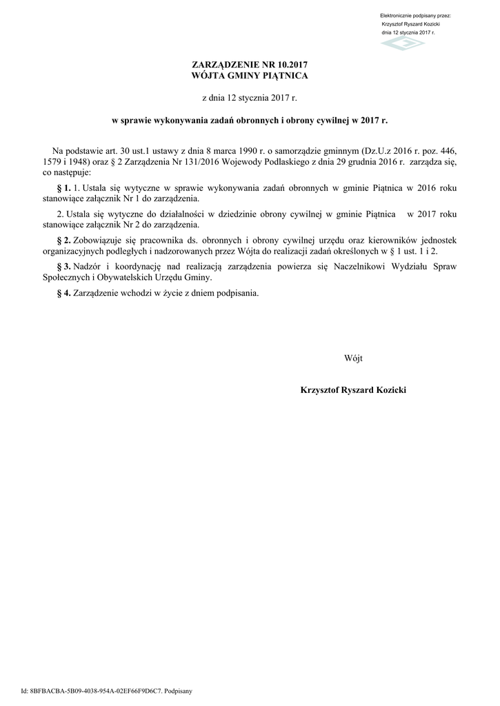 Elektronicznie podpisany przez: Krzysztof Ryszard Kozicki dnia 12 stycznia 2017 r. ZARZĄDZENIE NR 10.2017 WÓJTA GMINY PIĄTNICA z dnia 12 stycznia 2017 r. w sprawie wykonywania zadań obronnych i obrony cywilnej w 2017 r. Na podstawie art. 30 ust.1 ustawy z dnia 8 marca 1990 r. o samorządzie gminnym (Dz.U.z 2016 r. poz. 446, 1579 i 1948) oraz § 2 Zarządzenia Nr 131/2016 Wojewody Podlaskiego z dnia 29 grudnia 2016 r. zarządza się, co następuje: § 1. 1. Ustala się wytyczne w sprawie wykonywania zadań obronnych w gminie Piątnica w 2016 roku stanowiące załącznik Nr 1 do zarządzenia. 2. Ustala się wytyczne do działalności w dziedzinie obrony cywilnej w gminie Piątnica stanowiące załącznik Nr 2 do zarządzenia. w 2017 roku § 2. Zobowiązuje się pracownika ds. obronnych i obrony cywilnej urzędu oraz kierowników jednostek organizacyjnych podległych i nadzorowanych przez Wójta do realizacji zadań określonych w § 1 ust. 1 i 2. § 3. Nadzór i koordynację nad realizacją zarządzenia powierza się Naczelnikowi Wydziału Spraw Społecznych i Obywatelskich Urzędu Gminy. § 4. Zarządzenie wchodzi w życie z dniem podpisania. Wójt Krzysztof Ryszard Kozicki Id: 8BFBACBA-5B09-4038-954A-02EF66F9D6C7. Podpisany Załącznik Nr 1 do Zarządzenia Nr 10.2017 Wójta Gminy Piątnica z dnia 12 stycznia 2017 r. I. Wytyczne w sprawie wykonywania zadań obronnych w Gminie Piątnica w 2017 r. § 1. Zasadniczym celem działania w zakresie pozamilitarnych przygotowań obronnych w gminie Piątnica w 2017 roku będzie doskonalenie organizacji i funkcjonowania systemu kierowania obroną gminy Piątnica. § 2. Ustala się szczegółowe zadania w zakresie przygotowań w 2017 r., zmierzające do osiągnięcia celów wskazanych w § 1: obronnych do wykonania 1) dokonanie analizy wybranych z wypisu „Planu operacyjnego funkcjonowania gminy Piątnica w warunkach zewnętrznego zagrożenia bezpieczeństwa państwa i w czasie wojny” zadań operacyjnych, planowanych do wykonania we własnej jednostce organizacyjnej w stanach gotowości obronnej państwa; 2) doskonalenie działań w zakresie przygotowania urzędu do realizacji zadań w warunkach zewnętrznego zagrożenia bezpieczeństwa państwa i w czasie wojny oraz przystosowania i przemieszczenia urzędu na stanowisko kierowania w zapasowym miejscu pracy w przypadku wystąpienia szczególnych zagrożeń, w tym znajomość przez osoby funkcyjne zadań ujętych w instrukcji organizacji pracy na głównym stanowisku kierowania w swojej stałej siedzibie i zapasowym miejscu pracy poprzez zapewnienie regularności oraz zwiększenia skuteczności szkolenia obronnego; 3) dokonanie przeglądu i aktualizacji planów akcji kurierskiej z Wojskowym Komendantem Uzupełnień i Komendantem Policji w Łomży; oraz ich uzgodnienie 4) prowadzenie przez wójta postępowań administracyjnych w sprawie wydawania decyzji administracyjnych w sprawie świadczeń na rzecz obrony, zgodnie ze złożonymi wnioskami; 5) posiadanie aktualnych i przystosowanych do warunków funkcjonowania urzędu dokumentów wspomagających kierowanie: a) dokumentacji określającej sposób rozwinięcia, funkcjonowania oraz przemieszczania głównego stanowiska kierowania, organizowanego w stałej siedzibie urzędu oraz w zapasowym miejscu pracy, b) dokumentacji stałego dyżuru z zadaniem dostosowania jej do realnych uwarunkowań organizacyjnych w gminie; 6) kontynuowanie działań w zakresie modernizacji i utrzymania głównego stanowiska kierowania w stałej siedzibie urzędu oraz zapasowym miejscu pracy; 7) dokonanie identyfikacji zadań obronnych wynikających z obowiązujących aktów prawnych oraz ujęcie ich treści w „Regulaminie Organizacyjnym Urzędu Gminy Piątnica” oraz w obowiązkach pracowników realizujących zadania obronne; 8) szczegółowe kierunki działania w zakresie szkolenia obronnego: a) opracowanie planu szkolenia obronnego na rok 2017, b) uzgodnienie planu szkolenia obronnego na rok 2017 z Dyrektorem Wydziału Bezpieczeństwa i Zarządzania Kryzysowego Podlaskiego Urzędu Wojewódzkiego, c) utrzymywanie wymaganego poziomu gotowości stałego dyżuru Wójta w zakresie realizacji zadań na potrzeby podwyższania gotowości obronnej państwa, d) podnoszenie poziomu gotowości do uruchamiania i funkcjonowania stałego dyżuru wójta podczas organizowanych szkoleń i ćwiczeń obronnych zapewniających ciągłość przekazywania informacji i decyzji; 9) opracowanie na podstawie niniejszego zarządzenia, kalendarzowego planu działania, realizacji zadań obronnych w 2017 r.; Id: 8BFBACBA-5B09-4038-954A-02EF66F9D6C7. Podpisany w sprawie 10) przygotowanie podmiotów leczniczych na potrzeby obronne państwa, w szczególności dotyczących sprawnego funkcjonowania szpitalnej bazy łóżkowej (ZMSz) z zapewnieniem niezbędnego personelu medycznego. II. Plan realizacji zadań obronnych w gminie Piątnica w 2017 r. Lp. 1. 2. 3. 4. 5. 6. 7. 8. 9. Treść przedsięwzięcia Opracowanie, na podstawie przesłanego zarządzenia Wojewody, planu realizacji zadań w zakresie pozamilitatrnych przygotowań obronnych gminy w 2017 r., uwzględniającego zadania dla jednostek podległych i podporządkowanych mających swoją siedzibę na terenie gminy. Dokonanie bilansu kadry medycznej mającej przydział do obsługi ZMSz. Przesłanie do dyrektora Wydziału Bezpieczeństwa i Zarządzania Kryzysowego propozycji zmiany lokalizacji Zastępczych Miejsc Szpitalnych. Aktualizacja programu szkolenia obronnego na lata 2017 – 2019. Opracowanie planu kontroli problemowych wykonywania zadań obronnych w jednostkach podległych i podporządkowanych, którym powierzono zadania obronne. We współdziałaniu z Wydziałem Spraw Obywatelskich i Cudzoziemców Podlaskiego Urzędu Wojewódzkiego: a)udział w przeprowadzeniu rejestracji i kwalifikacji wojskowej na terenie gminy; b) dokonanie przeglądu i aktualizacji planu akcji kurierskiej, c)dokonanie przeglądu i aktualizacji planu rozplakatowania ob