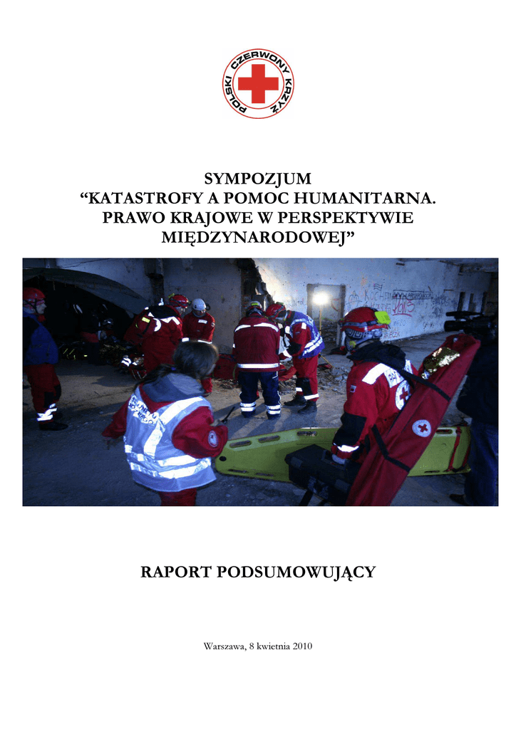 SYMPOZJUM “KATASTROFY A POMOC HUMANITARNA. PRAWO KRAJOWE W PERSPEKTYWIE MIĘDZYNARODOWEJ” RAPORT PODSUMOWUJĄCY Warszawa, 8 kwietnia 2010 I. INFORMACJE OGÓLNE Sympozjum „Katastrofy a pomoc humanitarna. Prawo krajowe w perspektywie międzynarodowej” odbyło się dnia 8 kwietnia br. w siedzibie Zarządu Głównego Polskiego Czerwonego Krzyża w Warszawie. Wzięło w nim udział 35 osób – przedstawicieli wszystkich czołowych instytucji zajmujących się zarządzaniem kryzysowym w Polsce jak i wysyłaniem pomocy humanitarnej poza granice naszego kraju. Sympozjum prowadzone było przez p. Magdalenę Stefańską, Kierownika Działu Współpracy z Zagranicą w biurze ZG PCK. Uczestnicy powitani zostali ze strony PCK przez dr Elżbietę Mikos-Skuzę – Wiceprezesa Zarządu Głównego PCK oraz ze strony instytucji wspierających przez – p. Davida Fischera (Międzynarodowa Federacja Stowarzyszeń Czerwonego Krzyża i Czerwonego Półksiężyca) i p. Pawła Solocha (Biuro Bezpieczeństwa Narodowego). Sympozjum miało charakter podwójny – pierwsza część poświęcona była w treści i formie przede wszystkim programowi International Disaster Response Law realizowanego na poziomie Międzynarodowej Federacji jak i europejskich stowarzyszeń krajowych (z Francji i Niemiec) oraz prezentacji problemów związanych z przyjmowaniem i wysyłaniem pomocy humanitarnej przez Polskę z perspektywy instytucji publicznych (Biuro Bezpieczeństwa Narodowego, Krajowe Centrum Koordynacji Ratownictwa i Ochrony Ludności) jak i organizacji pozarządowych (Polski Czerwony Krzyż). Część druga Sympozjum miała charakter warsztatowy – podzieli na grupy uczestnicy mieli za zadanie rozwiązać kazusy szczegółowe w oparciu o sytuację wyjściową – powódź w Polsce. Przed właściwym rozpoczęciem Sympozjum wszyscy uczestnicy spotkania otrzymali pakiet materiałów z czego najważniejsze były przetłumaczone na j. polski Wytyczne dotyczące usprawnienia krajowego systemu reagowania oraz międzynarodowej pomocy w sytuacji klęsk i katastrof oraz płyta CD z najważniejszymi dokumentami regulacji międzynarodowych oraz ustawodawstwa polskiego z dziedziny zarządzania kryzysowego i reagowania w sytuacjach klęsk i katastrof. II. CZĘŚĆ I – KONFERENCJA 1. Polski system reagowania na klęski i katastrofy – porządek prawny, model instytucjonalny Część pierwszą rozpoczął p. Paweł Soloch z Biura Bezpieczeństwa Narodowego prezentując system prawny i instytucjonalny zarządzania kryzysowego w Polsce. Początek swojej prezentacji poświęcił przedstawieniu zagadnień związanych z obroną cywilną (pojęcie obrony cywilnej, organizacji obrony cywilnej, ich personelu i materiałów), by następnie przejść do zagadnienia zarządzania kryzysowego. Opisane zostały poszczególne jego fazy (reagowanie, odbudowa, zapobieganie i przygotowanie) oraz jego zakres tematyczny i instytucjonalny ujęty w Ustawie z dnia 26 kwietnia 2007 o zarządzaniu kryzysowym. P. Soloch zwrócił uwagę na wielość definicji (zarządzanie kryzysowe, sytuacja kryzysowa, infrastruktura krytyczna, ochrona infrastruktury krytycznej, planowanie cywilne) jak i złożoność systemu, mającą swe źródło w liczbie podmiotów uczestniczących w systemie zarządzania kryzysowego (administracja rządowa i podległe jej służby, organy samorządu terytorialnego, właściciele oraz posiadacze samoistni obiektów, instalacji lub urządzeń infrastruktury krytycznej) oraz równoległe występowanie planów tego zarządzania na każdym szczeblu administracji terytorialnej (krajowym, wojewódzkim, powiatowym i gminnym). P. Soloch poświęcił kilka minut swojej prezentacji zagadnieniu infrastruktury krytycznej a w szczególności problemowi wyznaczania obiektów tej infrastruktury przez Szefa Rządowego Centrum Bezpieczeństwa. Poruszona została ponadto obecna w Ustawie kwestia zagrożenia terroryzmem. Prelegent zakończył swoją prezentację przedstawieniem schematu instytucjonalnego zarządzania kryzysowego w Polsce. 2. International Disaster Response Law from the European perspective David Fischer z Międzynarodowej Federacji Stowarzyszeń Czerwonego Krzyża i Czerwonego Półksiężyca zaprezentował program International Disaster Response Law – przyczyny jego powstania oraz wyniki dotychczasowych prac. Swoje wystąpienie rozpoczął od krótkiego przypomnienia nt. różnorodności struktur i organizacji wchodzących w skład Międzynarodowego Ruchu Czerwonego Krzyża i Czerwonego Półksiężyca (Międzynarodowy Komitet Czerwonego Krzyża, Międzynarodowa Federacja Stowarzyszeń Czerwonego Krzyża i Czerwonego Półksiężyca oraz 186 Stowarzyszeń Krajowych). Przeszedł następnie do punktu dotyczącego początków programu IDRL. Rozpoczął się on serią badań i opracowaniem zbioru zawierającego 34 przykłady rozwiązań prawnych z całego globu a praca związana ze zbieraniem danych nt. krajowego ustawodawstwa jest kontynuowana do dziś dnia. Federacja jest w ten proces włączona od samego początku, oferując swoją pomoc techniczną, merytoryczną (organizacja seminariów, konferencji, badania oraz dialog z władzami). P. Fischer podkreślił, iż temat IDRL jest o tyle ważny, iż w związku z ciągłymi zmianami klimatu i zwiększającą się liczbą katastrof naturalnych i technicznych oraz rosnącą liczbą organizacji pomocowych, istnienie międzynarodowych reguł prawnych rządzących dostarczaniem pomocy humanitarnej jest niezbędne. Problemy wizowe, cłowe lub związane z uznaniem kwalifikacji specjalistów pomoc tę mogą często opóźnić lub całkowicie wstrzymać. Dlatego też znaczenie programu IDRL i opracowanych w jego toku Wytycznych zostało podkreślone na 30. Międzynarodowej Konferencji Ruchu CK i CP, podczas której przyjęto rezolucję nr 4 zobowiązującą państwa do wdrażania tychże Wytycznych. Rezolucja zaowocowała przyjęciem przynajmniej 4 nowych ustaw na poziomie krajowym ora