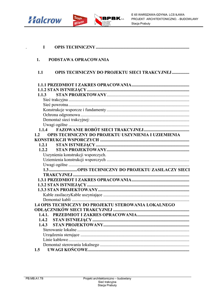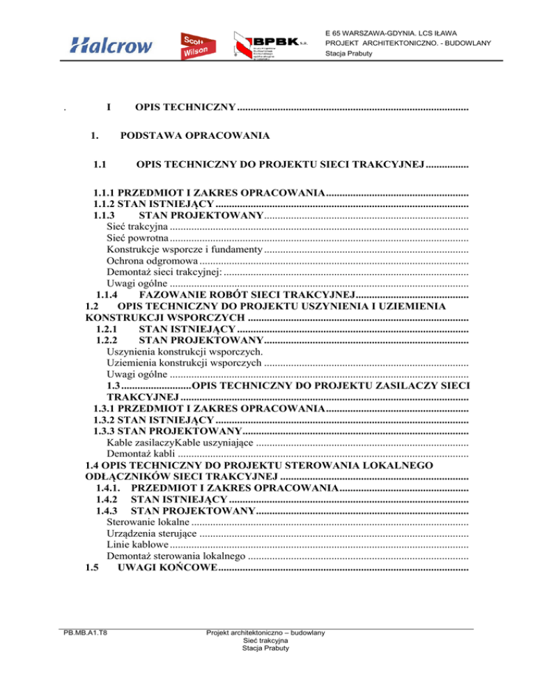 E 65 WARSZAWA-GDYNIA. LCS IŁAWA PROJEKT ARCHITEKTONICZNO. - BUDOWLANY Stacja Prabuty . I 1. 1.1 OPIS TECHNICZNY ...................................................................................... PODSTAWA OPRACOWANIA OPIS TECHNICZNY DO PROJEKTU SIECI TRAKCYJNEJ ................ 1.1.1 PRZEDMIOT I ZAKRES OPRACOWANIA ..................................................... 1.1.2 STAN ISTNIEJĄCY .............................................................................................. 1.1.3 STAN PROJEKTOWANY............................................................................ Sieć trakcyjna ............................................................................................................... Sieć powrotna ............................................................................................................... Konstrukcje wsporcze i fundamenty ............................................................................ Ochrona odgromowa .................................................................................................... Demontaż sieci trakcyjnej: ........................................................................................... Uwagi ogólne ............................................................................................................... 1.1.4 FAZOWANIE ROBÓT SIECI TRAKCYJNEJ .......................................... 1.2 OPIS TECHNICZNY DO PROJEKTU USZYNIENIA I UZIEMIENIA KONSTRUKCJI WSPORCZYCH .................................................................................. 1.2.1 STAN ISTNIEJĄCY ...................................................................................... 1.2.2 STAN PROJEKTOWANY............................................................................ Uszynienia konstrukcji wsporczych. Uziemienia konstrukcji wsporczych ............................................................................ Uwagi ogólne ............................................................................................................... 1.3 .......................... OPIS TECHNICZNY DO PROJEKTU ZASILACZY SIECI TRAKCYJNEJ ........................................................................................................... 1.3.1 PRZEDMIOT I ZAKRES OPRACOWANIA ..................................................... 1.3.2 STAN ISTNIEJĄCY .............................................................................................. 1.3.3 STAN PROJEKTOWANY.................................................................................... Kable zasilaczyKable uszyniające ............................................................................... Demontaż kabli ............................................................................................................ 1.4 OPIS TECHNICZNY DO PROJEKTU STEROWANIA LOKALNEGO ODŁĄCZNIKÓW SIECI TRAKCYJNEJ ...................................................................... 1.4.1. PRZEDMIOT I ZAKRES OPRACOWANIA ................................................ 1.4.2 STAN ISTNIEJĄCY ......................................................................................... 1.4.3 STAN PROJEKTOWANY............................................................................... Sterowanie lokalne ....................................................................................................... Urządzenia sterujące .................................................................................................... Linie kablowe ............................................................................................................... Demontaż sterowania lokalnego .................................................................................. 1.5 UWAGI KOŃCOWE ............................................................................................. PB.MB.A1.T8 Projekt architektoniczno – budowlany Sieć trakcyjna Stacja Prabuty E 65 WARSZAWA-GDYNIA. LCS IŁAWA PROJEKT ARCHITEKTONICZNO. - BUDOWLANY Stacja Prabuty 1.6 ZAŁĄCZNIKI .............................................................................................................. 1.6.1 ZAŁĄCZNIK NR 1 Oświadczenia ..................................................................... Oświadczenie projektanta……………………………………………………………. Oświadczenie sprawdzającego……………………………………………………….. 1.6.2 ZAŁĄCZNIK NR 2 Uzgodnienia Pismo - wystąpienie o uzgodnienie z dn 02.12.2008 Uzgodnienie - Pismo "PKP Energetyka " spółka z o.o. Zakład Północny 1.7 INFORMACJA „PLAN BEZPIECZEŃSTWA I OCHRONY ZDROWIA” („PLAN BIOZ”) ................................................................................................................. II. CZĘŚĆ RYSUNKOWA 1. Plan sytuacyjny sieci trakcyjnej – skala 1:500 Rys. nr 1 arkusz 1/3 – od km 240,343 do km 241,100 arkusz 2/3 – od km 241,100 do km 242,280 arkusz 3/3 – od km 242,280 do km 243,092 2. Plan sytuacyjny zasilaczy sieci trakcyjnej – skala 1:500 Rys. nr 2 arkusz 1/1 -- od km 242,350 do km 243,050 3. Plan sytuacyjny sterowania lokalnego odłączników – skala 1:500 Rys. nr 3 arkusz 1/3 -- od km 240,900 do km 241,500 arkusz 2/3 -- od km 241,500 do km 242,450 arkusz 3/3 – od km 242,450 do km 242,050 4. Schemat sekcjonowania sieci trakcyjnej Rys. nr 2 arkusz 1/1 5. Schemat sterowania odłączników sieci trakcyjnej Rys. nr 3 arkusz 1/1 PB.MB.A1.T8 Projekt architektoniczno – budowlany Sieć trakcyjna Stacja Prabuty E 65 WARSZAWA-GDYNIA. LCS IŁAWA PROJEKT ARCHITEKTONICZNO. - BUDOWLANY Stacja Prabuty OPIS TECHNICZNY 1. PODSTAWA OPRACOWANIA. Zlecenia Inwestora – PKP PLK S.A. Koncepcja Programowo – Przestrzenna opracowana przez firmę Scott Wilson i zatwierdzona przez PKP PLK S.A. Warunki techniczne, jakim powinny odpowiadać budowle kolejowe i ich usytuowanie. Dz. U. Nr 151/1998 poz. 987 Prawo Budowlane (tekst jednolity Dz. U. 2003r nr 207 poz. 