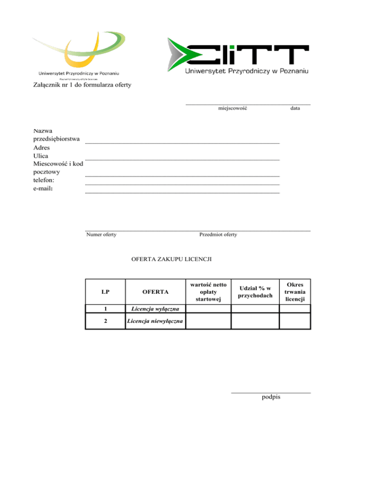 Załącznik nr 1 do formularza oferty miejscowość data Nazwa przedsiębiorstwa Adres Ulica Miescowość i kod pocztowy telefon: e-mail: Numer oferty Przedmiot oferty OFERTA ZAKUPU LICENCJI LP OFERTA 1 Licencja wyłączna 2 Licencja niewyłączna wartość netto opłaty startowej Udział % w przychodach podpis Okres trwania licencji