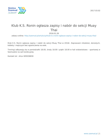 2017.03.02 Klub K.S. Ronin ogłasza zapisy i nabór do sekcji Muay Thai 2016.01.26 zobacz online: http://szemud.pl/artykuly/klub-k-s-ronin-oglasza-zapisy-i-nabor-do-sekcji-muay-thai/ Klub K.S. Ronin ogłasza zapisy i nabór do sekcji Muay Thai w 2016r. Zapraszam młodzież, dorosłych, kobiety i mężczyzn bez ograniczenia na wiek. Treningi odbywają się w poniedziałki 18.00, środy 18.00 i piątki 18.00 w hali widowiskowo – sportowej w Szemudzie na sali korekcyjnej. Kontakt tel : Artur 605036830 www.szemud.pl | 1