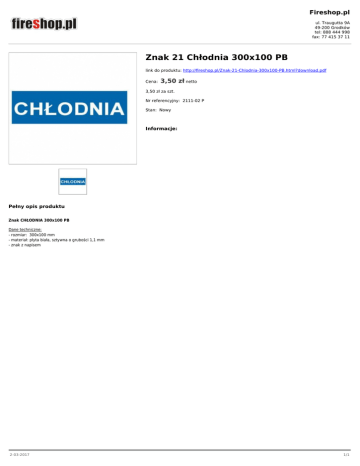 Fireshop.pl ul. Traugutta 9A 49-200 Grodków tel: 888 444 998 fax: 77 415 37 11 Znak 21 Chłodnia 300x100 PB link do produktu: http://fireshop.pl/Znak-21-Chlodnia-300x100-PB.html?download.pdf Cena: 3,50 zł netto 3,50 zł za szt. Nr referencyjny: 2111-02 P Stan: Nowy Informacje: Pełny opis produktu Znak CHŁODNIA 300x100 PB Dane techniczne: - rozmiar: 300x100 mm - materiał: płyta biała, sztywna o grubości 1,1 mm - znak z napisem 2-03-2017 1/1