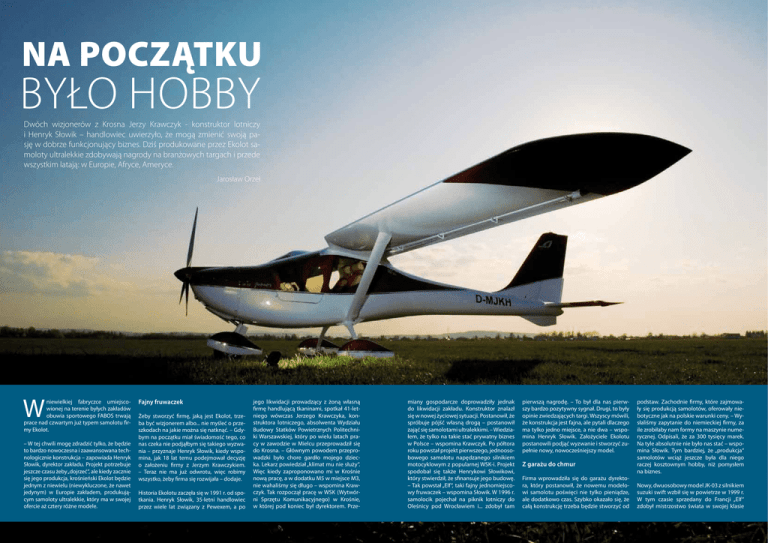 Na początku było hobby Dwóch wizjonerów z Krosna Jerzy Krawczyk - konstruktor lotniczy i Henryk Słowik – handlowiec uwierzyło, że mogą zmienić swoją pasję w dobrze funkcjonujący biznes. Dziś produkowane przez Ekolot samoloty ultralekkie zdobywają nagrody na branżowych targach i przede wszystkim latają: w Europie, Afryce, Ameryce. Jarosław Orzeł W niewielkiej fabryczce umiejscowionej na terenie byłych zakładów obuwia sportowego FABOS trwają prace nad czwartym już typem samolotu firmy Ekolot. – W tej chwili mogę zdradzić tylko, że będzie to bardzo nowoczesna i zaawansowana technologicznie konstrukcja – zapowiada Henryk Słowik, dyrektor zakładu. Projekt potrzebuje jeszcze czasu żeby „dojrzeć“, ale kiedy zacznie się jego produkcja, krośnieński Ekolot będzie jednym z niewielu (niewykluczone, że nawet jedynym) w Europie zakładem, produkującym samoloty ultralekkie, który ma w swojej ofercie aż cztery różne modele. 16 | Polski Przemysł Fajny fruwaczek Żeby stworzyć firmę, jaką jest Ekolot, trzeba być wizjonerem albo... nie myśleć o przeszkodach na jakie można się natknąć. – Gdybym na początku miał świadomość tego, co nas czeka nie podjąłbym się takiego wyzwania – przyznaje Henryk Słowik, kiedy wspomina, jak 18 lat temu podejmował decyzję o założeniu firmy z Jerzym Krawczykiem. – Teraz nie ma już odwrotu, więc robimy wszystko, żeby firma się rozwijała – dodaje. Historia Ekolotu zaczęła się w 1991 r. od spotkania. Henryk Słowik, 35-letni handlowiec przez wiele lat związany z Pewexem, a po jego likwidacji prowadzący z żoną własną firmę handlującą tkaninami, spotkał 41-letniego wówczas Jerzego Krawczyka, konstruktora lotniczego, absolwenta Wydziału Budowy Statków Powietrznych Politechniki Warszawskiej, który po wielu latach pracy w zawodzie w Mielcu przeprowadził się do Krosna. – Głównym powodem przeprowadzki było chore gardło mojego dziecka. Lekarz powiedział „klimat mu nie służy“. Więc kiedy zaproponowano mi w Krośnie nową pracę, a w dodatku M5 w miejsce M3, nie wahaliśmy się długo – wspomina Krawczyk. Tak rozpoczął pracę w WSK (Wytwórni Sprzętu Komunikacyjnego) w Krośnie, w której pod koniec był dyrektorem. Prze- miany gospodarcze doprowadziły jednak do likwidacji zakładu. Konstruktor znalazł się w nowej życiowej sytuacji. Postanowił, że spróbuje pójść własną drogą – postanowił zająć się samolotami ultralekkimi. – Wiedziałem, że tylko na takie stać prywatny biznes w Polsce – wspomina Krawczyk. Po półtora roku powstał projekt pierwszego, jednoosobowego samolotu napędzanego silnikiem motocyklowym z popularnej WSK-i. Projekt spodobał się także Henrykowi Słowikowi, który stwierdził, że sfinansuje jego budowę. – Tak powstał „Elf“, taki fajny jednomiejscowy fruwaczek – wspomina Słowik. W 1996 r. samolocik pojechał na piknik lotniczy do Oleśnicy pod Wrocławiem i... zdobył tam pierwszą nagrodę. – To był dla nas pierwszy bardzo pozytywny sygnał. Drugi, to były opinie zwiedzających targi. Wszyscy mówili, że konstrukcja jest fajna, ale pytali dlaczego ma tylko jedno miejsce, a nie dwa – wspomina Henryk Słowik. Założyciele Ekolotu postanowili podjąć wyzwanie i stworzyć zupełnie nowy, nowocześniejszy model. Z garażu do chmur Firma wprowadziła się do garażu dyrektora, który postanowił, że nowemu modelowi samolotu poświęci nie tylko pieniądze, ale dodatkowo czas. Szybko okazało się, że całą konstrukcję trzeba będzie stworzyć od podstaw. Zachodnie firmy, które zajmowały się produkcją samolotów, oferowały niebotyczne jak na polskie warunki ceny. – Wysłaliśmy zapytanie do niemieckiej firmy, za ile zrobiłaby nam formy na maszynie numerycznej. Odpisali, że za 300 tysięcy marek. Na tyle absolutnie nie było nas stać – wspomina Słowik. Tym bardziej, że „produkcja“ samolotów wciąż jeszcze była dla niego raczej kosztownym hobby, niż pomysłem na biznes. Nowy, dwuosobowy model JK-03 z silnikiem suzuki swift wzbił się w powietrze w 1999 r. W tym czasie sprzedany do Francji „Elf“ zdobył mistrzostwo świata w swojej klasie Polski Przemysł | 17 samolotów jednomiejscowych i po raz pierwszy pojawiło się poważne pytanie „co dalej“? – Nowy model był bardzo udany. Miał ochotę latać. Pilot, który go testował, ocenił go bardzo pozytywnie – wspomina Słowik. Intuicja Jerzego Krawczyka i doświadczenia zdobyte jeszcze w WSK, w którym spod jego ręki wyszedł np. dwumiejscowy szybowiec „Puchatek“ certyfikowany w Australii, USA, Anglii, Rosji i b. Jugosławii, okazały się niezawodne. Dodatkowo 3 tysiące godzin spędzonych wspólnie w garażu poświęconych na przygotowanie pierwszego JK-03 też zobowiązywały do podjęcia męskiej decyzji. Panowie postanowili, że spróbują swoich szans w podniebnym biznesie. Henryk Słowik wynajął pomieszczenia produkcyjne i zatrudnił 10 osób. Państwo Słowikowie rozszerzyli zakres działalności swojej firmy z handlowej na produkcyjną i powstała firma Ekolot. W 2000 roku ulepszony model JK-05 Junior był już pokazywany na międzynarodowych targach w Niemczech i podobał się. Konstrukcja zagościła na okładkach wielu znanych branżowych pism. Pani Małgorzata Słowik zaopiekowała się księgowością, a w sprzedaży pomaga ojcu także syn Konrad, który zajmuje się logistyką, wszystkimi sprawami zaopatrzeniowymi i wszystkim, co przychodzi i wychodzi z firmy. Nawet Sylwia, córka państwa Słowików, pomaga w Ekolocie. Studiuje angielski i jeździ z ojcem na targi, żeby pomagać w kontaktach z klientami. Do zespołu zarządzającego Ekolotem dołączył też Mariusz Buczko (33 lata), absolwent Wydziału Budowy Maszyn i Lotnictwa Politechniki Rzeszowskiej. Pełni w firmie zadania kierownika produkcji. Konsekwencją rozwoju firmy było pojawienie się kolejnego modelu. „Topaz“ wystartował w 2003