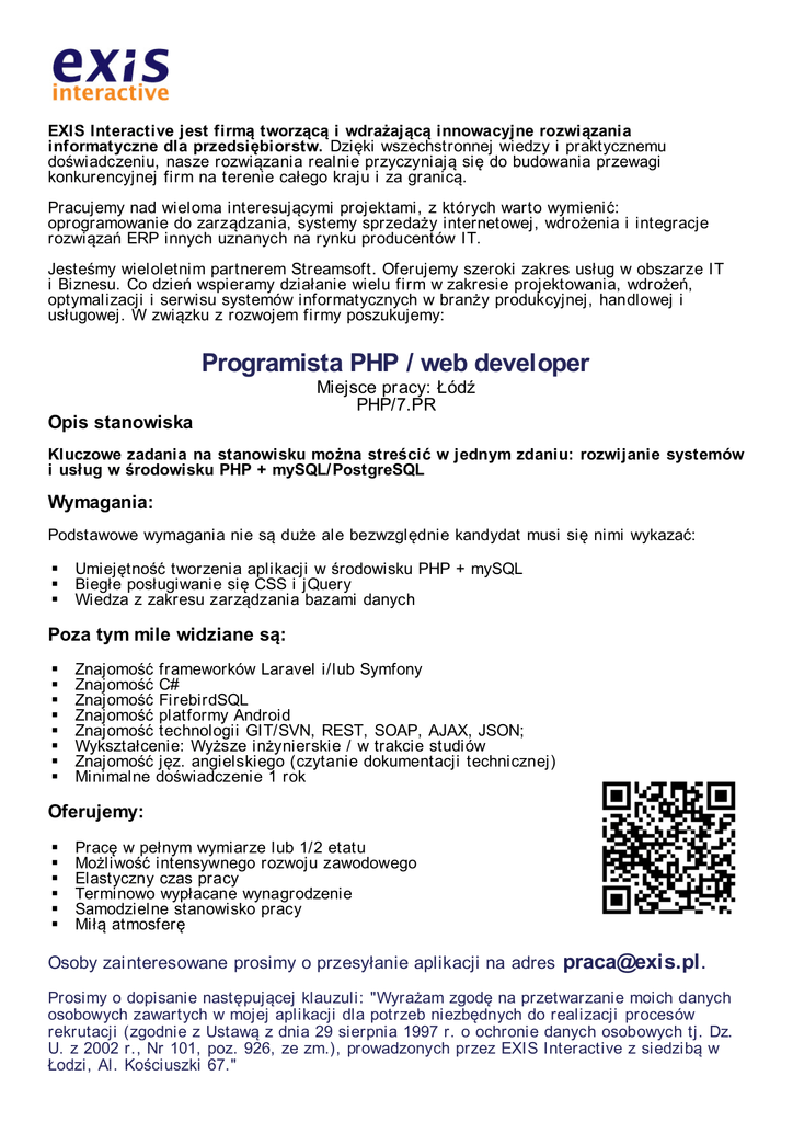 EXIS Interactive jest firmą tworzącą i wdrażającą innowacyjne rozwiązania informatyczne dla przedsiębiorstw. Dzięki wszechstronnej wiedzy i praktycznemu doświadczeniu, nasze rozwiązania realnie przyczyniają się do budowania przewagi konkurencyjnej firm na terenie całego kraju i za granicą. Pracujemy nad wieloma interesującymi projektami, z których warto wymienić: oprogramowanie do zarządzania, systemy sprzedaży internetowej, wdrożenia i integracje rozwiązań ERP innych uznanych na rynku producentów IT. Jesteśmy wieloletnim partnerem Streamsoft. Oferujemy szeroki zakres usług w obszarze IT i Biznesu. Co dzień wspieramy działanie wielu firm w zakresie projektowania, wdrożeń, optymalizacji i serwisu systemów informatycznych w branży produkcyjnej, handlowej i usługowej. W związku z rozwojem firmy poszukujemy: Programista PHP / web developer Miejsce pracy: Łódź PHP/7.PR Opis stanowiska Kluczowe zadania na stanowisku można streścić w jednym zdaniu: rozwijanie systemów i usług w środowisku PHP + mySQL/PostgreSQL Wymagania: Podstawowe wymagania nie są duże ale bezwzględnie kandydat musi się nimi wykazać: Umiejętność tworzenia aplikacji w środowisku PHP + mySQL Biegłe posługiwanie się CSS i jQuery Wiedza z zakresu zarządzania bazami danych Poza tym mile widziane są: Znajomość frameworków Laravel i/lub Symfony Znajomość C# Znajomość FirebirdSQL Znajomość platformy Android Znajomość technologii GIT/SVN, REST, SOAP, AJAX, JSON; Wykształcenie: Wyższe inżynierskie / w trakcie studiów Znajomość jęz. angielskiego (czytanie dokumentacji technicznej) Minimalne doświadczenie 1 rok Oferujemy: Pracę w pełnym wymiarze lub 1/2 etatu Możliwość intensywnego rozwoju zawodowego Elastyczny czas pracy Terminowo wypłacane wynagrodzenie Samodzielne stanowisko pracy Miłą atmosferę Osoby zainteresowane prosimy o przesyłanie aplikacji na adres [email protected] . Prosimy o dopisanie następującej klauzuli: "Wyrażam zgodę na przetwarzanie moich danych osobowych zawartych w mojej aplikacji dla potrzeb niezbędnych do realizacji procesów rekrutacji (zgodnie z Ustawą z dnia 29 sierpnia 1997 r. o ochronie danych osobowych tj. Dz. U. z 2002 r., Nr 101, poz. 926, ze zm.), prowadzonych przez EXIS Interactive z siedzibą w Łodzi, Al. Kościuszki 67."