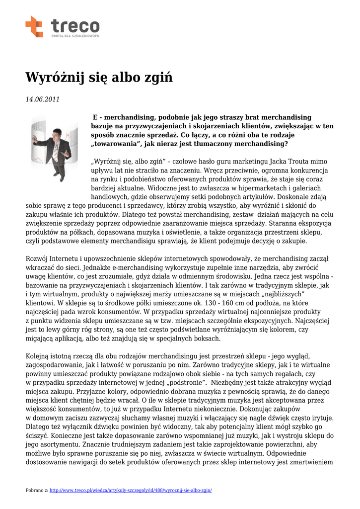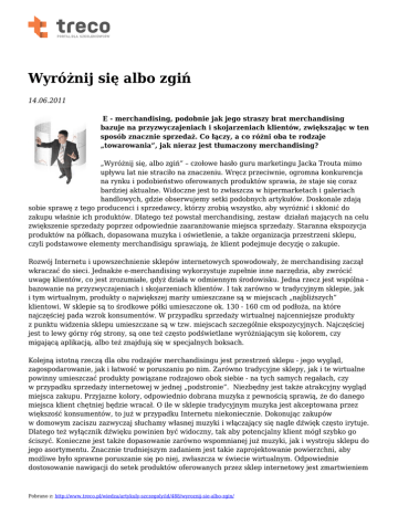 Wyróżnij się albo zgiń 14.06.2011 E - merchandising, podobnie jak jego straszy brat merchandising bazuje na przyzwyczajeniach i skojarzeniach klientów, zwiększając w ten sposób znacznie sprzedaż. Co łączy, a co różni oba te rodzaje „towarowania”, jak nieraz jest tłumaczony merchandising? „Wyróżnij się, albo zgiń” – czołowe hasło guru marketingu Jacka Trouta mimo upływu lat nie straciło na znaczeniu. Wręcz przeciwnie, ogromna konkurencja na rynku i podobieństwo oferowanych produktów sprawia, że staje się coraz bardziej aktualne. Widoczne jest to zwłaszcza w hipermarketach i galeriach handlowych, gdzie obserwujemy setki podobnych artykułów. Doskonale zdają sobie sprawę z tego producenci i sprzedawcy, którzy zrobią wszystko, aby wyróżnić i skłonić do zakupu właśnie ich produktów. Dlatego też powstał merchandising, zestaw działań mających na celu zwiększenie sprzedaży poprzez odpowiednie zaaranżowanie miejsca sprzedaży. Staranna ekspozycja produktów na półkach, dopasowana muzyka i oświetlenie, a także organizacja przestrzeni sklepu, czyli podstawowe elementy merchandisigu sprawiają, że klient podejmuje decyzję o zakupie. Rozwój Internetu i upowszechnienie sklepów internetowych spowodowały, że merchandising zaczął wkraczać do sieci. Jednakże e-merchandising wykorzystuje zupełnie inne narzędzia, aby zwrócić uwagę klientów, co jest zrozumiałe, gdyż działa w odmiennym środowisku. Jedna rzecz jest wspólna bazowanie na przyzwyczajeniach i skojarzeniach klientów. I tak zarówno w tradycyjnym sklepie, jak i tym wirtualnym, produkty o największej marży umieszczane są w miejscach „najbliższych” klientowi. W sklepie są to środkowe półki umieszczone ok. 130 - 160 cm od podłoża, na które najczęściej pada wzrok konsumentów. W przypadku sprzedaży wirtualnej najcenniejsze produkty z punktu widzenia sklepu umieszczane są w tzw. miejscach szczególnie ekspozycyjnych. Najczęściej jest to lewy górny róg strony, są one też często podświetlane wyróżniającym się kolorem, czy migającą aplikacją, albo też znajdują się w specjalnych boksach. Kolejną istotną rzeczą dla obu rodzajów merchandisingu jest przestrzeń sklepu - jego wygląd, zagospodarowanie, jak i łatwość w poruszaniu po nim. Zarówno tradycyjne sklepy, jak i te wirtualne powinny umieszczać produkty powiązane rodzajowo obok siebie - na tych samych regałach, czy w przypadku sprzedaży internetowej w jednej „podstronie”. Niezbędny jest także atrakcyjny wygląd miejsca zakupu. Przyjazne kolory, odpowiednio dobrana muzyka z pewnością sprawią, że do danego miejsca klient chętniej będzie wracał. O ile w sklepie tradycyjnym muzyka jest akceptowana przez większość konsumentów, to już w przypadku Internetu niekoniecznie. Dokonując zakupów w domowym zaciszu zazwyczaj słuchamy własnej muzyki i włączający się nagle dźwięk często irytuje. Dlatego też wyłącznik dźwięku powinien być widoczny, tak aby potencjalny klient mógł szybko go ściszyć. Konieczne jest także dopasowanie zarówno wspomnianej już muzyki, jak i wystroju sklepu do jego asortymentu. Znacznie trudniejszym zadaniem jest takie zaprojektowanie powierzchni, aby możliwe było sprawne poruszanie się po niej, zwłaszcza w świecie wirtualnym. Odpowiednie dostosowanie nawigacji do setek produktów oferowanych przez sklep internetowy jest zmartwieniem Pobrano z: http://www.treco.pl/wiedza/artykuly-szczegoly/id/488/wyroznij-sie-albo-zgin/ niejednego przedsiębiorstwa decydującego się na tę formę sprzedaży. Poruszanie się po stronie ułatwia zastosowanie sortowania produktów wg określonych kategorii, które jest bardzo chętnie wykorzystywane przez klientów. Przewagą sklepu internetowego nad tradycyjnym jest to, że możemy „zapamiętać” klienta, jego zakupy, preferencje co do produktów, zapłaty i wysyłki To procentuje podczas kolejnej jego wizyty, podczas której możemy zaproponować danemu klientowi podobne produkty i sposób zakupu. Możemy także w przypadku nowości z segmentu danych produktów wysłać do niego maila z wyróżnioną ofertą. Takie działania zdecydowanie przybliżą odbiorcy wybrany sklep wirtualny. Bez wątpienia warto inwestować w merchandising, zarówno w ten tradycyjny, jak i w ujęciu internetowym. Sprawnie zastosowany może zwiększyć sprzedaż nawet o kilkadziesiąt procent. Trzeba jednak ostrożnie posługiwać się tymi narzędziami, gdyż „wirtualni” nabywcy stają się coraz bardziej wymagający. Zmiana sklepu internetowego to dla takiego klienta kilkanaście sekund, w przeciwieństwie do tradycyjnego sklepu. IPO Sp. z o.o. Źródło: http://sprzedaz.nf.pl/Artykul/11107/E-merchandising-w-natarciu/merchandising-promocja-produktow / Ocena: 0/6 Pobrano z: http://www.treco.pl/wiedza/artykuly-szczegoly/id/488/wyroznij-sie-albo-zgin/
