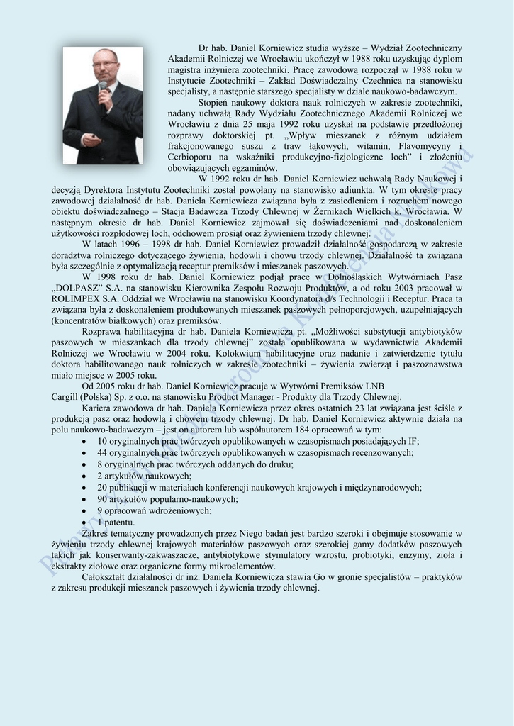 Dr hab. Daniel Korniewicz studia wyższe – Wydział Zootechniczny Akademii Rolniczej we Wrocławiu ukończył w 1988 roku uzyskując dyplom magistra inżyniera zootechniki. Pracę zawodową rozpoczął w 1988 roku w Instytucie Zootechniki – Zakład Doświadczalny Czechnica na stanowisku specjalisty, a następnie starszego specjalisty w dziale naukowo-badawczym. Stopień naukowy doktora nauk rolniczych w zakresie zootechniki, nadany uchwałą Rady Wydziału Zootechnicznego Akademii Rolniczej we Wrocławiu z dnia 25 maja 1992 roku uzyskał na podstawie przedłożonej rozprawy doktorskiej pt. „Wpływ mieszanek z różnym udziałem frakcjonowanego suszu z traw łąkowych, witamin, Flavomycyny i Cerbioporu na wskaźniki produkcyjno-fizjologiczne loch” i złożeniu obowiązujących egzaminów. W 1992 roku dr hab. Daniel Korniewicz uchwałą Rady Naukowej i decyzją Dyrektora Instytutu Zootechniki został powołany na stanowisko adiunkta. W tym okresie pracy zawodowej działalność dr hab. Daniela Korniewicza związana była z zasiedleniem i rozruchem nowego obiektu doświadczalnego – Stacja Badawcza Trzody Chlewnej w Żernikach Wielkich k. Wrocławia. W następnym okresie dr hab. Daniel Korniewicz zajmował się doświadczeniami nad doskonaleniem użytkowości rozpłodowej loch, odchowem prosiąt oraz żywieniem trzody chlewnej. W latach 1996 – 1998 dr hab. Daniel Korniewicz prowadził działalność gospodarczą w zakresie doradztwa rolniczego dotyczącego żywienia, hodowli i chowu trzody chlewnej. Działalność ta związana była szczególnie z optymalizacją receptur premiksów i mieszanek paszowych. W 1998 roku dr hab. Daniel Korniewicz podjął pracę w Dolnośląskich Wytwórniach Pasz „DOLPASZ” S.A. na stanowisku Kierownika Zespołu Rozwoju Produktów, a od roku 2003 pracował w ROLIMPEX S.A. Oddział we Wrocławiu na stanowisku Koordynatora d/s Technologii i Receptur. Praca ta związana była z doskonaleniem produkowanych mieszanek paszowych pełnoporcjowych, uzupełniających (koncentratów białkowych) oraz premiksów. Rozprawa habilitacyjna dr hab. Daniela Korniewicza pt. „Możliwości substytucji antybiotyków paszowych w mieszankach dla trzody chlewnej” została opublikowana w wydawnictwie Akademii Rolniczej we Wrocławiu w 2004 roku. Kolokwium habilitacyjne oraz nadanie i zatwierdzenie tytułu doktora habilitowanego nauk rolniczych w zakresie zootechniki – żywienia zwierząt i paszoznawstwa miało miejsce w 2005 roku. Od 2005 roku dr hab. Daniel Korniewicz pracuje w Wytwórni Premiksów LNB Cargill (Polska) Sp. z o.o. na stanowisku Product Manager - Produkty dla Trzody Chlewnej. Kariera zawodowa dr hab. Daniela Korniewicza przez okres ostatnich 23 lat związana jest ściśle z produkcją pasz oraz hodowlą i chowem trzody chlewnej. Dr hab. Daniel Korniewicz aktywnie działa na polu naukowo-badawczym – jest on autorem lub współautorem 184 opracowań w tym: 10 oryginalnych prac twórczych opublikowanych w czasopismach posiadających IF; 44 oryginalnych prac twórczych opublikowanych w czasopismach recenzowanych; 8 oryginalnych prac twórczych oddanych do druku; 2 artykułów naukowych; 20 publikacji w materiałach konferencji naukowych krajowych i międzynarodowych; 90 artykułów popularno-naukowych; 9 opracowań wdrożeniowych; 1 patentu. Zakres tematyczny prowadzonych przez Niego badań jest bardzo szeroki i obejmuje stosowanie w żywieniu trzody chlewnej krajowych materiałów paszowych oraz szerokiej gamy dodatków paszowych takich jak konserwanty-zakwaszacze, antybiotykowe stymulatory wzrostu, probiotyki, enzymy, zioła i ekstrakty ziołowe oraz organiczne formy mikroelementów. Całokształt działalności dr inż. Daniela Korniewicza stawia Go w gronie specjalistów – praktyków z zakresu produkcji mieszanek paszowych i żywienia trzody chlewnej.
