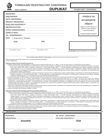 FORMULARZ REJESTRACYJNY ZAWODNIKA DUPLIKAT Dane osobowe NUMER IDENT. ZAWODNIKA NAZWISKO: ……………………………………………………………………………………………………………..………………………………………………..…………… IMIĘ/IMIONA: ………………………………………………………………………………………………….………………………………………………..……….……… DATA URODZENIA: ………………………………………………………………………..……………………………………………………..……….…………… MIEJSCE URODZENIA: ……………………………………………………………..………………………………………………………………….……….…. PESEL/NR PASZPORTU*: ………………………………………………………………………………………………….…………………….…….…….. OBYWATELSTWO: …………………………………………………………………………………………………………………….………………….………….….. ADRES ZAMIESZKANIA: ………………………………………………………………………………………………….……………………..…..…………. ADRES E-MAIL: ………………………………………………………………………………………………..……………………………………………….…….….…….. TEL. KOMÓRKOWY: ………………………………………………………………….………………..……………………………………………..……….……….. PŁEĆ: mężczyzna kobieta Klub ZPN ………………………………………. ……………..………………………………. Data, podpis(y), i pieczęć miejsce na przyklejenie zdjęcia (zdjęcie musi być opisane na odwrocie: imię, nazwisko i numer formularza) Prosimy nie używać zszywacza! Data, podpis(y), i pieczęć Czytelny podpis zawodnika składającego wniosek o wydanie karty ………………………………………………………………………………………………………………………………………………………………………………………………………………………………………………………… Imiona i nazwiska, numery telefonów i czytelne podpisy przedstawicieli ustawowych dla zawodników niepełnoletnich** *Numer paszportu wpisuje tylko osoba, która nie posiada obywatelstwa polskiego **Punkt 7 Regulaminu Podpisując niniejszy formularz Zawodnik oświadcza, że: zgodnie z treścią ustawy z dnia 29.08.1997 r. o ochronie danych osobowych (tekst jedn. Dz. U. z 2002 r., Nr 101, poz. 926, z późn. zm.), dobrowolnie wyraża zgodę na: a) umieszczenie swoich danych osobowych w elektronicznym systemie ewidencji klubów i zawodników oraz na przetwarzanie swoich danych osobowych zawartych w formularzu przez Polski Związek Piłki Nożnej z siedzibą w Warszawie, ul. Bitwy Warszawskiej 1920 r. 7, 02-366 Warszawa, przekazywanie tych danych osobowych podmiotom współpracującym z nim, a w szczególności klubom sportowym korzystającym z elektronicznego systemu ewidencji klubów i zawodników, członkom Polskiego Związku Piłki Nożnej, podmiotom zarządzającym rozgrywkami sportowymi, w celu umożliwienia obsługi elektronicznego systemu ewidencji klubów i zawodników oraz zapewnienia jego funkcjonalności zgodnie z regulaminem, b) przetwarzanie swoich danych osobowych zawartych w formularzu i umieszczonych w elektronicznym systemie ewidencji klubów i zawodników przez Polski Związek Piłki Nożnej z siedzibą w Warszawie, ul. Bitwy Warszawskiej 1920 r. 7, 02-366 Warszawa, w celach reklamowych, promocyjnych i marketingowych, przekazywanie tych danych osobowych podmiotom współpracującym z nim, w szczególności sponsorom Polskiego Związku Piłki Nożnej, został poinformowany o prawie dostępu do treści jego danych osobowych, prawie ich poprawiania oraz o dobrowolności podania przez siebie danych osobowych, wyraża, na podstawie art. 81 ust. 1 ustawy z dnia 4.02.1994 r. o prawie autorskim i prawach pokrewnych (tekst jedn. Dz. U. z 2006 r., Nr 90, poz. 631, z późn. zm.), zgodę na wykorzystanie, w tym powielanie i rozpowszechnianie, swojego wizerunku, utrwalonego na fotografii załączonej do niniejszego formularza przez Polski Związek Piłki Nożnej z siedzibą w Warszawie, ul. Bitwy Warszawskiej 1920 r. 7, 02-366 Warszawa, w związku z jego działalnością statutową, w szczególności poprzez jego publikację na stronach internetowych Polskiego Związki Piłki Nożnej, w związku z jego działalnością statutową oraz koniecznością umożliwienia obsługi elektronicznego systemu ewidencji klubów i zawodników oraz zapewnienia jego funkcjonalności zgodnie z regulaminem. zapoznał się z regulaminem dotyczącym rejestracji w elektronicznym systemie ewidencji klubów i zawodników oraz wydawania elektronicznych kart identyfikacyjnych, dostępnym na stronie http://zawodnicy.pzpn.pl i akceptuje treść jego postanowień, podane w formularzu dane osobowe są zgodne z prawdą. Podpisując niniejszy formularz przedstawiciel ustawowy Zawodnika oświadcza, że: zgodnie z treścią ustawy z dnia 29.08.1997 r. o ochronie danych osobowych (tekst jedn. Dz. U. z 2002 r., Nr 101, poz. 926, z późn. zm.), dobrowolnie wyraża zgodę na: a) umieszczenie danych osobowych Zawodnika w elektronicznym systemie ewidencji klubów i zawodników oraz na przetwarzanie jego danych osobowych zawartych w formularzu przez Polski Związek Piłki Nożnej z siedzibą w Warszawie, ul. Bitwy Warszawskiej 1920 r. 7, 02-366 Warszawa, przekazywanie tych danych osobowych podmiotom współpracującym z nim, a w szczególności klubom sportowym korzystającym z elektronicznego systemu
